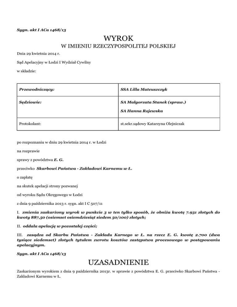 Sygn. akt I ACa 1468/13 WYROK W IMIENIU RZECZYPOSPOLITEJ POLSKIEJ Dnia 29 kwietnia 2014 r. Sąd Apelacyjny w Łodzi I Wydział Cywilny w składzie: Przewodniczący: SSA Lilla Mateuszczyk Sędziowie: SA Małgorzata Stanek (spraw.) SA Hanna Rojewska Protokolant: st.sekr.sądowy Katarzyna Olejniczak po rozpoznaniu w dniu 29 kwietnia 2014 r. w Łodzi na rozprawie sprawy z powództwa E. G. przeciwko Skarbowi Państwa - Zakładowi Karnemu w Ł. o zapłatę na skutek apelacji strony pozwanej od wyroku Sądu Okręgowego w Łodzi z dnia 9 października 2013 r. sygn. akt I C 507/11 I. zmienia zaskarżony wyrok w punkcie 3 w ten tylko sposób, że obniża kwotę 7.931 złotych do kwoty 887,50 (osiemset osiemdziesiąt siedem 50/100) złotych; II. oddala apelację w pozostałej części; III. zasądza od Skarbu Państwa - Zakładu Karnego w Ł. na rzecz E. G. kwotę 2.700 (dwa tysiące siedemset) złotych tytułem zwrotu kosztów zastępstwa procesowego w postępowaniu apelacyjnym. Sygn. akt I ACa 1468/13 UZASADNIENIE Zaskarżonym wyrokiem z dnia 9 października 2013r. w sprawie z powództwa E. G. przeciwko Skarbowi Państwa Zakładowi Karnemu w Ł. 0 zapłatę, Sąd Okręgowy w Łodzi zasądził od Skarbu Państwa - Zakładu Karnego w Ł. na rzecz E. G. kwotę 140.000 złotych tytułem zadośćuczynienia z ustawowymi odsetkami od dnia 13 maja 201 lr. do dnia zapłaty oraz kwotę 450 złotych tytułem odszkodowania z ustawowymi odsetkami od dnia 9 października 2013r. do dnia zapłaty, a także kwotę po 50 złotych miesięcznie tytułem renty na zwiększone potrzeby, płatną do dnia 10-ego każdego miesiąca, poczynając od października 2013r., z ustawowymi odsetkami w razie uchybienia terminowi płatności każdej raty oraz kwotę 1.224 złotych tytułem częściowego zwrotu kosztów procesu, w tym kwotę 612 złotych tytułem części kosztów nieopłaconej pomocy prawnej udzielonej powodowi z urzędu i oddalił powództwo w pozostałej części, nakazując pobrać od Skarbu Państwa - Zakładu Karnego w Ł. na rzecz Skarbu Państwa - Sądu Okręgowego w Łodzi kwotę 7.931 złotych tytułem nieuiszczonych kosztów sądowych od uwzględnionej części powództwa, a także nakazując ściągnąć od powoda z zasądzonego w punkcie 1 a) roszczenia na rzecz Skarbu Państwa - Sądu Okręgowego w Łodzi kwotę 3.906 złotych tytułem nieuiszczonych kosztów sądowych od oddalonej części powództwa. Powyższy wyrok zapadł na podstawie poczynionych przez Sąd Okręgowy ustaleń faktycznych, z których wynika, że w marcu 201 lr. powód odbywał karę pozbawienia wolności w Zakładzie Karnym w Ł. za przestępstwa z art. 178a § 1, art. 244 i art. 207 § 1 k.k. Nie stwarzał problemów wychowawczych, w gronie współosadzonych funkcjonował właściwie, nie akceptował zasad podkultury przestępczej. Przebywał w celi w izbie chorych z W. O., osadzonym w związku z orzeczoną zastępczą karą pozbawienia wolności za przestępstwo z art. 286 § 1 k.k., który również nie stwarzał problemów wychowawczych, w gronie współosadzonych funkcjonował właściwie i nie akceptował zasad podkultury przestępczej. W dniu 12 marca 201 lr. w Zakładzie Karnym w Ł. został osadzony mężczyzna o nieustalonej tożsamości, tymczasowo aresztowany pod zarzutem z art. 280 § 1 i art. 13 § 1 w zw. z art. 267 § 1 k.k., tj. o użycie przemocy wobec mężczyzny w postaci wyciągnięcia go z samochodu i przewrócenia oraz usiłowanie dokonania zaboru samochodu osobowego w celu przywłaszczenia. Badanie lekarskie tego mężczyzny przed umieszczeniem w celi przeprowadził lekarz dyżurny A. B.. Badany był spokojny, ale wywiad był trudny z uwagi na zgłaszaną niepamięć. W ocenie badającej mężczyzna sprawiał wrażenie osoby nieporadnej życiowo, nie zdradzał objawów agresji i nie wyglądał na niebezpiecznego dla otoczenia. Badająca oceniła, że może być w warunkach izolacji potencjalną ofiarą. Aresztowany podał, że miał uraz głowy, na której miał bliznę i w związku z podejrzeniem padaczki został umieszczony na izbie chorych. Dyżurnemu wychowawcy penitencjarnemu - G. M., lekarka badająca nowoosadzonego zwróciła uwagę, że jest on pacjentem wymagającym obserwacji. Po badaniu lekarskim, wstępną rozmowę informacyjną z osadzonym przeprowadziła wychowawca G. M.. W ocenie wychowawcy, osoba ta również nie sprawiała wrażenia osoby niebezpiecznej, agresywnej. Osadzony wyglądał na osobę zagubioną, potencjalną ofiarę, gdyż w czasie rozmowy siedział skulony, ze spuszczoną głową, był nieśmiały. Mężczyzna był dobrze zbudowany. G. M. po rozmowie z osadzonym sporządziła notatkę urzędową, którą przekazała dowódcy zmiany. W notatce tej, wychowawca prosiła o „zwrócenie uwagi" na nowoprzybyłego, osadzonego na izbie chorych, informując że osadzony nie pamięta swoich danych personalnych, a stan taki trwa od 3 lat, po tym jak został pobity, jest bardzo ufny wobec łudzi. Prosiła nadto o „zwrócenie uwagi" na zachowanie osadzonego „w porze dziennej, nocnej oraz w czasie korzystania ze spaceru", a także o informowanie o „niepokojących zachowaniach" osadzonego. Mężczyzna został umieszczony w izbie chorych w celi, w której osadzony był powód oraz W. O.. W dniu 13 marca 201 lr. o godz. 18.55 oddziałowego J. B. zaalarmował sygnał dźwiękowy z celi nr 102, sygnał świetlny nad celą oraz głośne uderzenia w drzwi celi. Przed otwarciem celi funkcjonariusz spojrzał w wizjer i zobaczył W. O. z krwawiącą głową oraz powoda, który został uderzony taboretem przez osadzonego o nieustalonej tożsamości. Funkcjonariusz otworzył drzwi celi i obezwładnił napastnika, który został następnie odizolowany. Przed obezwładnieniem napastnika, zdążył on pobić powoda oraz W. O.. Powód został kilka razy uderzony taboretem. (...) udzielono pomocy przedmedycznej i wezwano pogotowie ratunkowe. Powód został skierowany do Szpitala im. (...), gdzie zosta
