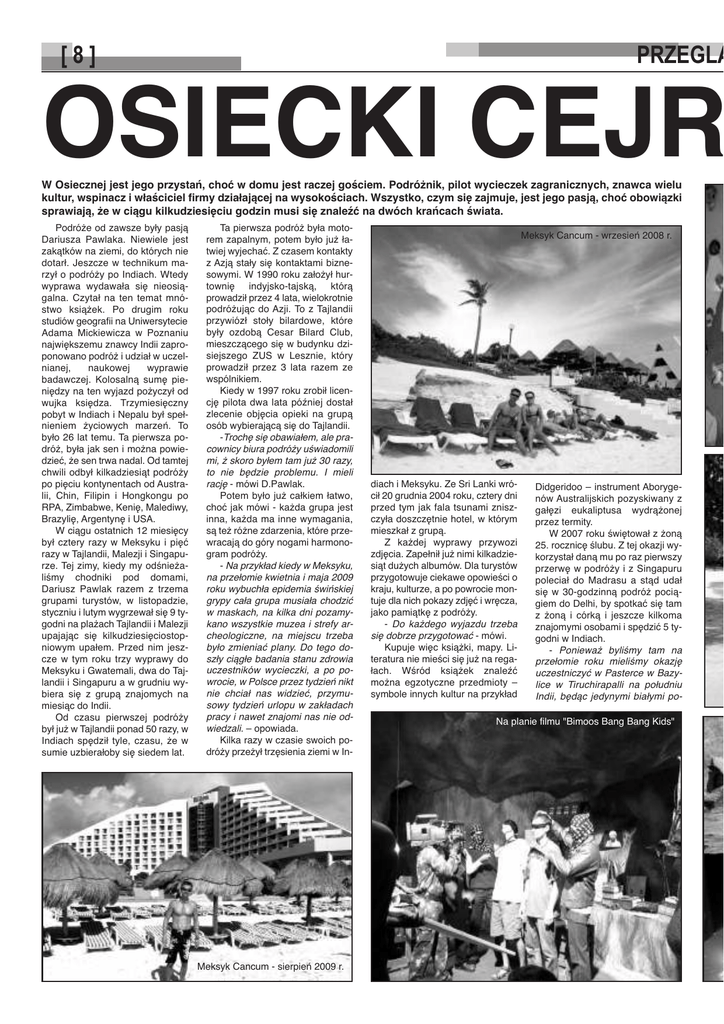 OSIECKI CEJR [8] PRZEGLĄ W Osiecznej jest jego przystań, choć w domu jest raczej gościem. Podróżnik, pilot wycieczek zagranicznych, znawca wielu kultur, wspinacz i właściciel firmy działającej na wysokościach. Wszystko, czym się zajmuje, jest jego pasją, choć obowiązki sprawiają, że w ciągu kilkudziesięciu godzin musi się znaleźć na dwóch krańcach świata. Podróże od zawsze były pasją Dariusza Pawlaka. Niewiele jest zakątków na ziemi, do których nie dotarł. Jeszcze w technikum marzył o podróży po Indiach. Wtedy wyprawa wydawała się nieosiągalna. Czytał na ten temat mnóstwo książek. Po drugim roku studiów geografii na Uniwersytecie Adama Mickiewicza w Poznaniu największemu znawcy Indii zaproponowano podróż i udział w uczelnianej, naukowej wyprawie badawczej. Kolosalną sumę pieniędzy na ten wyjazd pożyczył od wujka księdza. Trzymiesięczny pobyt w Indiach i Nepalu był spełnieniem życiowych marzeń. To było 26 lat temu. Ta pierwsza podróż, była jak sen i można powiedzieć, że sen trwa nadal. Od tamtej chwili odbył kilkadziesiąt podróży po pięciu kontynentach od Australii, Chin, Filipin i Hongkongu po RPA, Zimbabwe, Kenię, Malediwy, Brazylię, Argentynę i USA. W ciągu ostatnich 12 miesięcy był cztery razy w Meksyku i pięć razy w Tajlandii, Malezji i Singapurze. Tej zimy, kiedy my odśnieżaliśmy chodniki pod domami, Dariusz Pawlak razem z trzema grupami turystów, w listopadzie, styczniu i lutym wygrzewał się 9 tygodni na plażach Tajlandii i Malezji upajając się kilkudziesięciostopniowym upałem. Przed nim jeszcze w tym roku trzy wyprawy do Meksyku i Gwatemali, dwa do Tajlandii i Singapuru a w grudniu wybiera się z grupą znajomych na miesiąc do Indii. Od czasu pierwszej podróży był już w Tajlandii ponad 50 razy, w Indiach spędził tyle, czasu, że w sumie uzbierałoby się siedem lat. Ta pierwsza podróż była motorem zapalnym, potem było już łatwiej wyjechać. Z czasem kontakty z Azją stały się kontaktami biznesowymi. W 1990 roku założył hurtownię indyjsko-tajską, którą prowadził przez 4 lata, wielokrotnie podróżując do Azji. To z Tajlandii przywiózł stoły bilardowe, które były ozdobą Cesar Bilard Club, mieszczącego się w budynku dzisiejszego ZUS w Lesznie, który prowadził przez 3 lata razem ze wspólnikiem. Kiedy w 1997 roku zrobił licencję pilota dwa lata później dostał zlecenie objęcia opieki na grupą osób wybierającą się do Tajlandii. -Trochę się obawiałem, ale pracownicy biura podróży uświadomili mi, ż skoro byłem tam już 30 razy, to nie będzie problemu. I mieli rację - mówi D.Pawlak. Potem było już całkiem łatwo, choć jak mówi - każda grupa jest inna, każda ma inne wymagania, są też różne zdarzenia, które przewracają do góry nogami harmonogram podróży. - Na przykład kiedy w Meksyku, na przełomie kwietnia i maja 2009 roku wybuchła epidemia świńskiej grypy cała grupa musiała chodzić w maskach, na kilka dni pozamykano wszystkie muzea i strefy archeologiczne, na miejscu trzeba było zmieniać plany. Do tego doszły ciągłe badania stanu zdrowia uczestników wycieczki, a po powrocie, w Polsce przez tydzień nikt nie chciał nas widzieć, przymusowy tydzień urlopu w zakładach pracy i nawet znajomi nas nie odwiedzali. – opowiada. Kilka razy w czasie swoich podróży przeżył trzęsienia ziemi w In- Meksyk Cancum - sierpień 2009 r. Meksyk Cancum - wrzesień 2008 r. diach i Meksyku. Ze Sri Lanki wrócił 20 grudnia 2004 roku, cztery dni przed tym jak fala tsunami zniszczyła doszczętnie hotel, w którym mieszkał z grupą. Z każdej wyprawy przywozi zdjęcia. Zapełnił już nimi kilkadziesiąt dużych albumów. Dla turystów przygotowuje ciekawe opowieści o kraju, kulturze, a po powrocie montuje dla nich pokazy zdjęć i wręcza, jako pamiątkę z podróży. - Do każdego wyjazdu trzeba się dobrze przygotować - mówi. Kupuje więc książki, mapy. Literatura nie mieści się już na regałach. Wśród książek znaleźć można egzotyczne przedmioty – symbole innych kultur na przykład Didgeridoo – instrument Aborygenów Australijskich pozyskiwany z gałęzi eukaliptusa wydrążonej przez termity. W 2007 roku świętował z żoną 25. rocznicę ślubu. Z tej okazji wykorzystał daną mu po raz pierwszy przerwę w podróży i z Singapuru poleciał do Madrasu a stąd udał się w 30-godzinną podróż pociągiem do Delhi, by spotkać się tam z żoną i córką i jeszcze kilkoma znajomymi osobami i spędzić 5 tygodni w Indiach. - Ponieważ byliśmy tam na przełomie roku mieliśmy okazję uczestniczyć w Pasterce w Bazylice w Tiruchirapalli na południu Indii, będąc jedynymi białymi po- Na planie filmu "Bimoos Bang Bang Kids"