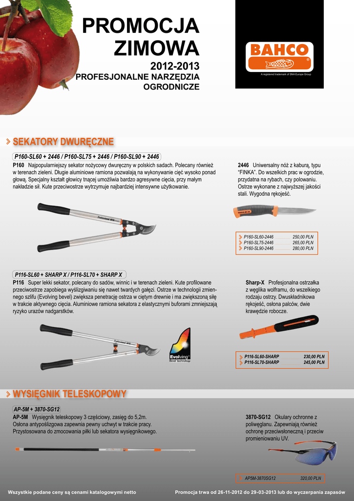 Promocja zimowa 2012-2013 Profesjonalne narzędzia ogrodnicze A registered trademark of SNA Europe Group SEKATORY DWURĘCZNE P160-SL60 + 2446 / P160-SL75 + 2446 / P160-SL90 + 2446 P160 Najpopularniejszy sekator nożycowy dwuręczny w polskich sadach. Polecany również w terenach zieleni. Długie aluminiowe ramiona pozwalają na wykonywanie cięć wysoko ponad głową. Specjalny kształt głowicy tnącej umożliwia bardzo agresywne cięcia, przy małym nakładzie sił. Kute przeciwostrze wytrzymuje najbardziej intensywne użytkowanie. 2446 Uniwersalny nóż z kaburą, typu “FINKA”. Do wszelkich prac w ogrodzie, przydatna na rybach, czy polowaniu. Ostrze wykonane z najwyższej jakości stali. Wygodna rękojeść. P160-SL60-2446 P160-SL75-2446 P160-SL90-2446 P116-SL60 + SHARP X / P116-SL70 + SHARP X P116 Super lekki sekator, polecany do sadów, winnic i w terenach zieleni. Kute profilowane przeciwostrze zapobiega wyślizgiwaniu się nawet twardych gałęzi. Ostrze w technologii zmiennego szlifu (Evolving bevel) zwiększa penetrację ostrza w ciętym drewnie i ma zwiększoną siłę w trakcie aktywnego cięcia. Aluminiowe ramiona sekatora z elastycznymi buforami zmniejszają ryzyko urazów nadgarstków. 250,00 PLN 265,00 PLN 280,00 PLN Sharp-X Profesjonalna ostrzałka z węglika wolframu, do wszelkiego rodzaju ostrzy. Dwuskładnikowa rękojeść, osłona palców, dwie krawędzie robocze. P116-SL60-SHARP P116-SL70-SHARP 230,00 PLN 245,00 PLN WYSIĘGNIK TELESKOPOWY AP-5M + 3870-SG12 AP-5M Wysięgnik teleskopowy 3 częściowy, zasięg do 5,2m. Osłona antypoślizgowa zapewnia pewny uchwyt w trakcie pracy. Przystosowana do zmocowania piłki lub sekatora wysięgnikowego. 3870-SG12 Okulary ochronne z poliwęglanu. Zapewniają również ochronę przeciwsłoneczną i przeciw promieniowaniu UV. AP5M-3870SG12 Wszystkie podane ceny są cenami katalogowymi netto 320,00 PLN Promocja trwa od 26-11-2012 do 29-03-2013 lub do wyczerpania zapasów PIŁKI SADOWNICZE 4212-11-6T + P128-19 4212-11-6T Piłka sadownicza typu ”lisi ogon” z drewnianą profilowaną rękojeścią. Do wszelkich prac w sadach i w terenach zieleni. 396-HP + P128-19 396-HP Piłka sadownicza składana z uzębieniem XT. Jest to unikalny typ uzębienia uniwersalnego z zębami o zróżnicowanym kształcie. Co trzeci ząb jest krótszy i mocniej rozwiedziony. Dwukomponentowa rękojeść. Blokada ostrza w 2 pozycjach. Zalecana do drewna twardego. 396-JS + P128-19 396-JS Piłka sadownicza składana z agre-sywnym uzębieniem JS do szybkiego cięcia drobnych gałązi. Dwukomponentowa rękojeść. Blokada ostrza w 2 pozycjach. Do wszelkich prac w sadach i w terenach zieleni. 5124-JS-H + P128-19 5124-JS-H Profesjonalna piłka sadownicza do szybkiego cięcia żywych pędów. Innowacyjny kształt zębów JS i profil ostrza pozostawiają gładką powierzchnię cięcia. Ergonomiczna dwukomponentowa rękojeść wpływa na komfort pracy i zapobiega wyślizgiwaniu się z dłoni. Ostrza dostępne jako części zamienne. Opatentowana kabura ułatwia szybkie wyjmowanie i wkładanie piłki. P128-19 Lekkie nożyczki sadownicze do przerzedzania zawiązków i innych prac ogrodniczych. Długie i cienkie ostrza umożliwiają cięcia w miejscach trudnodostępnych przy maksymalnym rozwarciu 35mm. Profilowane wygodne rękojeści wykonane z włókna szklanego. 4212-P128-19 396HP-P128-19 396JS-P128-19 5124JSH-P128-19 97,00 PLN 100,00 PLN 128,00 PLN 145,00 PLN SIEKIERY FGS-1.6-810 + SES-2395 FGS-1.6-810 Tradycyjna siekiera zarówno do ścinania jak i rozłupywania. Otwór w rękojeści Ø 8mm do przechowywania. Ostrze chronione osłonką. SES-2395 Rękawice robocze do wszelkich prac gospodarczych i warsztatowych. LS-MERLIN-2395 FGS1.6-810-2395 155,00 PLN 115,00 PLN PRU-1082-POL LS-MERLIN-2.5FG + SES-2395 LS-MERLIN-2,5FG Ciężka siekiera do rozłupywania pni. Trzonek z włókna szklanego, rękojeść poktryta masą antypoślizgową dla pewnego uchwytu. Otwór w rękojeści Ø 8mm do przechowywania. Ostrze chronione skórzaną osłonką. Pieczęć dystybutora SNA EUROPE Poland Sp. z o.o. ul. Marynarska 15, 02-674 Warszawa tel.(22) 607 05 01, fax.(22) 607 05 21 [email protected], www.bahco.com