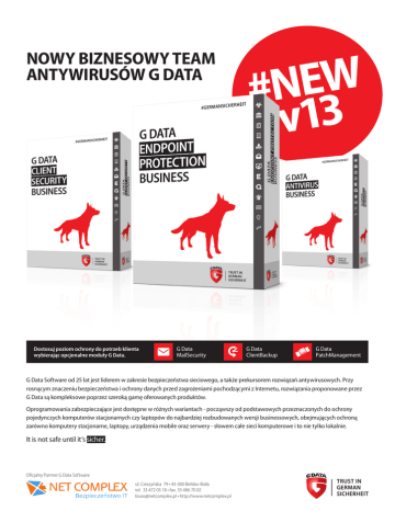 NOWY BIZNESOWY TEAM ANTYWIRUSÓW G DATA Dostosuj poziom ochrony do potrzeb klienta wybierając opcjonalne moduły G Data. G Data MailSecurity W E N # 3 v1 G Data ClientBackup G Data PatchManagement G Data Software od 25 lat jest liderem w zakresie bezpieczeństwa sieciowego, a także prekursorem rozwiązań antywirusowych. Przy rosnącym znaczeniu bezpieczeństwa i ochrony danych przed zagrożeniami pochodzącymi z Internetu, rozwiązania proponowane przez G Data są kompleksowe poprzez szeroką gamę oferowanych produktów. Oprogramowania zabezpieczające jest dostępne w różnych wariantach - począwszy od podstawowych przeznaczonych do ochrony pojedynczych komputerów stacjonarnych czy laptopów do najbardziej rozbudowanych wersji businessowych, obejmujących ochroną zarówno komputery stacjonarne, laptopy, urządzenia mobile oraz serwery - słowem całe sieci komputerowe i to nie tylko lokalnie. It is not safe until it’s sicher. Oficjalny Partner G Data Software ul. Cieszyńska 79 • 43-300 Bielsko-Biała tel. 33 472 03 18 • fax. 33 486 70 02 [email protected] • http://www.netcomplex.pl Doskonała ochrona serwerów i stacji roboczych Anti Virus Client Security Endpoint Protection Small Business Technologia hybrydowa CloseGap najlepsza ochrona dzięki ochronie proaktywnej oraz maksymalnie aktualnym bazom sygnatur G Data BankGuard 2.0 bezpieczna bankowość bez potrzeby instalowania zbędnych dodatków do przeglądarki Kontrola zachowania obrona przed nieznanymi zagrożeniami, szkodnikami, wirusami Antywirus dla Linuxa ochrona stacji roboczych z systemem Linux w sieci firmowej Antywirus i antyspam poczty wtyczka do Microsoft Outlook oraz ochrona kont POP3 i IMAP Wydajny firewall monitoruje wszelkie połączenia przychodzące i wychodzące. Chroni przed atakami DoS, skanowaniem portów itp. Centralne zarządzanie Prosta administracja i przejrzysty interfejs zdalne instalacje, skanowanie i zarządzanie klientami w sieci Raport instalacji status oraz historia dotychczasowych instalacji Zaprojektowany na nowo dashboard intuicyjne okno do przeglądu wszelkich istotnych informacji o systemie wraz z podpowiedziami kontekstowymi Zdalne administrowanie zarządzaj siecią z okna przeglądarki na urządzeniu mobilnym korzystając z zabezpieczonego połączenia Synchronizacja z Active Directory odwzorowanie struktury organizacyjnej i automatyczna instalacja klientów Mobile Device Management centralne zarządzenie urządzeniami mobilnymi z Androidem w sieci firmowej - funkcje antykradzieżowe, kontrola instalowanych aplikacji, filtr połączeń Katalog sprzętu i oprogramowania zestawienie wykorzystywanych urządzeń i zainstalowanego oprogramowania w sieci firmowej Aktualizacje i pomoc techniczna darmowa aktualizacja do najnowszej wersji programu w ramach licencji oraz polskojęzyczna pomoc techniczna na wypadek kłopotów Kontrola urządzeń określa zasady dostępu do napędów USB, kart pamięci, napędów optycznych czy kamer internetowych Kontrola aplikacji do ustalenia odgórnych zasad instalowania i korzystania z oprogramowania w sieci przedsiębiorstwa Kontrola dostępu do internetu możliwość określenia ram czasowych korzystania z sieci w firmie Kontrola treści blokuje nieodpowiednie strony www centralny filtr spamu i zagrożeń (SMTP/POP3) dla dowolnego serwera poczty - Exchange, Domino itp. Zawiera plug-in dla MS Exchange od wersji 2007 do 2013 Centralne kopie zapasowe zabezpieczaj oraz zarządzaj danymi w sieci firmowej PatchManagement centralne zarządzanie aktualizacjami oprogramowania na stacjach klienckich Antywirus dla Mac kompleksowa ochrona dla komputerów z systemem Mac OS w Twojej sieci Wypróbuj G Data LiveView w swoim urządzeniu mobilnym bez instalacji! Login (serwer): localhost Uwierzytelnianie: Uwierzytelnianie zintegrowane User: demo • Pass: gdata dostępny MailSecurity opcjonalny Moduły opcjonalne