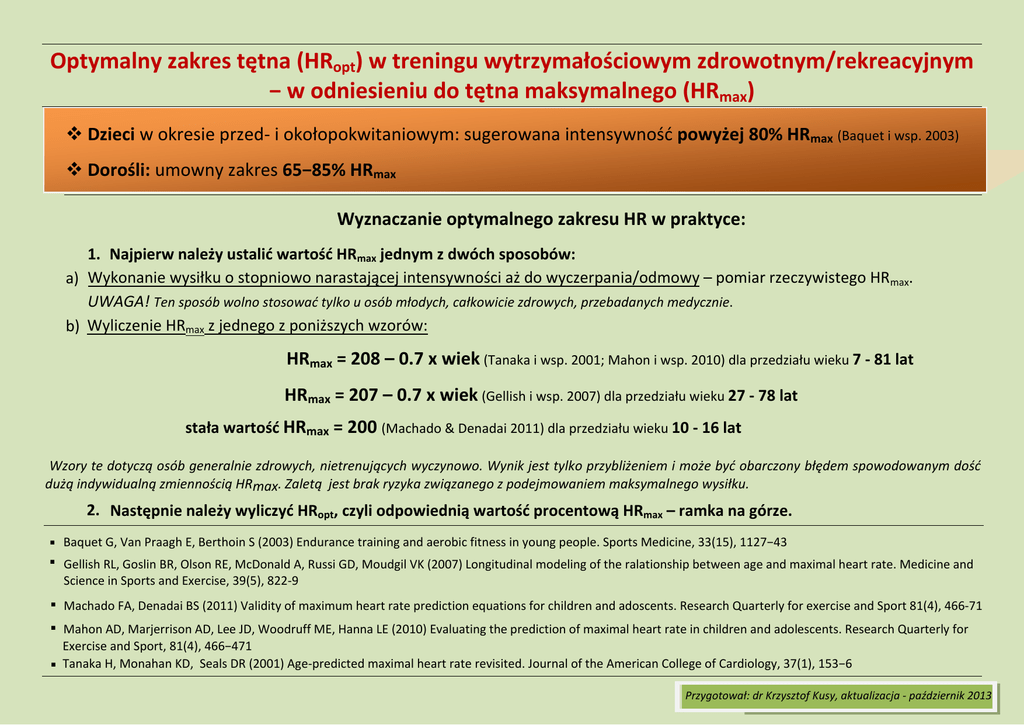 Optymalny zakres tętna (HRopt) w treningu wytrzymałościowym zdrowotnym/rekreacyjnym − w odniesieniu do tętna maksymalnego (HRmax) Dzieci w okresie przed- i okołopokwitaniowym: sugerowana intensywność powyżej 80% HRmax (Baquet i wsp. 2003) Dorośli: umowny zakres 65−85% HRmax Wyznaczanie optymalnego zakresu HR w praktyce: 1. Najpierw należy ustalić wartość HRmax jednym z dwóch sposobów: a) Wykonanie wysiłku o stopniowo narastającej intensywności aż do wyczerpania/odmowy – pomiar rzeczywistego HRmax. UWAGA! Ten sposób wolno stosować tylko u osób młodych, całkowicie zdrowych, przebadanych medycznie. b) Wyliczenie HRmax z jednego z poniższych wzorów: HRmax = 208 – 0.7 x wiek (Tanaka i wsp. 2001; Mahon i wsp. 2010) dla przedziału wieku 7 - 81 lat HRmax = 207 – 0.7 x wiek (Gellish i wsp. 2007) dla przedziału wieku 27 - 78 lat stała wartość HRmax = 200 (Machado & Denadai 2011) dla przedziału wieku 10 - 16 lat Wzory te dotyczą osób generalnie zdrowych, nietrenujących wyczynowo. Wynik jest tylko przybliżeniem i może być obarczony błędem spowodowanym dość dużą indywidualną zmiennością HRmax. Zaletą jest brak ryzyka związanego z podejmowaniem maksymalnego wysiłku. 2. Następnie należy wyliczyć HRopt, czyli odpowiednią wartość procentową HRmax – ramka na górze. Baquet G, Van Praagh E, Berthoin S (2003) Endurance training and aerobic fitness in young people. Sports Medicine, 33(15), 1127−43 Gellish RL, Goslin BR, Olson RE, McDonald A, Russi GD, Moudgil VK (2007) Longitudinal modeling of the ralationship between age and maximal heart rate. Medicine and Science in Sports and Exercise, 39(5), 822-9 Machado FA, Denadai BS (2011) Validity of maximum heart rate prediction equations for children and adoscents. Research Quarterly for exercise and Sport 81(4), 466-71 Mahon AD, Marjerrison AD, Lee JD, Woodruff ME, Hanna LE (2010) Evaluating the prediction of maximal heart rate in children and adolescents. Research Quarterly for Exercise and Sport, 81(4), 466−471 Tanaka H, Monahan KD, Seals DR (2001) Age-predicted maximal heart rate revisited. Journal of the American College of Cardiology, 37(1), 153−6 Przygotował: dr Krzysztof Kusy, aktualizacja - październik 2013