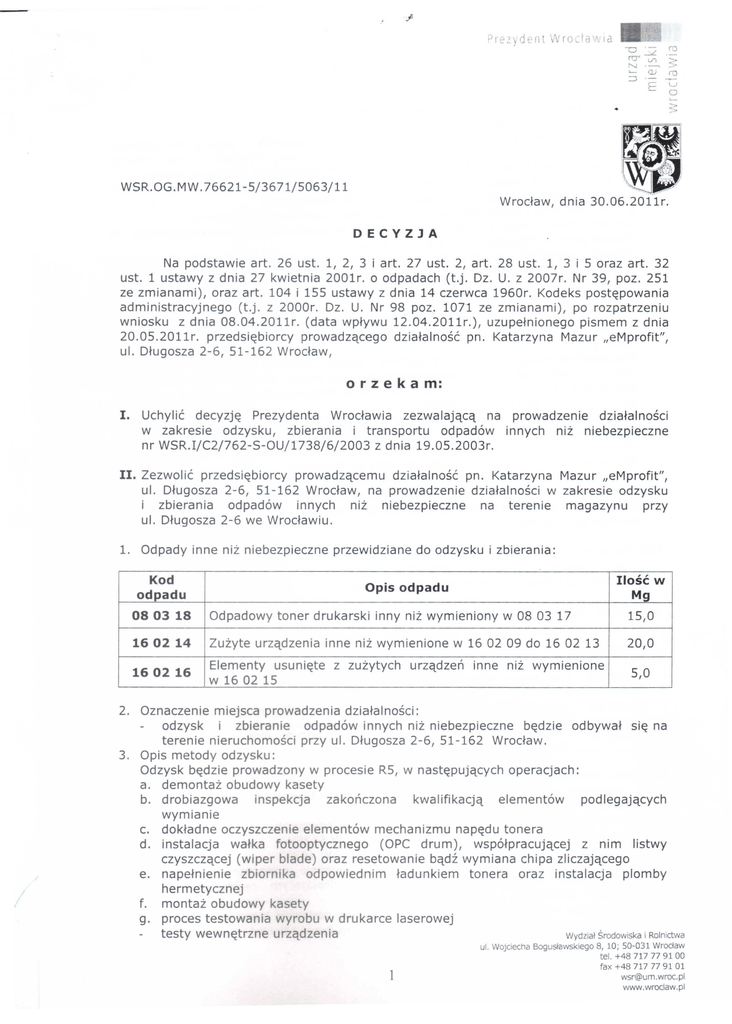 WSR.OG.MW.76621-5/3671/5063/11 ........... Wrodaw, dnia 30.06.2011r. DECYZJA Na podstawie art. 26 ust. 1, 2, 3 i art. 27 ust. 2, art. 28 ust. 1, 3 i 5 oraz art. 32 ust. 1 ustawy z dnia 27 kwietnia 2001r. 0 odpadach (t.j. Dz. U. z 2007r. Nr 39, poz. 251 ze zmianami), oraz art. 104 i 155 ustawy z dnia 14 czerwca 1960r. Kodeks post~powania administracyjnego (t.j. z 2000r. Dz. U. Nr 98 poz. 1071 ze zmianami), po rozpatrzeniu wniosku z dnia 08.04.2011r. (data wplywu 12.04.2011r.), uzupelnionego pismem z dnia 20.05.2011r. przedsi~biorcy prowadzqcego dzialalnosc pn. Katarzyna Mazur "eMprofit", ul. Dlugosza 2-6, 51-162 Wrodaw, or z e k a m: I. Uchylic decyzj~ Prezydenta Wrodawia zezwalajqcq na prowadzenie dzialalnosci w zakresie odzysku, zbierania i transportu odpadow innych niz niebezpieczne nr WSR.I/C2/762-S-0U/1738/6/2003 z dnia 19.05.2003r. II. Zezwolic przedsi~biorcy prowadzqcemu dzialalnosc pn. Katarzyna Mazur "eMprofit", ul. Dlugosza 2-6, 51-162 Wrodaw, na prowadzenie dzialalnosci w zakresie odzysku i zbierania odpadow innych niz niebezpieczne na terenie magazynu przy ul. Dlugosza 2-6 we Wrodawiu. 1. Odpady inne niz niebezpieczne przewidziane do odzysku i zbierania: Kod odpadu 0803 18 1602 14 1602 16 Ilosc W Mg Opis odpadu Odpadowy toner drukarski inny niz wymieniony w 08 03 17 15,0 Zuzyte urzqdzenia inne niz wymienione w 16 02 09 do 16 02 13 20,0 Elementy usuni~te z zuzytych w 16 02 15 urzqdzen inne niz wymienione 5,0 2. Oznaczenie miejsca prowadzenia dzialalnosci: odzysk i zbieranie odpadow innych niz niebezpieczne b~dzie odbywal si~ na terenie nieruchomosci przy ul. Dlugosza 2-6, 51-162 Wrodaw. 3. Opis metody odzysku: Odzysk b~dzie prowadzony w procesie R5, w nast~pujqcych operacjach: a. demontaz obudowy kasety b. drobiazgowa inspekcja zakonczona kwalifikacjq elementow podlegajqcych wymianie C. dokladne oczyszczenie elementow mechanizmu nap~du tonera d. instalacja watka fotooptycznego (OPC drum), wspotpracujqcej z nim Iistwy czyszczqcej (wiper blade) oraz resetowanie bqdz wymiana chipa zliczajqcego e. napelnienie zbiornika odpowiednim ladunkiem tonera oraz instalacja plomby hermetycznej f. montaz obudowy kasety g. proces testowania wyrobu w drukarce laserowej testy wewn~trzne urzqdzenia Wydzial Srodowiska i Rolnictwa ul. Wojciecha Boguslawskiego 8, 10; 50-031 Wroclaw tel. +4871777 91 00 fax +48 717 77 91 01 [email protected] www.wroclaw.pl