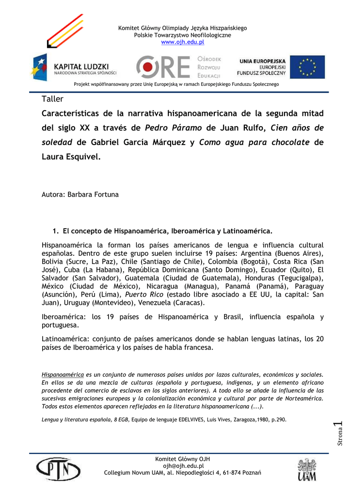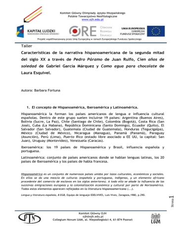 Komitet Główny Olimpiady Języka Hiszpańskiego Polskie Towarzystwo Neofilologiczne www.ojh.edu.pl Projekt współfinansowany przez Unię Europejską w ramach Europejskiego Funduszu Społecznego Taller Características de la narrativa hispanoamericana de la segunda mitad del siglo XX a través de Pedro Páramo de Juan Rulfo, Cien años de soledad de Gabriel García Márquez y Como agua para chocolate de Laura Esquivel. Autora: Barbara Fortuna 1. El concepto de Hispanoamérica, Iberoamérica y Latinoamérica. Hispanoamérica la forman los países americanos de lengua e influencia cultural españolas. Dentro de este grupo suelen incluirse 19 países: Argentina (Buenos Aires), Bolivia (Sucre, La Paz), Chile (Santiago de Chile), Colombia (Bogotá), Costa Rica (San José), Cuba (La Habana), República Dominicana (Santo Domingo), Ecuador (Quito), El Salvador (San Salvador), Guatemala (Ciudad de Guatemala), Honduras (Tegucigalpa), México (Ciudad de México), Nicaragua (Managua), Panamá (Panamá), Paraguay (Asunción), Perú (Lima), Puerto Rico (estado libre asociado a EE UU, la capital: San Juan), Uruguay (Montevideo), Venezuela (Caracas). Iberoamérica: los 19 países de Hispanoamérica y Brasil, influencia española y portuguesa. Latinoamérica: conjunto de países americanos donde se hablan lenguas latinas, los 20 países de Iberoamérica y los países de habla francesa. Strona Lengua y literatura española, 8 EGB, Equipo de lenguaje EDELVIVES, Luis Vives, Zaragoza,1980, p.290. 1 Hispanoamérica es un conjunto de numerosos países unidos por lazos culturales, económicos y sociales. En ellos se da una mezcla de culturas (española y portuguesa, indígenas, y un elemento africano procedente del comercio de esclavos en los siglos anteriores). A todo ello se añade la influencia de las sucesivas emigraciones europeas y la colonialización económica y cultural por parte de Norteamérica. Todos estos elementos aparecen reflejados en la literatura hispanoamericana (...). Komitet Główny OJH [email protected] Collegium Novum UAM, al. Niepodległości 4, 61-874 Poznań Komitet Główny Olimpiady Języka Hiszpańskiego Polskie Towarzystwo Neofilologiczne www.ojh.edu.pl Projekt współfinansowany przez Unię Europejską w ramach Europejskiego Funduszu Społecznego 2. ¿Qué tienen en común los países de Hispanoamérica? ¿Existe la literatura hispanoamericana? Sin embargo, según algunos especialistas, la literatura hispanoamericana no existe y se debe hablar sobre la literatura mexicana, argentina, peruana, etc., sin unificarlas. 3. La novela hispanoamericana en la segunda mitad del siglo XX. 3.1. El boom hispanoamericano. En la segunda mitad del siglo XX la literatura hispanoamericana vive su momento de auge. Existe “un grupo valiosísimo de escritores jóvenes que, al mismo tiempo que se comprometen en la lucha social, lo hacen también con un decoroso manejo de la lengua” (Enrique Anderson Imbert). Los novelistas hispanoamericanos adquirieron fama universal y tres de ellos fueron laureados con el premio Nobel de Literatura: Miguel Ángel Asturias (1967), Gabriel García Márquez (1982), Mario Vargas Llosa (2010). Otros autores hispanoamericanos galardonados con el más prestigioso de los premios universales: Gabriela Mistral (1945), Octavio Paz (1990), Pablo Neruda (1971). La novela hispanoamericana adquiere nuevas caractrístcas. Según Carlos A. Loprete en la nueva narrativa destacan: deliberada actitud de cambio, fundamentación teórica de las obras, abandono del clásico concepto de “belleza”, actualización de temas y personajes, transposiciones artísticas, fertilidad y profesionalidad literaria, resonancia universal, estallido de las aspiraciones, experimentalismo, pervivencia del barroquismo expresivo. Komitet Główny OJH [email protected] Collegium Novum UAM, al. Niepodległości 4, 61-874 Poznań Strona En la nueva narrativa predomina la fusión de lo real, lo ideal y lo fantástico; mezcla de enfoques y técnicas llamada: realismo mágico. 2 Los principales representantes del boom: Jorge Luis Borges, Juan Rulfo, Miguel Ángel Asturias, Alejo Carpentier, Juan Carlos Onetti, Julio Cortázar, Gabriel García Márquez, Ernesto Sábato, Carlos Fuentes, Mario Vargas Llosa, José Lezama Lima, Augusto Roa Bastos, y otros. Komitet Główny Olimpiady Języka Hiszpańskiego Polskie Towarzystwo Neofilologiczne www.ojh.edu.pl Projekt współfinansowany przez Unię Europejską w ramach Europejskiego Funduszu Społecznego 3.2. El realismo mágico. No existe una sola definición del realismo mágico. La Enciclopedia Santillana lo define de este modo: el movimiento novelístico hispanoamericano surgido a mediados del siglo XX y que se caracteriza por la introducción de elementos fantásicos dentro de una narrativa realista. Características del realismo mágico: elementos mágicos/fantásticos son percibidos como parte de lo normal; hay alusiones a mitos y leyendas; complejidad narrativa; el tiempo suele ser cíclico; empleo de la hipérbole; presencia de los personajes de ultratumba; la naturaleza y la cultura americanas como elementos clave. Carlos A. Loprete en Literatura Mexicana e Hispanoamericana entiende el trabajo del novelista de esta forma: La realidad provee el hecho cotidiano que sirve de argumento y el escritor aporta una distorsión de ella mediante un mecanismo intelectual que lo transforma en absurdo, ilusorio, irreal, contradictorio, ambiguo, preternatural. 4. Autores presentados. 4.1. Juan Rulfo (1918-1986) Strona 3 Juan Nepomuceno Carlos Pérez Rulfo Vizcaíno, mexicano, iniciador del realismo mágico, escritor, guionista, fotógrafo, obras: Llamo en llamas, Pedro Páramo. Komitet Główny OJH [email protected] Collegium Novum UAM, al. Niepodległości 4, 61-874 Poznań Komitet Główny Olimpiady Języka Hiszpańskiego Polskie Towarzystwo Neofilologiczne www.ojh.edu.pl Projekt współfinansowany przez Unię Europejską w ramach Europejskiego Funduszu Społecznego 4.