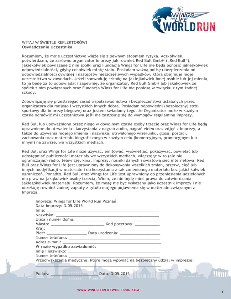 WITAJ W ŚWIETLE REFLEKTORÓW! Oświadczenie Uczestnika Rozumiem, że moje uczestnictwo wiąże się z pewnym stopniem ryzyka. Aczkolwiek, potwierdzam, że zarówno organizator imprezy jak również Red Bull GmbH („Red Bull”), jakiekolwiek powiązane z nim spółki oraz Fundacja Wings for Life nie będą ponosić jakiejkolwiek odpowiedzialności, gdyby cokolwiek mi się stało. Posiadam ważną polisę ubezpieczenia od odpowiedzialności cywilnej i następstw nieszczęśliwych wypadków, która obejmuje moje uczestnictwo w zawodach. Jeżeli spowoduję szkodę na jakiejkolwiek innej osobie lub jej mieniu, to ja będę za to odpowiadał i zapewnię, że organizator, Red Bull GmbH lub jakakolwiek ze spółek z nim powiązanych oraz Fundacja Wings for Life nie poniosą w związku z tym żadnej szkody. Zobowiązuję się przestrzegać zasad współzawodnictwa i bezpieczeństwa ustalonych przez organizatora dla mojego i wszystkich innych dobra. Posiadam odpowiedni (bezpieczny) strój sportowy dla imprezy biegowej oraz jestem świadomy tego, że Organizator może w każdym czasie odmówić mi uczestnictwa jeśli nie zastosuję się do wymogów regulaminu imprezy. Red Bull lub upoważnione przez niego w dowolnym czasie osoby trzecie oraz Wings for Life będą uprawnione do utrwalenia i korzystania z nagrań audio, nagrań video oraz zdjęć z Imprezy, a także do używania mojego imienia i nazwiska, utrwalonego wizerunku, głosu, postaci, zachowania oraz materiału biograficznego w każdym celu (komercyjnym, promocyjnym lub innym) na zawsze, we wszystkich mediach. Red Bull oraz Wings for Life może używać, emitować, wyświetlać, pokazywać, powielać lub udostępniać publiczności materiały we wszystkich mediach, włączając w to (ale nie ograniczając) radio, telewizję, kina, imprezy, nośniki danych i światową sieć internetową. Red Bull oraz Wings for Life jest uprawniony do dokonywania wszelkich zmian, przerw, cięć lub innych modyfikacji w materiale i do korzystania z tak zmienionego materiału bez jakichkolwiek ograniczeń. Ponadto, Red Bull oraz Wings for Life jest uprawniony do przeniesienia udzielonych mu praw na jakąkolwiek osobę trzecią. Wiem, że nie będę mieć prawa do zatwierdzania jakiegokolwiek materiału. Rozumiem, że mogę nie być wskazany jako uczestnik Imprezy i nie oczekuję również żadnej zapłaty z tytułu mojego pojawienia się w materiale związanym z Imprezą. Impreza: Wings for Life World Run Poznań Data Imprezy: 3.05.2015 Imię: __________________________________________________ Nazwisko: ______________________________________________ Ulica i numer domu: _____________________________________ Miasto: ________________________ Kod pocztowy: ___________ Kraj: ___________________________________________________ Płeć: __________________ Data urodzenia: __________________ Numer telefonu: _________________________________________ Adres e-mail: ____________________________________________ W razie wypadku zawiadomić: Imię i nazwisko: _________________________________________ Numer telefonu: _________________________________________ Przeciwskazania medyczne, które mogą wpłynąć na bezpieczny udział w imprezie: ________________________________________________________ Podpis: _____________________ Data: 3.05.2015 WWW.WINGSFORLIFEWORLDRUN.COM WWW.WINGSFORLIFEWORLDRUN.COM 1