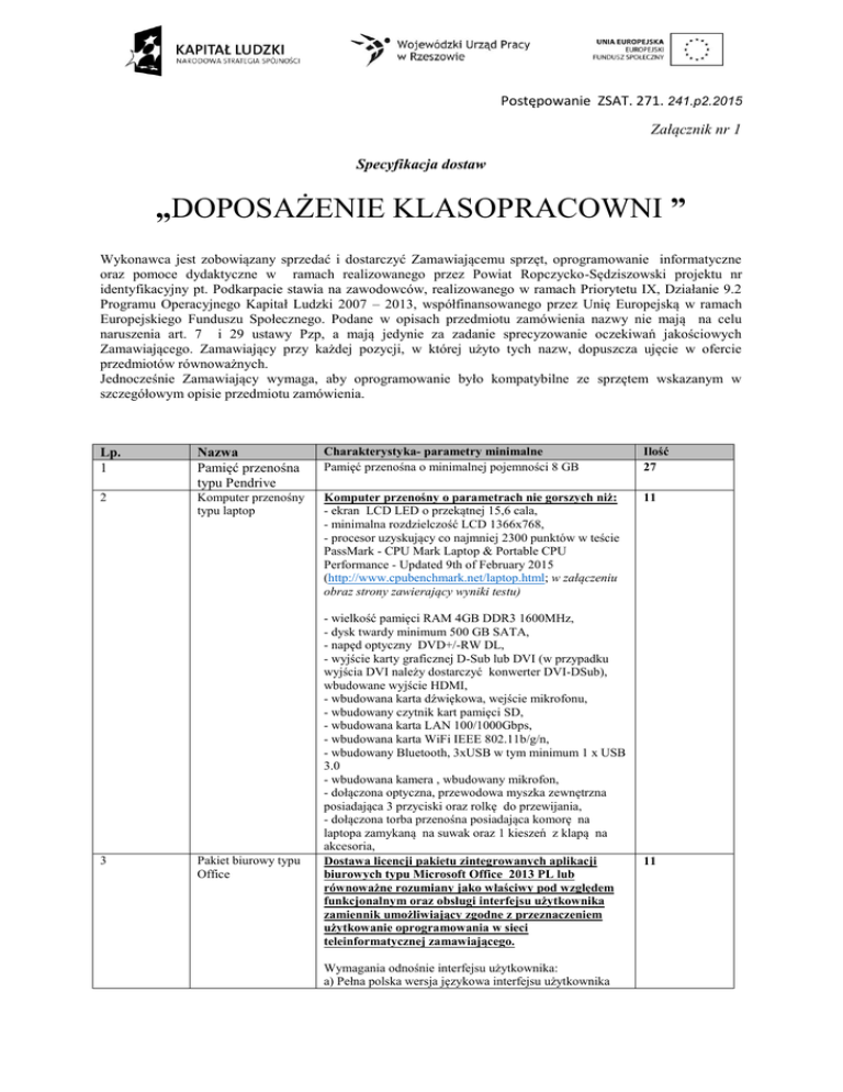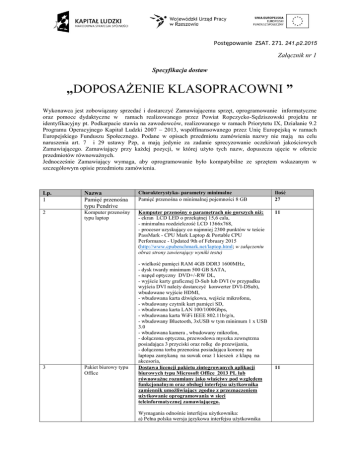 Postępowanie ZSAT. 271. 241.p2.2015 Załącznik nr 1 Specyfikacja dostaw „DOPOSAŻENIE KLASOPRACOWNI ” Wykonawca jest zobowiązany sprzedać i dostarczyć Zamawiającemu sprzęt, oprogramowanie informatyczne oraz pomoce dydaktyczne w ramach realizowanego przez Powiat Ropczycko-Sędziszowski projektu nr identyfikacyjny pt. Podkarpacie stawia na zawodowców, realizowanego w ramach Priorytetu IX, Działanie 9.2 Programu Operacyjnego Kapitał Ludzki 2007 – 2013, współfinansowanego przez Unię Europejską w ramach Europejskiego Funduszu Społecznego. Podane w opisach przedmiotu zamówienia nazwy nie mają na celu naruszenia art. 7 i 29 ustawy Pzp, a mają jedynie za zadanie sprecyzowanie oczekiwań jakościowych Zamawiającego. Zamawiający przy każdej pozycji, w której użyto tych nazw, dopuszcza ujęcie w ofercie przedmiotów równoważnych. Jednocześnie Zamawiający wymaga, aby oprogramowanie było kompatybilne ze sprzętem wskazanym w szczegółowym opisie przedmiotu zamówienia. Lp. 1 Nazwa Pamięć przenośna typu Pendrive Charakterystyka- parametry minimalne Pamięć przenośna o minimalnej pojemności 8 GB Ilość 27 2 Komputer przenośny typu laptop Komputer przenośny o parametrach nie gorszych niż: - ekran LCD LED o przekątnej 15,6 cala, - minimalna rozdzielczość LCD 1366x768, - procesor uzyskujący co najmniej 2300 punktów w teście PassMark - CPU Mark Laptop & Portable CPU Performance - Updated 9th of February 2015 (http://www.cpubenchmark.net/laptop.html; w załączeniu obraz strony zawierający wyniki testu) 11 3 Pakiet biurowy typu Office - wielkość pamięci RAM 4GB DDR3 1600MHz, - dysk twardy minimum 500 GB SATA, - napęd optyczny DVD+/-RW DL, - wyjście karty graficznej D-Sub lub DVI (w przypadku wyjścia DVI należy dostarczyć konwerter DVI-DSub), wbudowane wyjście HDMI, - wbudowana karta dźwiękowa, wejście mikrofonu, - wbudowany czytnik kart pamięci SD, - wbudowana karta LAN 100/1000Gbps, - wbudowana karta WiFi IEEE 802.11b/g/n, - wbudowany Bluetooth, 3xUSB w tym minimum 1 x USB 3.0 - wbudowana kamera , wbudowany mikrofon, - dołączona optyczna, przewodowa myszka zewnętrzna posiadająca 3 przyciski oraz rolkę do przewijania, - dołączona torba przenośna posiadająca komorę na laptopa zamykaną na suwak oraz 1 kieszeń z klapą na akcesoria, Dostawa licencji pakietu zintegrowanych aplikacji biurowych typu Microsoft Office 2013 PL lub równoważne rozumiany jako właściwy pod względem funkcjonalnym oraz obsługi interfejsu użytkownika zamiennik umożliwiający zgodne z przeznaczeniem użytkowanie oprogramowania w sieci teleinformatycznej zamawiającego. Wymagania odnośnie interfejsu użytkownika: a) Pełna polska wersja językowa interfejsu użytkownika 11 b) Prostota i intuicyjność obsługi, pozwalająca na pracę osobom nieposiadającym umiejętności technicznych c) Możliwość zintegrowania uwierzytelniania użytkowników z usługą katalogową Active Directory wdrożoną u Zamawiającego – użytkownik raz zalogowany z poziomu systemu operacyjnego stacji roboczej ma być automatycznie rozpoznawany we wszystkich modułach oferowanego rozwiązania bez potrzeby oddzielnego monitowania go o ponowne uwierzytelnienie się . Ze względu na wdrożoną u zamawiającego usługę katalogową Active Directory dostarczone oprogramowanie musi mieć możliwość zarządzania ustawieniami poprzez polisy GPO. Pakiet zintegrowanych aplikacji biurowych musi zawierać : a) Edytor tekstów b) Arkusz kalkulacyjny c) Narzędzie do przygotowywania i prowadzenia prezentacji d) Narzędzie do zarządzania informacją prywatą (pocztą elektroniczną, kalendarzem, kontaktami i zadaniami) Edytor tekstów musi umożliwiać: a) Edycję i formatowanie tekstu w języku polskim wraz z obsługą języka polskiego w zakresie sprawdzania pisowni i poprawności gramatycznej oraz funkcjonalności ą słownika wyrazów bliskoznacznych i autokorekty b) Wstawianie oraz formatowanie tabel c) Wstawianie oraz formatowanie obiektów graficznych d) Wstawianie wykresów i tabel z arkusza kalkulacyjnego (wliczając tabele przestawne) e) Automatyczne numerowanie rozdziałów, punktów, akapitów, tabel i rysunków f) Automatyczne tworzenie spisów treści g) Formatowanie nagłówków i stopek stron h) Sprawdzanie pisowni w języku polskim i) Śledzenie zmian wprowadzonych przez użytkowników j) Nagrywanie, tworzenie i edycję makr automatyzujących wykonywanie czynności k) Określenie układu strony (pionowa/pozioma) l) Wydruk dokumentów m) Wykonywanie korespondencji seryjnej bazując na danych adresowych pochodzących z arkusza kalkulacyjnego i z narzędzia do zarządzania informacją prywatną n) Pracę na dokumentach utworzonych przy pomocy Microsoft Word 2003 lub Microsoft Word 2007 i 2010 z zapewnieniem bezproblemowej konwersji wszystkich elementów i atrybutów dokumentu o) Zabezpieczenie dokumentów hasłem przed odczytem oraz przed wprowadzaniem modyfikacji p) Wymagana jest dostępność do oferowanego edytora tekstu bezpłatnych narzędzi umożliwiających wykorzystanie go, jako środowiska udostępniającego formularze bazujące na schematach XML z Centralnego Repozytorium Wzorów Dokumentów Elektronicznych, które po wypełnieniu umożliwiają zapisanie pliku XML w zgodzie z obowiązującym prawem. q) Wymagana jest dostępność do oferowanego edytora tekstu bezpłatnych narzędzi (kontrolki) umożliwiających podpisanie podpisem elektronicznym pliku z zapisanym dokumentem przy pomocy certyfikatu kwalifikowanego zgodnie z wymaganiami obowiązującego w Polsce prawa. r) Wymagana jest dostępność do oferowanego edytora tekstu bezpłatnych narzędzi umożliwiających wykorzystanie go, jako środowiska udostępniającego formularze i pozwalające zapisać plik wynikowy w zgodzie z Rozporządzeniem o Aktach Normatywnych i Prawnych. Arkusz kalkulacyjny musi umożliwiać : a) Tworzenie raportów tabelarycznych b) Tworzenie wykresów liniowych (wraz linią trendu), słupk
