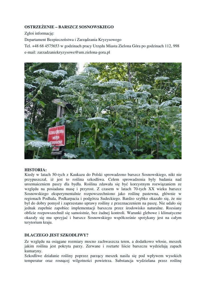 OSTRZEŻENIE – BARSZCZ SOSNOWSKIEGO Zgłoś informację: Departament Bezpieczeństwa i Zarządzania Kryzysowego Tel. +48 68 4575653 w godzinach pracy Urzędu Miasta Zielona Góra po godzinach 112, 998 e-mail: [email protected] HISTORIA: Kiedy w latach 50-tych z Kaukazu do Polski sprowadzono barszcz Sosnowskiego, nikt nie przypuszczał, iż jest to roślina szkodliwa. Celem sprowadzenia były badania nad urozmaiceniem paszy dla bydła. Roślina zdawała się być korzystnym rozwiązaniem ze względu na posiadana masę i przyrost. Z czasem w latach 70-tych XX wieku barszcz Sosnowskiego eksperymentalnie rozpowszechniono jako roślinę pastewna, głównie w regionach Podhala, Podkarpacia i podgórza Sudeckiego. Bardzo szybko okazało się, że nie był do dobry pomysł i zaprzestano uprawy rośliny z przeznaczeniem na paszę. Nie udało się jednak zupełnie zapobiec implementacji barszczu przez środowisko naturalne. Rozsiany obficie rozpowszechnił się samoistnie, bez żadnej kontroli. Warunki glebowe i klimatyczne okazały się mu sprzyjać i barszcz Sosnowskiego współcześnie spotykany jest na całym terytorium kraju. DLACZEGO JEST SZKODLIWY? Ze względu na osiągane rozmiary mocno zachwaszcza teren, a dodatkowo włosie, meszek jakim roślina jest pokryta parzy. Zerwane i roztarte liście barszczu wydzielają zapach kumaryny. Szkodliwe działanie rośliny poprzez parzący meszek nasila się pod wpływem wysokich temperatur oraz rosnącej wilgotności powietrza. Substancja wydzielana przez roślinę podrażnia skórę prowadząc do jej zapalenia, co więcej powstające rany i pęcherze trudno się goją, a po nich pozostają blizny, co więcej kontakt z rośliną może powodować również zapalenie spojówek. Z uwagi na zagrożenie zdrowia, szczególnie dzieci i osób podatnych na alergię barszcz Sosnowskiego uznany został za szkodliwy chwast wymagający interwencyjnego zwalczania i zapobiegania rozprzestrzeniania się rośliny. JAK ROZPOZNAĆ? Pierwszy rok wzrostu to pojawienie się rozety, porównywalny jest z liścieniem barszczu zwyczajnego, dopiero w czasie drugiego roku powstają pędy nasienne, które owocują dając nasiona. Z czasem po etapie owocowania roślina zamiera. Zdarza się czasami wydłużony okres wegetacji barszczu Sosnowskiego, kiedy po pierwszym roku z utworzonej rozety nie wyrastają pędy nasienne. Wówczas roślina przeobraża się w wieloletnią, a nasiona pojawiają się znacznie później niż w drugim, a nawet trzecim roku. Na szczęście nie jest trudno rozpoznać tę roślinę. Ma ona charakterystyczny wygląd: na pierwszy rzut okna przypomina przerośnięty koper. Jego wysokość może dochodzić od 1 do 4 metrów. jego łodyga jest gruba, niżej pokryta jest plamami o barwie purpurowej, natomiast wyżej jest ona zielona. Liście składają się z szerszych odcinków, które zazwyczaj zakończone są tępo. Błaszka liściowa ma zaokrąglone krótkie ząbki. Kwiaty tej rośliny rosną w gęstych i sporych baldach, mierzących do 50 cm. JAK LECZYĆ? Styczność z tą rośliną przynosi fatalne skutki nie tylko dla człowieka, ale i wszystkich zwierząt domowych. Leczenie oparzeń nie jest proste. Należy pamiętać, że roślina ta jest bardzo niebezpieczna i nie można bagatelizować jej toksyczności. Diagnoza oparzenia jest w pierwszym momencie trudna, ponieważ wyraźnie oznaki poparzenia nie występują od razu. MIAŁEŚ STYCZNOŚĆ Z TĄ ROŚLINĄ? NATYCHMIAST: 1. Dokładnie przemyj wodą z mydłem miejsce styczności z rośliną 2. Skontaktuj się z lekarzem 3. Unikaj słońca przez dwie doby - nawet jeśli tylko podejrzewasz, że miałeś styczność z barszczem. Skóra oparzona i poddana na działanie promieni słonecznych to duże niebezpieczeństwo i może się fatalnie skończyć. JAKIE LEKI MOGĄ POMÓC NA POPARZENIA? • MECORTOLON N - krem, maść; przeciwdziała reakcjom uczuleniowym i łagodzi je; przynosi ulgę w procesach zapalnych skóry i świądzie. Krem nadaje się do leczenia wilgotnych zmian skórnych, natomiast maść jest odpowiednia do leczenia suchych łuszczących się zmian skórnych. • ARGOSULFAN - krem, który przyspiesza gojenie się oparzeń, owrzodzeń podudzi (skutecznie zabezpieczając je przed zakażeniem), likwiduje ból i swędzenie w ranie. Jest dobrze tolerowany zarówno w przypadku leczenia ran oparzeniowych, jak i powstałych na tle troficznym owrzodzeń skóry. ZWALCZANIE Niszczenie rośliny możliwe jest zarówno z wykorzystaniem specjalistycznego sprzętu, chemiczny, jak i ręcznie przy pomocy narzędzia ogrodniczego, motyki i rękawic ochronnych. Powszechnie stosuje się koszenie rośliny, należy pamiętać, iż skoszenie tworzy okazję do powstawania baldachów coraz niżej przy ziemi, a zagrożeniem dla koszenia jest, to, ze roślina staje się wieloletnia. Walka chemiczna herbicydami może być również zastosowana niezależnie i jako jedyna metoda walki z barszczem Rundup 360 SL , glifosacie . Środek chemiczny osłabia moc kiełkowania barszczu Sosnowskiego. Widocznym efektem zastosowania chemikaliów jest osłabienie rośliny, co ważne opryski należy powtarzać nawet do 3, 4 lat, bo taką żywotność posiadają nasiona barszczu Sosnkowskiego. OSTRZEŻENIE Bez względu na formę, metodę walki z barszczem Sosnkowskiego wszelkie osoby pracujące przy zwalczaniu chwastu winny być odpowiednio poinformowane i ostrzeżone przed szkodliwym działaniem rośliny, głównie parzenie i toksyczny wpływ na organizm człowieka. Tym samym wszystkie osoby stykające się z barszczem powinny być wyposażone w odzież ochronną. W razie konieczności należy chronić skórę, ubierając się szczelnie, najlepiej w strój z materiałów syntetycznych, wodoodpornych, w tym rękawice z długimi rękawami. Materiały z włókien naturalnych (bawełniane, lniane) wchłaniają sok i są penetrowane przez włoski roślin. Chronić należy także oczy, zakładając gogle, ewentualnie okulary. Jeżeli doszło do