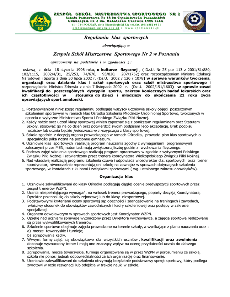 ZZEESSPPÓ ÓŁŁ SSZZK KÓ ÓŁŁ M MIISSTTR RZZO OSSTTW WA A SSPPO OR RTTO OW WEEG GO O N NR R 22 SSSzzzkkkooołłłaaa PPPooodddssstttaaaw w w N m C w w wooow waaa N Nrrr 111333 iiim mC Cyyytttaaadddeeelllooow wcccóóów w PPPooozzznnnaaańńńssskkkiiiccchhh G G m m N m B w C w Giiim mnnnaaazzzjjjuuum mN Nrrr 333 iiim m... B Booohhhaaattteeerrróóów wC Czzzeeerrrw wcccaaa 111999555666 rrroookkkuuu 61 – 714 POZNAŃ, aleja Niepodległości 32; tel./fax. (061) 852 60 01 gm3 @pozna n.interkla sa .pl ; www.sportowa13 .pl Regulamin klas sportowych obowiązujący w Zespole Szkół Mistrzostwa Sportowego Nr 2 w Poznaniu opracowany na podstawie i w zgodności z : ustawą z dnia 18 stycznia 1996 roku, o kulturze fizycznej , ( Dz.U. Nr 25 poz 113 z 2001/81/889, 102/1115, 2002/4/31, 25/253, 74/676, 93/820, 207/1752) oraz rozporządzeniem Ministra Edukacji Narodowej i Sportu z dnia 30 lipca 2002 r. (Dz.U. 2002 / 126 / 1078) w sprawie warunków tworzenia, organizacji oraz działania klas i szkół sportowych oraz szkół mistrzostwa sportowego i rozporządzenie Ministra Zdrowia z dnia 7 listopada 2002 r. (Dz.U. 2002/191/1603) w sprawie zasad kwalifikacji do poszczególnych dyscyplin sportu, zakresu koniecznych badań lekarskich oraz ich częstotliwości w stosunku do dzieci i młodzieży do ukończenia 21 roku życia uprawiających sport amatorski. 1. Postanowieniom niniejszego regulaminu podlegają wszyscy uczniowie szkoły objęci poszerzonym szkoleniem sportowym w ramach klas Ośrodka Szkolenia Młodzieży Uzdolnionej Sportowo, tworzonych w oparciu o wytyczne Ministerstwa Sportu i Polskiego Związku Piłki Nożnej. 2. Każdy rodzic oraz uczeń klasy sportowej winien zapoznać się z poniższym regulaminem oraz Statutem Szkoły, stosować go na co dzień oraz potwierdzić swoim podpisem jego akceptację. Brak podpisu rodziców lub ucznia będzie jednoznaczne z rezygnacja z klasy sportowej. 3. Szkoła zgodnie z decyzją organu prowadzącego w ramach Ośrodka, prowadzi pion klas sportowych o specjalności piłka nożna na poziomie gimnazjum. 4. Uczniowie klas sportowych realizują program nauczania zgodny z wymaganiami programowymi zalecanymi przez MEN, natomiast mają zwiększoną liczbę godzin z wychowania fizycznego. 5. Podczas zajęć szkolenia sportowego realizują program opracowany w zgodzie z wytycznymi Polskiego Związku Piłki Nożnej i zatwierdzony przez trenera koordynatora Wielkopolskiego Związku Piłki Nożnej. 6. Nad właściwą realizacją programu szkolenia czuwa i odpowiada wicedyrektor d.s. sportowych oraz trener koordynator, równocześnie reprezentują oni szkołę na zewnątrz w sprawach dotyczących szkolenia sportowego, w kontaktach z klubami i związkami sportowymi ( wg. ustalonego zakresu obowiązków). Organizacja klas 1. Uczniowie zakwalifikowani do klasy Ośrodka podlegają ciągłej ocenie predyspozycji sportowych przez zespół trenerów WZPN. 2. Ucznia niespełniającego wymagań, na wniosek trenera prowadzącego, poparty decyzją Koordynatora, Dyrektor przenosi się do szkoły rejonowej lub do klasy niesportowej. 3. Podstawowymi kryteriami oceny sportowej są: obecności i zaangażowanie na treningach i zawodach, właściwy stosunek do obowiązków zawodniczych i kadry szkoleniowej oraz postępy w zakresie specjalizacji. 4. Organem odwoławczym w sprawach sportowych jest Koordynator WZPN. 5. Opiekę nad uczniami sprawuje wyznaczony przez Dyrektora wychowawca, a zajęcia sportowe realizowane są przez wykwalifikowanych trenerów. 6. Szkolenie sportowe obejmuje zajęcia prowadzone na terenie szkoły, a wynikające z planu nauczania oraz : a) mecze towarzyskie i turnieje; b) zgrupowania kadry. 7. W/wym. formy zajęć są obowiązkowe dla wszystkich uczniów , kwalifikacji oraz zwolnienia dokonuje wyznaczony trener i mają one znaczący wpływ na ocenę przydatności ucznia do dalszego szkolenia. 8. Zgrupowania, mecze towarzyskie, turnieje organizowane są w przez WZPN w porozumieniu ze szkołą, szkoła nie ponosi jednak odpowiedzialności za ich organizację oraz finansowanie. 9. Uczniowie zakwalifikowani do szkolenia otrzymują bezpłatnie podstawowy sprzęt sportowy, który podlega zwrotowi w razie rezygnacji lub odejścia w trakcie nauki w szkole. ZZEESSPPÓ ÓŁŁ SSZZK KÓ ÓŁŁ M MIISSTTR RZZO OSSTTW WA A SSPPO OR RTTO OW WEEG GO O N NR R 22 SSSzzzkkkooołłłaaa PPPooodddssstttaaaw w w N m C w w wooow waaa N Nrrr 111333 iiim mC Cyyytttaaadddeeelllooow wcccóóów w PPPooozzznnnaaańńńssskkkiiiccchhh G G m m N m B w C w Giiim mnnnaaazzzjjjuuum mN Nrrr 333 iiim m... B Booohhhaaattteeerrróóów wC Czzzeeerrrw wcccaaa 111999555666 rrroookkkuuu 61 – 714 POZNAŃ, aleja Niepodległości 32; tel./fax. (061) 852 60 01 gm3 @pozna n.interkla sa .pl ; www.sportowa13 .pl Prawa i obowiązki uczniów oraz rodziców 1. Szkoła zapewnia uczniom klas: a. odpłatne korzystanie ze stołówki szkolnej, b. dla uczniów spoza Poznania pierwszeństwo w przyjęciu do Internatu, c. podstawową opiekę medyczną, d. odpowiednią bazę treningową, 2. Rodzice powinni w szczególności : a) udzielić pisemnej zgody na uczestniczenie dziecka w zajęciach sportowych; b) być w stałym kontakcie z kadrą trenerską ( zebrania szkolne i wewnętrzne grupy szkoleniowej) c) systematycznie kontaktować się z wychowawcą klasy i wychowawcami Internatu; d) włączyć się materialnie i organizacyjnie w pomoc przy organizacji meczów i wyjazdów ligowych; e) umożliwić dziecku przeprowadzanie okresowych badań lekarskich ; 3. Dzieci i młodzież uprawiające sport amatorski kwalifikuje do uprawiania określonej dyscypliny sportu lekarz specjalista w dziedzinie medycyny sportowej. 4. Warunkiem zakwalifikowania do uczestnictwa w zajęciach lub zawodach sportowych jest posiadanie ważnego zaświadczenia lekarskiego. 5. Za przeprowadzenie, zgodne z postanowieniami, badań lekarskich odpowiadają rodzice ucznia. 6. Za kontrolę posiadania aktualnych badań lekarskich odpowiada wyznaczony t
