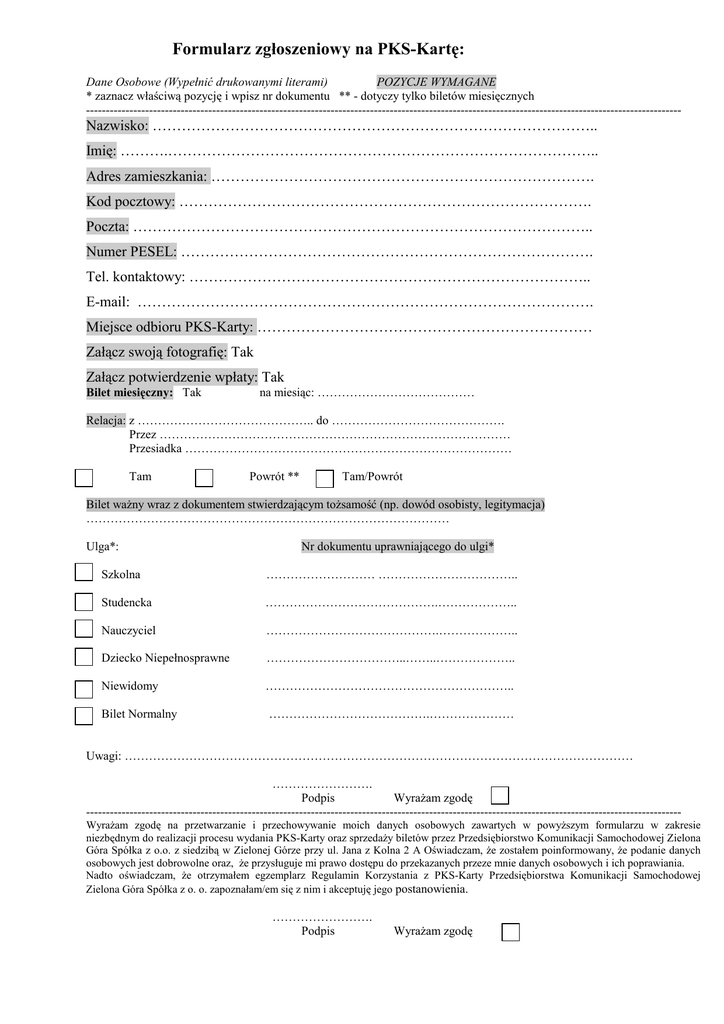 Formularz zgłoszeniowy na PKS-Kartę: Dane Osobowe (Wypełnić drukowanymi literami) POZYCJE WYMAGANE * zaznacz właściwą pozycję i wpisz nr dokumentu ** - dotyczy tylko biletów miesięcznych ------------------------------------------------------------------------------------------------------------------------------------------------------- Nazwisko: ……………………………………………………………………………….. Imię: ……….…………………………………………………………………………….. Adres zamieszkania: ……………………………………………………………………. Kod pocztowy: …………………………………………………………………………. Poczta: ………………………………………………………………………………….. Numer PESEL: …………………………………………………………………………. Tel. kontaktowy: ……………………………………………………………………….. E-mail: …………………………………………………………………………………. Miejsce odbioru PKS-Karty: …………………………………………………………… Załącz swoją fotografię: Tak Załącz potwierdzenie wpłaty: Tak Bilet miesięczny: Tak na miesiąc: ………………………………… Relacja: z …………………………………….. do ……………………………………. Przez …………………………………………………………………………… Przesiadka ……………………………………………………………………… Tam Powrót ** Tam/Powrót Bilet waŜny wraz z dokumentem stwierdzającym toŜsamość (np. dowód osobisty, legitymacja) ……………………………………………………………………………… Ulga*: Nr dokumentu uprawniającego do ulgi* Szkolna ……………………… …………………………….. Studencka …………………………………….……………….. Nauczyciel …………………………………….……………….. Dziecko Niepełnosprawne ……………………………..……..……………….. Niewidomy …………………………………………………….. Bilet Normalny ………………………………….………………… Uwagi: ……………………………………………………………………………………………………………… ……………………. Podpis WyraŜam zgodę ------------------------------------------------------------------------------------------------------------------------------------------------------WyraŜam zgodę na przetwarzanie i przechowywanie moich danych osobowych zawartych w powyŜszym formularzu w zakresie niezbędnym do realizacji procesu wydania PKS-Karty oraz sprzedaŜy biletów przez Przedsiębiorstwo Komunikacji Samochodowej Zielona Góra Spółka z o.o. z siedzibą w Zielonej Górze przy ul. Jana z Kolna 2 A Oświadczam, Ŝe zostałem poinformowany, Ŝe podanie danych osobowych jest dobrowolne oraz, Ŝe przysługuje mi prawo dostępu do przekazanych przeze mnie danych osobowych i ich poprawiania. Nadto oświadczam, Ŝe otrzymałem egzemplarz Regulamin Korzystania z PKS-Karty Przedsiębiorstwa Komunikacji Samochodowej Zielona Góra Spółka z o. o. zapoznałam/em się z nim i akceptuję jego postanowienia. ……………………. Podpis WyraŜam zgodę