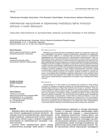 Post N Med 2016; XXIX(11B): 51-56 ©Borgis *Włodzimierz Hendiger, Alicja Siwko, Piotr Słowiński, Paweł Dąbek, Tomasz Krosny, Walerian Staszkiewicz Interwencje naczyniowe w objawowej miażdżycy tętnic kończyn dolnych u osób starszych Vascular interventions in symptomatic arterial occlusive disease in the elderly Klinika Chirurgii Naczyniowej i Angiologii, Centrum Medyczne Kształcenia Podyplomowego, Szpital Bielański im. ks. J. Popiełuszki, Warszawa Kierownik Kliniki: prof. zw. dr hab. med. Walerian Staszkiewicz Słowa kluczowe Streszczenie tętnica udowa powierzchowna, zabiegi wewnątrznaczyniowe, ludzie starsi Miażdżyca jest główną przyczyną powstawania zwężeń lub niedrożności tętnic kończyn, objawiających się bólami z powodu niedokrwienia. Doprowadza do dolegliwości o różnym stopniu nasilenia, od umiarkowanego chromania kończyn do niedokrwienia objawiającego się bólami spoczynkowymi, owrzodzeniami niedokrwiennymi. Takie zaawansowane zmiany, nazywane krytycznym niedokrwieniem kończyn dolnych, nieleczone doprowadzają do utraty kończyny, a nawet stanowią stan zagrożenia życia. Klasyczne metody rewaskularyzacji kończyn związane są z ryzykiem powikłań także ogólnoustrojowych. Polegają na leczeniu rozległym operacyjnym z przecięciem skóry, preparowaniem tkanek i wszyciu pomostu naczyniowego z własnej żyły lub sztucznej protezy. Ryzyko operacyjne wzrasta u ludzi starszych. Rozwój metod wewnątrznaczyniowych rewaskularyzacji naczyń umożliwia wykonanie zabiegów w coraz bardziej zaawansowanych zmianach. Zabiegi te wykonywane są poprzez nakłucie skóry i tętnicy za pomocą cewników o średnicy od 1,2-3 mm. Same zabiegi obarczone są mniejszym ryzykiem powikłań niż operacje klasyczne. Jako zabiegi mniej obciążające mogą być wykonywane u ludzi starszych, którzy z powodu chorób towarzyszących nie mogliby być zoperowani. W pracy przedstawiono różne metody rewaskularyzacji i postępowania w przypadku zmian miażdżycowych tętnic udowych. Keywords superficialis femoralis arteria, endovascular treatment, elderly people Conflict of interest Konflikt interesów None Brak konfliktu interesów Adres/address: *Włodzimierz Hendiger Klinika Chirurgii Naczyniowej i Angiologii CMKP Szpital Bielański im. ks. J. Popiełuszki ul. Cegłowska 80, 01-809 Warszawa tel. +48 (22) 569-02-85 [email protected] Summary Arteriosclerosis is a main reason of the stenosis and occlusion In limbs arteries. A symptom of sclerosis is usually an ischaemic pain. Arteriosclerosis leads to aches, from moderate legs ischaemic to critical limb ischaemia with rest pain or ulceration. These advanced changes are called a critical limb ischaemia. The syndrome when untreated leads to loss of leg and in extreme cases to death. The surgical revascularisation is associated with a risk of systemic complications. Surgical treatment are based on tissue cutting and vascular prosthesis implantation. The risk increases among elderly people. Development of the endovascular revascularisation method allows to make procedures in more and more advanced lesions. Endovascular treatment are carried out by 1.2-3 mm percutaneous puncture. Endovascular procedures causa less complications then surgical methods. This kind of procedures may be performed on the elderly with major contraindication. In this article different methods of superficial femoral artery treatment are presented. WSTĘP Miażdżyca tętnic jest główną przyczyną bólów kończyn dolnych występujących podczas chodzenia – tak zwanego chromania przystankowego. Zaawansowana postać miażdżycy, wielopoziomowe zmiany i niedrożności tętnicy udowej mogą w skrajnych przypadkach doprowadzać do niedokrwiennych owrzodzeń i martwicy kończyny. Leczenie zmian miażdżycowych tętnicy udowej powierzchownej pozostaje nadal jednym z bardziej kontrowersyjnych zagadnień w chirurgii naczyniowej. Problem w uzyskaniu dobrego długotrwałego efektu rewaskularyzacji jest związany z: zaawansowaniem zmian, długością niedrożności, budową tętnicy oraz jej właściwościami fizycznymi w poszczególnych segmentach. Zarazem dynamicznie zmieniające się techniki wykonywania zabiegów, koncepcje leczenia i coraz nowocześniejszy sprzęt utrudniają kompleksową, długoterminową ocenę przeprowadzonego leczenia. Także różnorodność technik stosowanych wynikających 51 Włodzimierz Hendiger i wsp. z własnych doświadczeń ośrodków i poszczególnych ekspertów utrudnia jednoznaczną ocenę i porównanie wyników. Wprowadzenie nowych technik zabiegowych zmienia także zakres wykonywania zabiegów wewnątrznaczyniowych i wskazania co do tradycyjnego stentowania naczynia na rzecz balonów lekowych (ang. drug eluting balloons – DEB) i stentów lekowych oraz stentgraftów. W stosunku do konsensusu TASC II z 2007 roku zwiększa się długość niedrożnych segmentów, których leczenie można przeprowadzić metodami wewnątrznaczyniowymi. Nadal jednak najlepsze wyniki odległe uzyskuje się po pomostowaniu udowo-podkolanowym z wykorzystaniem własnej żyły. Jednak tradycyjne techniki zabiegowe dają większy uraz okołooperacyjny i z powodu przeciwwskazań chorobowych mogą być trudne lub niemożliwe do przeprowadzenia u osób starszych. Dla takich pacjentów leczenie wewnątrznaczyniowe jest metodą z wyboru. OBJAWY Niedokrwienie kończyn jest spowodowane miażdżycą. Miażdżyca to proces zapalny i przewlekły. Rozwija się stopniowo przez lata, doprowadzając do zwężenia światła naczynia, aby ujawnić się w postaci wysiłkowych bólów kończyn. Zaburzenia przepływu pojawiają się przy zwężeniu przekraczającym 70%. Dlatego duży odsetek pacjentów, u których postępuje miażdżyca tętnic kończyn dolnych, nie ma objawów klinicznych niedokrwienia. Podstawowym objawem niedokrwienia kończyn dolnych (ang. peripheral arterial disease – PAD) jest chromanie, które występuje u 30% chorych (1). Jest to ból ko
