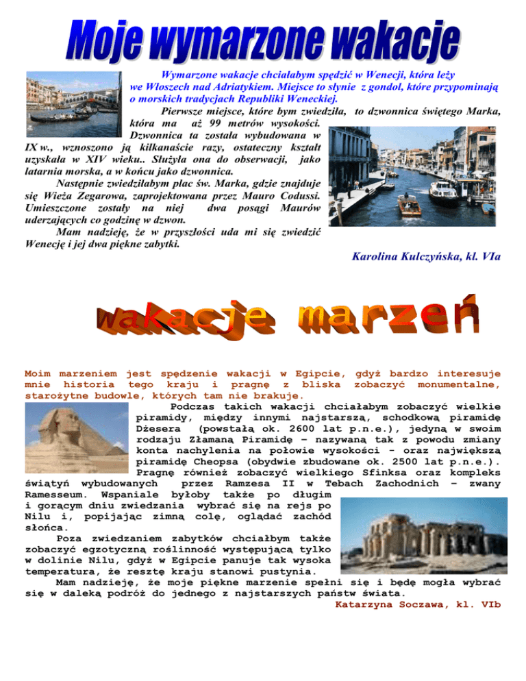 Wymarzone wakacje chciałabym spędzić w Wenecji, która leŜy we Włoszech nad Adriatykiem. Miejsce to słynie z gondol, które przypominają o morskich tradycjach Republiki Weneckiej. Pierwsze miejsce, które bym zwiedziła, to dzwonnica świętego Marka, która ma aŜ 99 metrów wysokości. Dzwonnica ta została wybudowana w IX w., wznoszono ją kilkanaście razy, ostateczny kształt uzyskała w XIV wieku.. SłuŜyła ona do obserwacji, jako latarnia morska, a w końcu jako dzwonnica. Następnie zwiedziłabym plac św. Marka, gdzie znajduje się WieŜa Zegarowa, zaprojektowana przez Mauro Codussi. Umieszczone zostały na niej dwa posągi Maurów uderzających co godzinę w dzwon. Mam nadzieję, Ŝe w przyszłości uda mi się zwiedzić Wenecję i jej dwa piękne zabytki. Karolina Kulczyńska, kl. VIa Moim marzeniem jest spędzenie wakacji w Egipcie, gdyŜ bardzo interesuje mnie historia tego kraju i pragnę z bliska zobaczyć monumentalne, staroŜytne budowle, których tam nie brakuje. Podczas takich wakacji chciałabym zobaczyć wielkie piramidy, między innymi najstarszą, schodkową piramidę DŜesera (powstałą ok. 2600 lat p.n.e.), jedyną w swoim rodzaju Złamaną Piramidę – nazywaną tak z powodu zmiany konta nachylenia na połowie wysokości - oraz największą piramidę Cheopsa (obydwie zbudowane ok. 2500 lat p.n.e.). Pragnę równieŜ zobaczyć wielkiego Sfinksa oraz kompleks świątyń wybudowanych przez Ramzesa II w Tebach Zachodnich – zwany Ramesseum. Wspaniale byłoby takŜe po długim i gorącym dniu zwiedzania wybrać się na rejs po Nilu i, popijając zimną colę, oglądać zachód słońca. Poza zwiedzaniem zabytków chciałbym takŜe zobaczyć egzotyczną roślinność występującą tylko w dolinie Nilu, gdyŜ w Egipcie panuje tak wysoka temperatura, Ŝe resztę kraju stanowi pustynia. Mam nadzieję, Ŝe moje piękne marzenie spełni się i będę mogła wybrać się w daleką podróŜ do jednego z najstarszych państw świata. Katarzyna Soczawa, kl. VIb