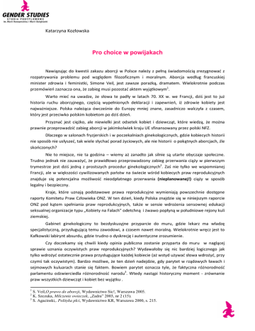 Katarzyna Kozłowska Pro choice w powijakach Nawiązując do kwestii zakazu aborcji w Polsce należy z pełną świadomością zrezygnować z rozpatrywania problemu pod względem filozoficznym i moralnym. Aborcja według francuskiej minister zdrowia i feministki, Simone Veil, jest zawsze porażką, dramatem. Wielokrotnie podczas przemówień zaznacza ona, że zabieg musi pozostać aktem wyjątkowym1. Warto mieć na uwadze, że słowa te padły w latach 70. XX w. we Francji, dziś jest to już historia ruchu aborcyjnego, częścią wypełnionych deklaracji i zapewnień, iż zdrowie kobiety jest najważniejsze. Polska należąca ówcześnie do Europy mniej znane, zasadniczo walczyła z czasem, który jest przeciwko polskim kobietom po dziś dzień. Przyznać jest ciężko, ale niewielki jest odsetek kobiet i dziewcząt, które wiedzą, że można prawnie przeprowadzić zabieg aborcji w jakimkolwiek kraju UE sfinansowany przez polski NFZ. Dlaczego w salonach fryzjerskich i w poczekalniach ginekologicznych, gdzie kobiecych historii nie sposób nie usłyszeć, tak wiele słychać porad życiowych, ale nie historii o pokątnych aborcjach, źle skończonych? Nie to miejsce, nie ta godzina – wiemy aż zanadto jak silnie są utarte obyczaje społeczne. Trudno jednak nie zauważyć, że prawidłowo przeprowadzony zabieg przerwania ciąży w pierwszym trymestrze jest dziś jedną z prostszych procedur ginekologicznych2. Zaś nie tylko we wspomnianej Francji, ale w większości cywilizowanych państw na świecie wśród kobiecych praw reprodukcyjnych znajduje się potencjalna możliwość nieodpłatnego przerwania (nieplanowanej!) ciąży w sposób legalny i bezpieczny. Kraje, które uznają podstawowe prawa reprodukcyjne wymieniają powszechnie dostępne raporty Komitetu Praw Człowieka ONZ. W ten dzień, kiedy Polska znajdzie się w niniejszym raporcie ONZ pod kątem spełniania praw reprodukcyjnych, także w sensie wdrożenia sensownej edukacji seksualnej organizacje typu „Kobiety na Falach” odetchną i żwawo popłyną w południowe rejony kuli ziemskiej. Gabinet ginekologiczny to bezdyskusyjne przyparcie do muru, gdzie lekarz ma władzę specjalistyczną, przysługującą temu zawodowi, a czasem nawet moralną. Wielokrotnie wręcz jest to Kafkowski labirynt absurdu, gdzie trudno o dyskrecję i autentyczne zrozumienie. Czy doczekamy się chwili kiedy opinia publiczna zostanie przyparta do muru w naglącej sprawie uznania oczywistych praw reprodukcyjnych? Wydawałoby się nic bardziej logicznego jak tylko wdrożyć ostatecznie prawa przysługujące każdej kobiecie (aż wstyd używać słowa wdrożyć, przy czymś tak oczywistym). Bardzo możliwe, że ten dzień nadejdzie, gdy parytet w rządowych ławach i sejmowych kuluarach stanie się faktem. Bowiem parytet oznacza tyle, że faktyczna różnorodność parlamentu odzwierciedla różnorodność narodu3. Wtedy nastąpi historyczny moment - zrównanie praw wszystkich dziewcząt i kobiet bez wyjątku . 1 S. Veil,O prawo do aborcji, Wydawnictwo Sic!, Warszawa 2005. K. Szczuka, Milczenie owieczek, „Zadra” 2003, nr 2 (15). 3 S. Agacinski,. Polityka płci, Wydawnictwo KR, Warszawa 2000, s. 215. 2 Obecnie polska klasa polityczna nie tylko wierzy, ale i chce wierzyć, że problem tkwi głęboko w kobiecie, w jej moralności, jej słabościach. Kobiety są wolne na wszystkie sposoby, włącznie z wolnością swojej własnej kobiecości i dlatego mają prawo decydować o etapie swojego życia, jakim jest macierzyństwo – kiedy ono nastąpi i z kim wejdą w posiadanie potomka. Co do potomka to dziwne, że słynny niemy krzyk jest ponoć embrionem, który mówi, zaś film ten o tym samym tytule wciąż okupuje polskie licea na lekcjach katechetycznych. W kraju, gdzie 90 % społeczeństwa określa się jako osoby wierzące, jego stanowisko musi mieć swoją wagę4 – pisze Agnieszka Graff. Niech przemówi w tym miejscu Witold Gombrowicz, który w swoich dziennikach pisał „i lepiej aby Kościół wyrzekł się scholastyki, zbyt arbitralnie wjeżdżającej w życie”5… Wracając do początku eseju, gdzie przywołałam francuską rzeczywistość lat 70., w przypadku Polski światopogląd przeciętnej kobiety na tamten czas był formowany i oparty na autorytecie Kościoła a czasem wiarą i poradami matek, przyjaciółek i koleżanek. Dziś natomiast każda z nas musi przemyśleć świat i życie na własny rachunek i własne sumienie. Szkoda, że w dobie XXI wieku pracujemy w imię pracy u podstaw - pracy u podstaw pro– choice. Czy nie jest to prawdziwy chichot historii?.... Bibliografia: 1. Veil, Simone, O prawo do aborcji, Wydawnictwo Sic!, Warszawa2005 2. Szczuka, Kazimiera, Milczenie owieczek, „Zadra” 2003, nr 2 (15) 3. Graff, Agnieszka, Świat bez kobiet. Płeć w polskim życiu publicznym, Wydawnictwo W.A.B, Warszawa 2003 4. Gombrowicz, Witold, Dzienniki 1957-1961, Wydawnictwo Literackie, Kraków 1986 5. Agacinski, Sylviane, Polityka płci, Wydawnictwo KR, Warszawa 2000 4 5 A. Graff, Świat bez kobiet. Płeć w polskim życiu publicznym, Wydawnictwo W.A.B, Warszawa 2003, s. 124. W. Gombrowicz,. Dzienniki 1957-1961, Wydawnictwo Literackie, Kraków 1986, s. 109.