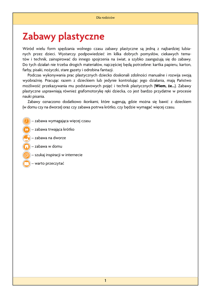 Dla rodziców Zabawy plastyczne Wśród wielu form spędzania wolnego czasu zabawy plastyczne są jedną z najbardziej lubianych przez dzieci. Wystarczy podpowiedzieć im kilka dobrych pomysłów, ciekawych tematów i technik, zainspirować do innego spojrzenia na świat, a szybko zaangażują się do zabawy. Do tych działań nie trzeba drogich materiałów, najczęściej będą potrzebne: kartka papieru, karton, farby, pisaki, nożyczki, stare gazety i odrobina fantazji. Podczas wykonywania prac plastycznych dziecko doskonali zdolności manualne i rozwija swoją wyobraźnię. Pracując razem z dzieckiem lub jedynie kontrolując jego działania, mają Państwo możliwość przekazywania mu podstawowych pojęć i technik plastycznych (Wiem, że...). Zabawy plastyczne usprawniają również grafomotorykę ręki dziecka, co jest bardzo przydatne w procesie nauki pisania. Zabawy oznaczono dodatkowo ikonkami, które sugerują, gdzie można się bawić z dzieckiem (w domu czy na dworze) oraz czy zabawa potrwa krótko, czy będzie wymagać więcej czasu. – zabawa wymagająca więcej czasu – zabawa trwająca krótko – zabawa na dworze – zabawa w domu – szukaj inspiracji w internecie – warto przeczytać 1 Dla rodziców • Zabawy plastyczne Zabawa 1. Jesienny krajobraz Jesień ze swym bogactwem kolorów inspiruje do plastycznych wyzwań. Niech Twoje dziecko spróbuje swych możliwości malarskich i namaluje jesienny krajobraz, eksperymentując z kolorami. Co przygotować? • • • • farby plakatowe; pędzle; woda w kubeczku; kartka i podkładka. Wiem, że… Krajobraz to inaczej widok terenu, wycinek przyrody; natomiast pejzaż – malarstwo krajobrazowe, inaczej pejzażowe – to także gatunek malarstwa obejmujący przedstawienia, których tematem jest widok natury. Jak to wykonać? 1. Zaproponuj dziecku, by popatrzyło na krajobraz przedstawiony na fotografii. Niech zwróci uwagę na to, co jest na pierwszym planie, a co w tle. 2.Po wyjściu z domu niech wybierze sobie miejsce i widok, który chce namalować. Zdj. Photogenica 3.Zrób zdjęcie pejzażu i poproś dziecko, by na jego podstawie namalowało swój obraz w domu. Można też – jeśli pogoda będzie odpowiednia – zachęcić dziecko, by spróbowało namalować pejzaż z natury. 4.Zwróć uwagę na to, czy dziecko potrafi korzystać z łączenia barw. Zasugeruj mu eksperymentowanie z kolorami. Wiem, że… Istnieją kolory podstawowe, są to: żółty, czerwony i niebieski. Inne można uzyskać przez mieszanie barw. Pomarańczowy uzyskuje się z połączenia kolorów czerwonego z żółtym, fioletowy – z czerwonego i niebieskiego, zielony – z niebieskiego i żółtego. 2 Dla rodziców • Zabawy plastyczne Zabawa 2. Kosmiczny pojazd Walorem pojazdu będzie jego niezwykłość, niepowtarzalność i proekologiczny charakter, ponieważ zostanie zrobiony z odpadów. Dzięki takim działaniom dzieci uczą się zachowań proekologicznych. Co przygotować? • • • • • butelka PET (najlepiej duża, plastikowa po napojach); szary papier; farby; klej; nożyczki. Jak to wykonać? 1. Poleć dziecku, by okleiło butelkę papierem. 2.Pomóż dziecku wyciąć z papieru skrzydła pojazdu. Niech naklei je na butelkę. 3.Następnie niech dziecko pomaluje wybrane przez siebie części pojazdu, np. skrzydła. Jak będzie wyglądał pojazd, co będzie robił i jak się poruszał, zależy od wyobraźni dziecka. Zabawa 3. Majsterkowanie – latawiec (wersja rysunku do wydrukowania znajduje się na końcu tego dokumentu) Co przygotować? • 2 stabilne, cienkie listewki; • 2 patyki; • papier kolorowy, krepina, bibuła lub folia; • farby lub mazaki wodoodporne; • sznurek, żyłka; • klej biurowy lub spinacze. Rys. Martyna Czekała Jak to wykonać? 1. Dwie dobrze przymocowane do siebie (zbite, skręcone lub solidnie związane), nacięte na końcówkach listewki (bambus lub nawet patyki) obwiążcie mocnym sznurkiem. Pomóż dziecku w konstrukcji, podpowiadając mu i wspierając go na tym etapie budowy latawca. 2.Taką konstrukcję oklejcie arkuszem kolorowej bibuły (folii lub nieprzemakalnego materiału), dokładnie podklejając (zszywając) na obrzeżach. 3.Następnie wręcz dziecku farby, pisaki lub mazaki wodoodporne (zależnie od zastosowanego pokrycia latawca) i pozwól mu na całkowitą samodzielność w ozdabianiu latawca. 4.Na koniec niech dziecko z Twoją pomocą doczepi ogon z kolorowymi kokardami (wykonanymi z krepiny). Zamocuj długą żyłkę (lub cienki mocny sznurek typu szpagat) do kontrolowania lotu. 5.Żyłkę nawiń na szpulę (lub prosty krzyżak wykonany z patyków) i teraz pozostaje tylko… czekać na dobry wiatr. 6.Możesz też zachęcić dziecko do pokolorowania latawca przedstawionego na rysunku. 3 Zabawa 4. Widok z okna Ta zabawa uczy uważnej obserwacji i dostrzegania szczegółów. Jak się bawić? 1. Przyjrzyj się razem z dzieckiem temu, co dzieje się za Waszym oknem. 2.Poproś, by dziecko namalowało swój obraz pt. Widok z okna twojego pokoju. 3.Porozmawiaj z nim na temat obrazu Stanisława Wyspiańskiego. Wiem, że… Stanisław Wyspiański to słynny polski artysta żyjący na przełomie XIX i XX w. Zdj. East News Stanisław Wyspiański, Widok z okna pracowni na Kopiec Kościuszki, 1904 4