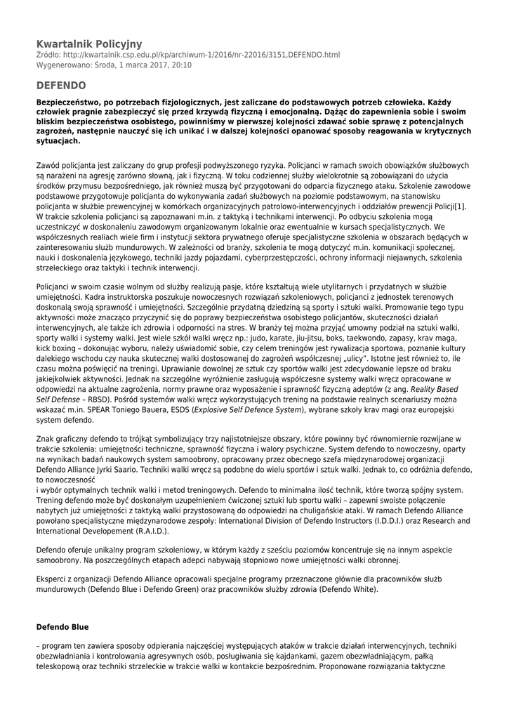 Kwartalnik Policyjny Źródło: http://kwartalnik.csp.edu.pl/kp/archiwum-1/2016/nr-22016/3151,DEFENDO.html Wygenerowano: Środa, 1 marca 2017, 20:10 DEFENDO Bezpieczeństwo, po potrzebach fizjologicznych, jest zaliczane do podstawowych potrzeb człowieka. Każdy człowiek pragnie zabezpieczyć się przed krzywdą fizyczną i emocjonalną. Dążąc do zapewnienia sobie i swoim bliskim bezpieczeństwa osobistego, powinniśmy w pierwszej kolejności zdawać sobie sprawę z potencjalnych zagrożeń, następnie nauczyć się ich unikać i w dalszej kolejności opanować sposoby reagowania w krytycznych sytuacjach. Zawód policjanta jest zaliczany do grup profesji podwyższonego ryzyka. Policjanci w ramach swoich obowiązków służbowych są narażeni na agresję zarówno słowną, jak i fizyczną. W toku codziennej służby wielokrotnie są zobowiązani do użycia środków przymusu bezpośredniego, jak również muszą być przygotowani do odparcia fizycznego ataku. Szkolenie zawodowe podstawowe przygotowuje policjanta do wykonywania zadań służbowych na poziomie podstawowym, na stanowisku policjanta w służbie prewencyjnej w komórkach organizacyjnych patrolowo-interwencyjnych i oddziałów prewencji Policji[1]. W trakcie szkolenia policjanci są zapoznawani m.in. z taktyką i technikami interwencji. Po odbyciu szkolenia mogą uczestniczyć w doskonaleniu zawodowym organizowanym lokalnie oraz ewentualnie w kursach specjalistycznych. We współczesnych realiach wiele firm i instytucji sektora prywatnego oferuje specjalistyczne szkolenia w obszarach będących w zainteresowaniu służb mundurowych. W zależności od branży, szkolenia te mogą dotyczyć m.in. komunikacji społecznej, nauki i doskonalenia językowego, techniki jazdy pojazdami, cyberprzestępczości, ochrony informacji niejawnych, szkolenia strzeleckiego oraz taktyki i technik interwencji. Policjanci w swoim czasie wolnym od służby realizują pasje, które kształtują wiele utylitarnych i przydatnych w służbie umiejętności. Kadra instruktorska poszukuje nowoczesnych rozwiązań szkoleniowych, policjanci z jednostek terenowych doskonalą swoją sprawność i umiejętności. Szczególnie przydatną dziedziną są sporty i sztuki walki. Promowanie tego typu aktywności może znacząco przyczynić się do poprawy bezpieczeństwa osobistego policjantów, skuteczności działań interwencyjnych, ale także ich zdrowia i odporności na stres. W branży tej można przyjąć umowny podział na sztuki walki, sporty walki i systemy walki. Jest wiele szkół walki wręcz np.: judo, karate, jiu-jitsu, boks, taekwondo, zapasy, krav maga, kick boxing – dokonując wyboru, należy uświadomić sobie, czy celem treningów jest rywalizacja sportowa, poznanie kultury dalekiego wschodu czy nauka skutecznej walki dostosowanej do zagrożeń współczesnej „ulicy”. Istotne jest również to, ile czasu można poświęcić na treningi. Uprawianie dowolnej ze sztuk czy sportów walki jest zdecydowanie lepsze od braku jakiejkolwiek aktywności. Jednak na szczególne wyróżnienie zasługują współczesne systemy walki wręcz opracowane w odpowiedzi na aktualne zagrożenia, normy prawne oraz wyposażenie i sprawność fizyczną adeptów (z ang. Reality Based Self Defense – RBSD). Pośród systemów walki wręcz wykorzystujących trening na podstawie realnych scenariuszy można wskazać m.in. SPEAR Toniego Bauera, ESDS (Explosive Self Defence System), wybrane szkoły krav magi oraz europejski system defendo. Znak graficzny defendo to trójkąt symbolizujący trzy najistotniejsze obszary, które powinny być równomiernie rozwijane w trakcie szkolenia: umiejętności techniczne, sprawność fizyczna i walory psychiczne. System defendo to nowoczesny, oparty na wynikach badań naukowych system samoobrony, opracowany przez obecnego szefa międzynarodowej organizacji Defendo Alliance Jyrki Saario. Techniki walki wręcz są podobne do wielu sportów i sztuk walki. Jednak to, co odróżnia defendo, to nowoczesność i wybór optymalnych technik walki i metod treningowych. Defendo to minimalna ilość technik, które tworzą spójny system. Trening defendo może być doskonałym uzupełnieniem ćwiczonej sztuki lub sportu walki – zapewni swoiste połączenie nabytych już umiejętności z taktyką walki przystosowaną do odpowiedzi na chuligańskie ataki. W ramach Defendo Alliance powołano specjalistyczne międzynarodowe zespoły: International Division of Defendo Instructors (I.D.D.I.) oraz Research and International Developement (R.A.I.D.). Defendo oferuje unikalny program szkoleniowy, w którym każdy z sześciu poziomów koncentruje się na innym aspekcie samoobrony. Na poszczególnych etapach adepci nabywają stopniowo nowe umiejętności walki obronnej. Eksperci z organizacji Defendo Alliance opracowali specjalne programy przeznaczone głównie dla pracowników służb mundurowych (Defendo Blue i Defendo Green) oraz pracowników służby zdrowia (Defendo White). Defendo Blue – program ten zawiera sposoby odpierania najczęściej występujących ataków w trakcie działań interwencyjnych, techniki obezwładniania i kontrolowania agresywnych osób, posługiwania się kajdankami, gazem obezwładniającym, pałką teleskopową oraz techniki strzeleckie w trakcie walki w kontakcie bezpośrednim. Proponowane rozwiązania taktyczne dotyczą działania służb ochrony podczas zabezpieczenia chronionych obiektów, interwencji w różnych miejscach przez służby policyjne, działań w warunkach ograniczonej wido-czności. Istotnym elementem programu jest umiejętność udzielania pomocy przedlekarskiej w różnych sytuacjach podczas podejmowanych interwencji. Defendo Green – program ten zawiera techniki walki w kontakcie bezpośrednim dla wojska z użyciem technik walki wręcz, użycie karabinka, pistoletu oraz noża w walce. Bazuje na podstawowych technikach DEFENDO. Techniki walki mają charakter ofensywny i defensywny. Istotnym elementem