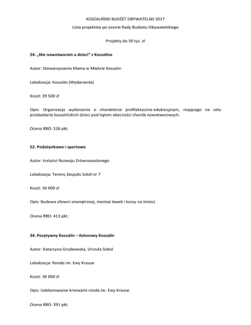 KOSZALIŃSKI BUDŻET OBYWATELSKI 2017 Lista projektów po ocenie Rady Budżetu Obywatelskiego Projekty do 50 tys. zł 24. „Nie nowotworom u dzieci” z Koszalina Autor: Stowarzyszenie Mama w Mieście Koszalin Lokalizacja: Koszalin (Wydarzenie) Koszt: 39 500 zł Opis: Organizacja wydarzenia o charakterze profilaktyczno-edukacyjnym, mającego na celu przebadanie koszalińskich dzieci pod kątem obecności chorób nowotworowych. Ocena RBO: 526 pkt. 52. Podożynkowo i sportowo Autor: Instytut Rozwoju Zrównoważonego Lokalizacja: Tereny Zespołu Szkół nr 7 Koszt: 50 000 zł Opis: Budowa siłowni zewnętrznej, montaż ławek i koszy na śmieci. Ocena RBO: 413 pkt. 34. Pozytywny Koszalin – Kolorowy Koszalin Autor: Katarzyna Grzybowska, Urszula Sobol Lokalizacja: Rondo im. Ewy Krause Koszt: 30 000 zł Opis: Udekorowanie krzewami ronda im. Ewy Krause. Ocena RBO: 391 pkt. 8. „Ostatnie dni na Pomorzu” inscenizacja historyczna Autor: Grupa „Projekt Kӧslin” Lokalizacja: Koszalin (Wydarzenie) Koszt: 45 000 zł Opis: Przedstawienie ostatnich dni 1945 roku na Pomorzu Zachodnim w formie inscenizacji historycznej. Ocena RBO: 377 pkt. 36. Mini Park Autor: Katarzyna Grzybowska, Emilian Górecki, Monika Mikołajczak, Agnieszka Jagodzińska, Marcin Waszkiewicz Lokalizacja: ul. Wenedów 11-15 Koszt: 50 000 zł Opis: Przebudowa placu zabaw wraz z wykonaniem nasadzeń. Ocena RBO: 373 pkt. 62. Rokosowo na sportowo Autor: Instytut Rozwoju Zrównoważonego Lokalizacja: Park przy pętli autobusowej, ul. Zwycięstwa (Rokosowo) Koszt: 23 800 zł Opis: Rozbudowa siłowni zewnętrznej. Ocena RBO: 339 pkt. 16. Kącik rekreacyjny Autor: Nauczyciele WF w ZS nr 8 Lokalizacja: ZS nr 8 ul. Morska Koszt: 43 790 zł Opis: Budowa siłowni zewnętrznej. Ocena RBO: 338 pkt. 46. Dojście piesze od centrum do szkoły – skrót dla młodzieży Autor: Andrzej Skarbek Lokalizacja: ul. gen. Wł. Andersa Koszt: 20 000 zł Opis: Budowa chodnika. Ocena RBO: 330 pkt. 47. Dojście do „zebry” przez jezdnię przy muzeum od strony przerwy w murze od strony starego miasta Autor: Andrzej Skarbek Lokalizacja: ul. Podgrodzie Koszt: 30 000 zł Opis: Budowa chodnika. Ocena RBO: 328 pkt. 64. Łuk Tęczy Autor: Instytut Rozwoju Zrównoważonego Lokalizacja: ul. Bajkowa Koszt: 5 000 zł Opis: Budowa chodnika. Ocena RBO: 328 Projekty do 500 tys. zł 13. Park doświadczeń Clausiusa Autor: Samorząd Szkolny Zespołu Szkół nr 1 Lokalizacja: Okolica Obserwatorium Astronomicznego Koszalin Koszt: 80 000 zł Opis: Zakup i montaż urządzeń pozwalających na obserwację zjawisk fizycznych. Ocena RBO: 567 pkt. 66. Lochy Rycerskiej Radochy – w podróży do średniowiecza… Autor: Koszalińska Kompania Rycerska Lokalizacja: ul. Pileckiego 13 Koszt: 396 000 zł Opis: Stworzenie przedsięwzięcia edukacyjnego, miejsca edukacji historycznej. Ocena RBO: 485 pkt. 29. „Bez barier” Karuzela dla dzieci niepełnosprawnych na ogólnodostępnym placu zabaw Autor: Stowarzyszenie „Młodzi Demokraci” Koszalin Lokalizacja: Sportowa Dolina Koszt: 90 000 zł Opis: Instalacja karuzeli dla osób niepełnosprawnych Ocena RBO: 471 pkt. 37. City Golf Koszalin – 18 dołkowe pole do gry w mini golfa – zabawa i atrakcja dla wszystkich mieszkańców Koszalina Autor: Forum Rozwoju Koszalina, Katarzyna Faryniarz Lokalizacja: Koszt: 250 000 zł Opis: Budowa pola do gry w mini golfa. Ocena RBO: 458 pkt. 12. 3 legendarne mosiężne figurki i ławka z autorem legend – Gracjanem Bojarem-Fijałkowskim… Autor: Włodzimierz Deluga, Małgorzata Czerwińska, Ewa Kasperska Lokalizacja: Centrum Koszalina (CK 105, Domek Kata…) Koszt: 470 000 zł Opis: Rozmieszczenie na terenie miasta 3 figur nawiązujących do koszalińskich legend (wraz z tablicami informacyjnymi) oraz ławeczki z podobizną autora legend – Gracjana Bojara-Fijałkowskiego. Ocena RBO: 452 pkt. 41. Mobilne Muzeum – aplikacja na smartfony ze zdjęciami i historią Starego Koszalina… Autor: Forum Rozwoju Koszalina Lokalizacja: Aplikacja Mobilna Koszt: 60 000 zł Opis: Stworzenie aplikacji na urządzenia mobilne, umożliwiającej oglądanie zdjęć starego Koszalina. Ocena RBO: 435 pkt. 65. Park Robin Hooda – postrzelony Koszalin Autor: Koszalińska Kompania Rycerska Lokalizacja: ul. Tadeusza Mazowieckiego (przy Dzierżęcince) Koszt: 450 000 zł Opis: Budowa parku atrakcji łuczniczych wraz z torem łuczniczym. Ocena RBO: 434 pkt. 26. Nowe przystanki autobusowe dla Koszalina Autor: Stowarzyszenie Miłośników Komunikacji Miejskiej w Koszalinie, Stowarzyszenie „Młodzi Demokraci” Koszalin Lokalizacja: 20 przystanków na terenie Koszalina Koszt: 500 000 zł Opis: Modernizacja wiat przystankowych. Ocena RBO: 428 pkt. 42. 3 oryginalne ławki w różnych częściach miasta nawiązujące kształtem do miejsca… Autor: Forum Rozwoju Koszalina Lokalizacja: Śródmieście Koszalina Koszt: 300 000 zł Opis: Zakup i montaż 3 charakterystycznych ławek. Ocena RBO: 404 pkt. 67. Zagospodarowanie terenu przy ul. Emilii Gierczak – Integracja Dorosłych, Młodzieży i Dzieci Autor: Rada Osiedla „Na Skarpie” Lokalizacja: ul. Emilii Gierczak Koszt: 500 000 zł Opis: Zagospodarowanie terenu na cele sportowo-rekreacyjne. Ocena RBO: 381 pkt. Opracowanie: Andrzej Fulbiszewski