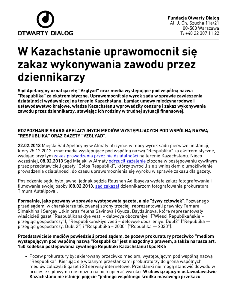 innych gazet. W odpowiedzi prokuratura dla rejonu medeuskiego w Almaty nie ustosunkowała się