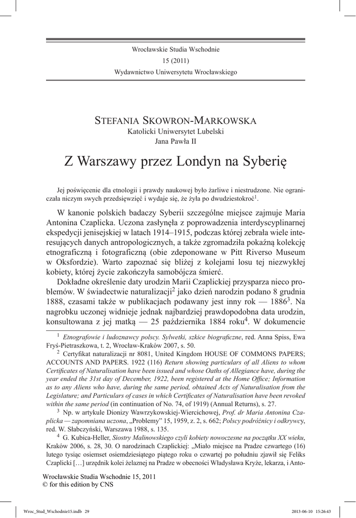 Wrocławskie Studia Wschodnie 15 (2011) Wydawnictwo Uniwersytetu Wrocławskiego Stefania Skowron-Markowska Katolicki Uniwersytet Lubelski Jana Pawła II Z Warszawy przez Londyn na Syberię Jej poświęcenie dla etnologii i prawdy naukowej było żarliwe i niestrudzone. Nie ograniczała niczym swych przedsięwzięć i wydaje się, że żyła po dwudziestokroć1. W kanonie polskich badaczy Syberii szczególne miejsce zajmuje Maria Antonina Czaplicka. Uczona zasłynęła z poprowadzenia interdyscyplinarnej ekspedycji jenisejskiej w latach 1914–1915, podczas której zebrała wiele interesujących danych antropologicznych, a także zgromadziła pokaźną kolekcję etnograficzną i fotograficzną (obie zdeponowane w Pitt Riverso Museum w Oksfordzie). Warto zapoznać się bliżej z kolejami losu tej niezwykłej kobiety, której życie zakończyła samobójcza śmierć. Dokładne określenie daty urodzin Marii Czaplickiej przysparza nieco problemów. W świadectwie naturalizacji2 jako dzień narodzin podano 8 grudnia 1888, czasami także w publikacjach podawany jest inny rok — 18863. Na nagrobku uczonej widnieje jednak najbardziej prawdopodobna data urodzin, konsultowana z jej matką — 25 października 1884 roku4. W dokumencie 1 Etnografowie i ludoznawcy polscy. Sylwetki, szkice biograficzne, red. Anna Spiss, Ewa Fryś-Pietraszkowa, t. 2, Wrocław-Kraków 2007, s. 50. 2 Certyfikat naturalizacji nr 8081, United Kingdom HOUSE OF COMMONS PAPERS; ACCOUNTS AND PAPERS. 1922 (116) Return showing particulars of all Aliens to whom Certificates of Naturalisation have been issued and whose Oaths of Allegiance have, during the year ended the 31st day of December, 1922, been registered at the Home Office; Information as to any Aliens who have, during the same period, obtained Acts of Naturalisation from the Legislature; and Particulars of cases in which Certificates of Naturalisation have been revoked within the same period (in continuation of No. 74, of 1919) (Annual Returns), s. 27. 3 Np. w artykule Dionizy Wawrzykowskiej-Wiercichowej, Prof. dr Maria Antonina Czaplicka — zapomniana uczona, „Problemy” 15, 1959, z. 2, s. 662; Polscy podróżnicy i odkrywcy, red. W. Słabczyński, Warszawa 1988, s. 135. 4 G. Kubica-Heller, Siostry Malinowskiego czyli kobiety nowoczesne na początku XX wieku, Kraków 2006, s. 28, 30. O narodzinach Czaplickiej: „Miało miejsce na Pradze czwartego (16) lutego tysiąc osiemset osiemdziesiątego piątego roku o czwartej po południu zjawił się Feliks Czaplicki […] urzędnik kolei żelaznej na Pradze w obecności Władysława Kryże, lekarza, i AntoWrocławskie Studia Wschodnie 15, 2011 © for this edition by CNS Wroc_Stud_Wschodnie15.indb 29 2013-06-10 15:26:43 30 Stefania Skowron-Markowska naturalizacji Czaplicka podała jako miejsce swojego urodzenia Starą Pragę w Warszawie. Ojcem Marii był Feliks Czaplicki, herbu Lubicz, naczelnik dworca terespolskiego na Pradze. Wiadomo, że wkładał wiele wysiłku w utrzymanie rodziny, ale mimo wszystko „niedostatek często zaglądał do domu rodzinnego młodziutkiej Marii”5. Matką Czaplickej była Zofia z domu Zawisza. Maria miała dwie siostry i brata — Eugenię (imię drugiej nieznane) i Stanisława. O Eugenii wiemy niewiele — wyszła za mąż i miała troje dzieci, starszy brat zaś pracował jako lekarz „na Górkach” koło Wołomina6. W okresie międzywojennym był radnym7. Pierwsze lata edukacji Czaplickiej to pensja Anny Jasińskiej w Warszawie. Następnym etapem edukacji były kursy „Latającego Uniwersytetu”, pedagogiki i metodyki u Anieli Szycówny. W 1904 roku rodzina Czaplickich przenosi się do Lipawy (dziś Łotwa). Tam Maria zdała maturę i egzamin nauczycielski z geografii. Po powrocie do Warszawy w 1906 roku kontynuowała naukę na pensji Ż. Łabusiewiczówny, uczestniczyła także w kursach legalnie już działającego Towarzystwa Kursów Naukowych8. W roku 1910 dzięki stypendium Kasy im. J. Mianowskiego Czaplicka wyjechała do Londynu. Nie był to dla niej łatwy okres. Wspominała podróż i początkowe trudności w listach do Władysława Orkana: Drogę miałam rozmaitą. Niemcy wstrętne są i na każdym kroku mało uprzejma formalistyka. Smutno i obco było. Bliżej granicy angielskiej lżej jakoś. Zupełnie jak jakaś druga ojczyzna. Za to jednak musiałam wskutek burzy zamiast 6, spędzić 12 godzin na szalonych falach i chorowałam tak strasznie przykro, że dotąd nie mogę zapomnieć. Dziwne, że inne […] mi nie szkodziły. Mam językową trudność, ale to nic. Nadto zimno w pokoiku mam i jedzenie także inne. Ale to nic9. Tu początkowo studiowała w Bedford Women College, pod kierownictwem Seligmana rozpoczynając studia etnologiczne. Następnie przez krótki okres uczęszczała do London School of Economics, prestiżowej londyńskiej uczelni. Seligman, widząc zamiłowanie i chęć nauki u młodej Polki, zarekomendował ją wraz z R.R. Marettem w Oksfordzie i przyjęto Czaplicką do Somerville College. Tu także uzyskała swój dyplom z antropologii w roku na Stankiewicza z Pragi, okazać matkę niemowlęcia żeńskiej płci, oświadczając, że urodziła ona na Pradze trzynastego (dwudziestego piątego) października ubiegłego roku o drugiej po południu, prawowita żona jego Zofia z Zawiszów w dwudziestym szóstym roku życia. Niemowlęciu temu przy świętym chrzcie nadano imiona Maria Antonina Krystyna, a świadkami byli Władysław Kryże i Franciszka Dymowska. Akt ten przez obecnych przeczytany. Przez nas i obecnych podpisany”. 5 D. Wawrzykowska-Wiercichowa, op. cit., s. 662. 6 G. Kubica-Heller, op. cit., s. 29. 7 Etnografowie i ludoznawcy polscy…, s. 47. 8 Ibidem, s. 47–48, hasło Maria Antonina Czaplicka. 9 List M. Czaplickiej do W. Orkana z dnia 4 listopada 1910, Londyn WC Sonningham Square. Korespondencja do Orkana ze zbiorów Biblioteki Jagiellońskiej. Wrocławskie Studia Wschodnie 15, 2011 © for this edition by CNS Wroc_Stud_Wschodnie15.indb 30 