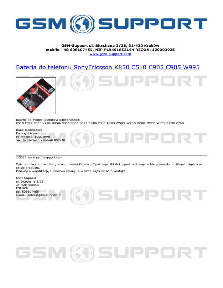 GSM-Support ul. Bitschana 2/38, 31-420 Kraków mobile +48 608107455, NIP PL9451852164 REGON: 120203925 www.gsm-support.com Bateria do telefonu SonyEricsson K850 C510 C905 C905 W995 Bateria do modeli telefonów SonyEricsson: C510 C902 C905 K770i K850i R300 R306 S312 S500i T303 T650i W580i W760i W902 W980 W995 Z770i Z780 Dane techniczne: Rodzaj: Li-ion Pojemność: 1000 mAh Jest to zamiennik baterii BST-38 ©2012 www.gsm-support.com Opis ten nie stanowi oferty w rozumieniu Kodeksu Cywilnego. GSM-Support zastrzega sobie prawo do możliwych błędów w opisie produktu. Prosimy o weryfikację z Państwa strony, a w razie wątpliwości o kontakt. GSM-Support ul. Bitschana 2/38 31-420 Kraków POLSKA tel. 608107455 e-mail: [email protected] Powered by TCPDF (www.tcpdf.org)