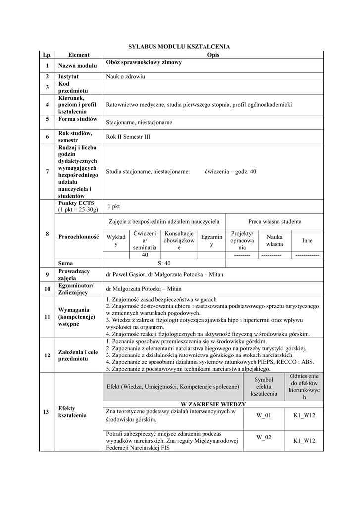 Lp. Element 1 Nazwa modułu 2 Instytut Kod przedmiotu Kierunek, poziom i profil kształcenia Forma studiów 3 4 5 6 7 Rok studiów, semestr Rodzaj i liczba godzin dydaktycznych wymagających bezpośredniego udziału nauczyciela i studentów Punkty ECTS (1 pkt = 25-30g) SYLABUS MODUŁU KSZTAŁCENIA Opis Obóz sprawnościowy zimowy Nauk o zdrowiu Ratownictwo medyczne, studia pierwszego stopnia, profil ogólnoakademicki Stacjonarne, niestacjonarne Rok II Semestr III Studia stacjonarne, niestacjonarne: ćwiczenia – godz. 40 1 pkt Zajęcia z bezpośrednim udziałem nauczyciela 8 9 10 Pracochłonność Suma Prowadzący zajęcia Egzaminator/ Zaliczający 11 Wymagania (kompetencje) wstępne 12 Założenia i cele przedmiotu 13 Efekty kształcenia Wykład y Ćwiczeni a/ seminaria 40 Konsultacje obowiązkow e Egzamin y Praca własna studenta Projekty/ opracowa nia -------- Nauka własna ---------- Inne ------------ S: 40 dr Paweł Gąsior, dr Małgorzata Potocka – Mitan dr Małgorzata Potocka – Mitan 1. Znajomość zasad bezpieczeństwa w górach 2. Znajomość dostosowania ubioru i zastosowania podstawowego sprzętu turystycznego w zmiennych warunkach pogodowych. 3. Wiedza z zakresu fizjologii dotycząca zjawiska hipo i hipertermii oraz wpływu wysokości na organizm. 4. Znajomość reakcji fizjologicznych na aktywność fizyczną w środowisku górskim. 1. Poznanie sposobów przemieszczania się w środowisku górskim. 2. Zapoznanie z elementami narciarstwa biegowego na potrzeby turystyki górskiej. 3. Zapoznanie z działalnością ratownictwa górskiego na stokach narciarskich. 4. Zapoznanie ze sposobami działania systemów ratunkowych PIEPS, RECCO i ABS. 5. Zapoznanie z podstawowymi technikami narciarstwa alpejskiego. Odniesienie Symbol do efektów Efekt (Wiedza, Umiejętności, Kompetencje społeczne) efektu kierunkowyc kształcenia h W ZAKRESIE WIEDZY Zna teoretyczne podstawy działań interwencyjnych w W_01 K1_W12 środowisku górskim. Potrafi zabezpieczyć miejsce zdarzenia podczas wypadków narciarskich. Zna reguły Międzynarodowej Federacji Narciarskiej FIS W_02 K1_W12 W ZAKRESIE UMIEJĘTNOŚCI Potrafi zidentyfikować czynniki zagrażające bezpieczeństwu osób w górach. U_01 Zna zasady transportu poszkodowanych w warunkach górskich. U_02 Potrafi bezpiecznie przemieszczać się w środowisku górskim za pomocą zróżnicowanego sprzętu. U_03 Zna wpływ niskiej i wysokiej temperatury na organizm człowieka U_04 Potrafi przemieszczać się w terenie górskim koordynując zachowanie grupy podczas zmiennych warunków. U_05 Potrafi poruszać się na nartach biegowych i zjazdowych. U_06 W ZAKRESIE KOMPETENCJI SPOŁECZNYCH Współdziała w grupie podczas marszów terenowych w środowisku górskim. KS_01 Potrafi podjąć aktywność fizyczną w trudnym terenie z wykorzystaniem sprzętu ratowniczego i do przemieszczania się. Troszczy się o innych podczas marszów górskich Efekt kształcenia 14 Forma i warunki potwierdzenia efektu kształcenia W_01, W_02, U_04 U_01, U_02, U_03, U_05, U_06 KS_01, KS_02, KS_03 15 Stosowane metody dydaktyczne K1_U01 K1_U02, K1_U50, K1_U68, K1_U69 K1_U37, K1_U50, K1_U69 K1_U43 K1_U45 K1_U51 K1_U70 K1_K04 KS_02 K1_K09 K1_K10 KS_03 K1_K11 Sposób potwierdzenia (weryfikacji) Kolokwium zaliczeniowe Sprawdzian praktyczny Obserwacja przez prowadzących potwierdzona na karcie obserwacji. W nauczaniu ruchu: syntetyczna i analityczna, metody odtwórcze i aktywizujące. W przekazywaniu wiedzy: wykład, dyskusja, prelekcja 1. Zasady doboru odzieży do panujących warunków górskich. 2. Zasady posługiwania się systemem GPS i mapą. 3. Zasady doboru sprzętu narciarskiego (biegowego i zjazdowego). 4. Podstawowe techniki przemieszczania się na nartach biegowych: bezkrok krok naprzemianstronny 5. Podstawowe techniki narciarstwa zjazdowego 16 Treści merytoryczne przedmiotu podchodzenie i poruszanie się po terenie płaskim pozycja płużna łuki płużne skręt z pługu skręt równoległy NW 6. Zasady poruszania się w środowisku górskim w warunkach zimowych. 7. Działanie systemów PIEPS, ABS i RECCO 8. Transport poszkodowanych w warunkach górskich 9. Marsz na azymut z wykorzystaniem mapy. Forma i warunki zaliczenia modułu, w tym zasady dopuszczenia do egzaminu /zaliczenia 1. Obecności na obozie i czynny udział w 80% zajęć. 2. Demonstracja podstawowych elementów technicznych z narciarstwa biegowego i alpejskiego. 3. Zaliczenie kolokwium. 18 Wykaz literatury podstawowej 1. Krasicki Sz. Narciarstwo biegowe. AWF. Kraków, 1994. 2. Czopik J., Pasławska M.: Narciarstwo, zapobieganie urazom, udzielanie pierwszej pomocy, rady trenera, Wyd. PZWL, Warszawa 2011 3. Held. H. (red): Uczę jazdy na nartach. Wyd. Galaktyka, Warszawa 2000. 4. Program Nauczania Narciarstwa. Stowarzyszenie Instruktorów i Trenerów Narciarstwa PZN, Kraków 2008. 5. Kacperek M. Kochaj śnieg unikaj lawin. TPN, Zakopane 2005. 6. Mrozowicz K., Halemba P. Ratownictwo górskie, psychologiczne i organizacyjne aspekty zarządzania bezpieczeństwem w górach. AWF. Katowice 2012. 19 Wykaz literatury uzupełniającej (pomocniczej) 17