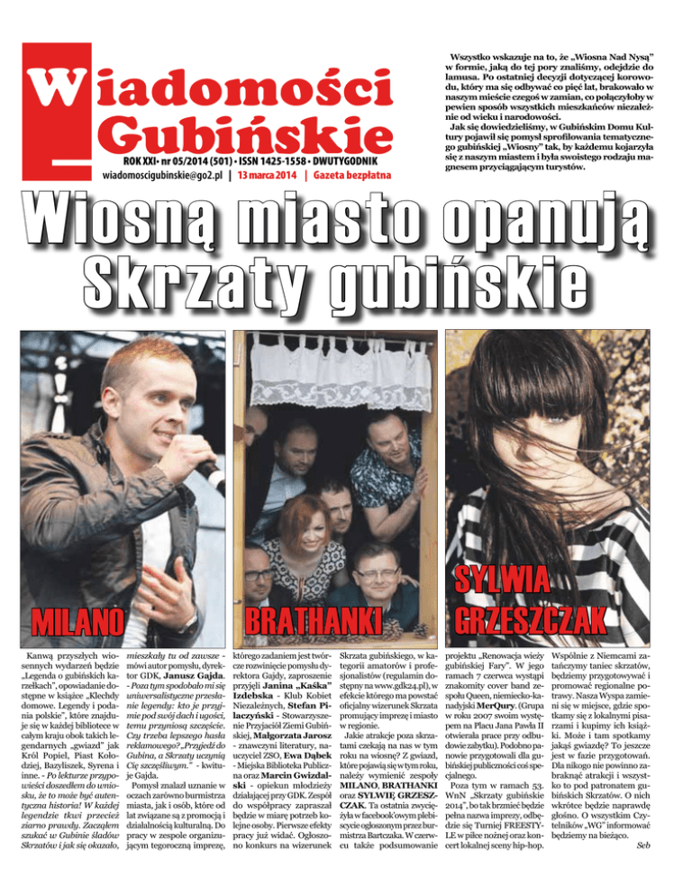 W iadomości _ Gubińskie . . . ROK XXI nr 05/2014 (501) ISSN 1425-1558 DWUTYGODNIK [email protected] | 13 marca 2014 | Gazeta bezpłatna Wszystko wskazuje na to, że „Wiosna Nad Nysą” w formie, jaką do tej pory znaliśmy, odejdzie do lamusa. Po ostatniej decyzji dotyczącej korowodu, który ma się odbywać co pięć lat, brakowało w naszym mieście czegoś w zamian, co połączyłoby w pewien sposób wszystkich mieszkańców niezależnie od wieku i narodowości. Jak się dowiedzieliśmy, w Gubińskim Domu Kultury pojawił się pomysł sprofilowania tematycznego gubińskiej „Wiosny” tak, by każdemu kojarzyła się z naszym miastem i była swoistego rodzaju magnesem przyciągającym turystów. Wiosną miasto opanują Skrzaty gubińskie BRATHANKI MILANO Kanwą przyszłych wiosennych wydarzeń będzie „Legenda o gubińskich karzełkach”, opowiadanie dostępne w książce „Klechdy domowe. Legendy i podania polskie”, które znajduje się w każdej bibliotece w całym kraju obok takich legendarnych „gwiazd” jak Król Popiel, Piast Kołodziej, Bazyliszek, Syrena i inne. - Po lekturze przypowieści doszedłem do wniosku, że to może być autentyczna historia! W każdej legendzie tkwi przecież ziarno prawdy. Zacząłem szukać w Gubinie śladów Skrzatów i jak się okazało, mieszkały tu od zawsze mówi autor pomysłu, dyrektor GDK, Janusz Gajda. - Poza tym spodobało mi się uniwersalistyczne przesłanie legendy: kto je przyjmie pod swój dach i ugości, temu przyniosą szczęście. Czy trzeba lepszego hasła reklamowego? „Przyjedź do Gubina, a Skrzaty uczynią Cię szczęśliwym.” - kwituje Gajda. Pomysł znalazł uznanie w oczach zarówno burmistrza miasta, jak i osób, które od lat związane są z promocją i działalnością kulturalną. Do pracy w zespole organizującym tegoroczną imprezę, którego zadaniem jest twórcze rozwinięcie pomysłu dyrektora Gajdy, zaproszenie przyjęli Janina „Kaśka” Izdebska - Klub Kobiet Niezależnych, Stefan Pilaczyński - Stowarzyszenie Przyjaciół Ziemi Gubińskiej, Małgorzata Jarosz - znawczyni literatury, nauczyciel ZSO, Ewa Dąbek - Miejska Biblioteka Publiczna oraz Marcin Gwizdalski - opiekun młodzieży działającej przy GDK. Zespół do współpracy zapraszał będzie w miarę potrzeb kolejne osoby. Pierwsze efekty pracy już widać. Ogłoszono konkurs na wizerunek Skrzata gubińskiego, w kategorii amatorów i profesjonalistów (regulamin dostępny na www.gdk24.pl), w efekcie którego ma powstać oficjalny wizerunek Skrzata promujący imprezę i miasto w regionie. Jakie atrakcje poza skrzatami czekają na nas w tym roku na wiosnę? Z gwiazd, które pojawią się w tym roku, należy wymienić zespoły MILANO, BRATHANKI oraz SYLWIĘ GRZESZCZAK. Ta ostatnia zwyciężyła w facebook’owym plebiscycie ogłoszonym przez burmistrza Bartczaka. W czerwcu także podsumowanie SYLWIA GRZESZCZAK projektu „Renowacja wieży gubińskiej Fary”. W jego ramach 7 czerwca wystąpi znakomity cover band zespołu Queen, niemiecko-kanadyjski MerQury. (Grupa w roku 2007 swoim występem na Placu Jana Pawła II otwierała prace przy odbudowie zabytku). Podobno panowie przygotowali dla gubińskiej publiczności coś specjalnego. Poza tym w ramach 53. WnN „Skrzaty gubińskie 2014”, bo tak brzmieć będzie pełna nazwa imprezy, odbędzie się Turniej FREESTYLE w piłce nożnej oraz koncert lokalnej sceny hip-hop. Wspólnie z Niemcami zatańczymy taniec skrzatów, będziemy przygotowywać i promować regionalne potrawy. Nasza Wyspa zamieni się w miejsce, gdzie spotkamy się z lokalnymi pisarzami i kupimy ich książki. Może i tam spotkamy jakąś gwiazdę? To jeszcze jest w fazie przygotowań. Dla nikogo nie powinno zabraknąć atrakcji i wszystko to pod patronatem gubińskich Skrzatów. O nich wkrótce będzie naprawdę głośno. O wszystkim Czytelników „WG” informować będziemy na bieżąco. Seb 2 W iadomości __Gubińskie Z magistratu W Guben czekają na polskich pacjentów! Zaletą członkostwa Polski w Unii Europejskiej jest możliwość leczenia się poza granicami kraju. Dlatego warto poinformować o ofercie szpitala i przychodni w Guben. Od 25 października ubiegłego roku w państwach Unii działa medyczna strefa Schengen. Oznacza to, że mieszkańcy Gubina mogą zainteresować się usługami, które znajdziemy po doktor Leszek Lacheta, który jest szefem przychodni. – Z kolei pacjent ubezpieczony w Polsce powinien przyjść do nas z dowodem osobistym i Europejską Kartą Ubezpieczenia Zdrowotnego, którą można wyrobić w Narodowym Funduszu Zdrowia. Przychodnia oprócz leczenia u laryngologa, kardiologa i internisty oferuje także szeroki wachlarz diagnostyki: USG, RTG, badania spirometryczne i EKG. Czekamy na pacjentów z Polski - zapewnia personel przychodni i szpitala w Guben drugiej stronie Nysy Łużyckiej, w Naëmi-Wilke-Stift. I to właśnie w tym szpitalu odbyło się kolejne spotkanie dyrekcji placówki z burmistrzem Bartłomiejem Bartczakiem. – W przypadku, gdy pacjent jest zatrudniony w Niemczech leczenie odbywa się automatycznie – wytłumaczył Zaznaczyć trzeba, że wśród personelu znajdziemy osoby mówiące w języku polskim. – Szpital wspiera przychodnię doskonałymi oddziałami: internistycznym, chirurgicznym i ortopedycznym – stwierdził dyrektor placówki Gotfried Hein. – Ponadto posiadamy specjalistyczny sprzęt do badań: rezonans magnetyczny, tomograf komputerowy i inne. Co nas zniechęca do służby zdrowia w Polsce? Z pewnością kolejki. Czasami oczekiwanie na zabieg lub badanie trwa od kilku do kilkunastu miesięcy. Inaczej jest w Guben. – Tutaj kolejek praktycznie nie ma – wyjaśnił B. Bartczak. – Po tym co się stało z powiatowym szpitalem w Gubinie trzeba szukać rozwiązań, aby nasi mieszkańcy mogli korzystać ze szpitala w Guben. Bardzo ważnym aspektem całej sprawy są finanse. Leczenie ambulatoryjne odbywa się bez kosztów po stronie pacjenta, trzeba m