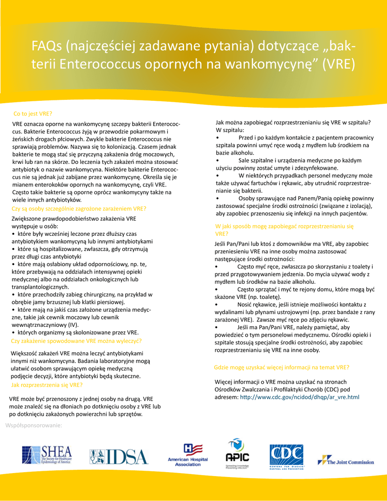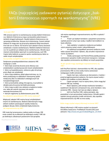 FAQs (najczęściej zadawane pytania) dotyczące „bakterii Enterococcus opornych na wankomycynę” (VRE) Co to jest VRE? VRE oznacza oporne na wankomycynę szczepy bakterii Enterococcus. Bakterie Enterococcus żyją w przewodzie pokarmowym i żeńskich drogach płciowych. Zwykle bakterie Enterococcus nie sprawiają problemów. Nazywa się to kolonizacją. Czasem jednak bakterie te mogą stać się przyczyną zakażenia dróg moczowych, krwi lub ran na skórze. Do leczenia tych zakażeń można stosować antybiotyk o nazwie wankomycyna. Niektóre bakterie Enterococcus nie są jednak już zabijane przez wankomycynę. Określa się je mianem enterokoków opornych na wankomycynę, czyli VRE. Często takie bakterie są oporne oprócz wankomycyny także na wiele innych antybiotyków. Czy są osoby szczególnie zagrożone zarażeniem VRE? Zwiększone prawdopodobieństwo zakażenia VRE występuje u osób: • które były wcześniej leczone przez dłuższy czas antybiotykiem wankomycyną lub innymi antybiotykami • które są hospitalizowane, zwłaszcza, gdy otrzymują przez długi czas antybiotyki • które mają osłabiony układ odpornościowy, np. te, które przebywają na oddziałach intensywnej opieki medycznej albo na oddziałach onkologicznych lub transplantologicznych. • które przechodziły zabieg chirurgiczny, na przykład w obrębie jamy brzusznej lub klatki piersiowej. • które mają na jakiś czas założone urządzenia medyczne, takie jak cewnik moczowy lub cewnik wewnątrznaczyniowy (IV). • których organizmy są skolonizowane przez VRE. Czy zakażenie spowodowane VRE można wyleczyć? Większość zakażeń VRE można leczyć antybiotykami innymi niż wankomycyna. Badania laboratoryjne mogą ułatwić osobom sprawującym opiekę medyczną podjęcie decyzji, które antybiotyki będą skuteczne. Jak rozprzestrzenia się VRE? VRE może być przenoszony z jednej osoby na drugą. VRE może znaleźć się na dłoniach po dotknięciu osoby z VRE lub po dotknięciu zakażonych powierzchni lub sprzętów. Współsponsorowanie: Jak można zapobiegać rozprzestrzenianiu się VRE w szpitalu? W szpitalu: • Przed i po każdym kontakcie z pacjentem pracownicy szpitala powinni umyć ręce wodą z mydłem lub środkiem na bazie alkoholu. • Sale szpitalne i urządzenia medyczne po każdym użyciu powinny zostać umyte i zdezynfekowane. • W niektórych przypadkach personel medyczny może także używać fartuchów i rękawic, aby utrudnić rozprzestrzenianie się bakterii. • Osoby sprawujące nad Panem/Panią opiekę powinny zastosować specjalne środki ostrożności (związane z izolacją), aby zapobiec przenoszeniu się infekcji na innych pacjentów. W jaki sposób mogę zapobiegać rozprzestrzenianiu się VRE? Jeśli Pan/Pani lub ktoś z domowników ma VRE, aby zapobiec przeniesieniu VRE na inne osoby można zastosować następujące środki ostrożności: • Często myć ręce, zwłaszcza po skorzystaniu z toalety i przed przygotowywaniem jedzenia. Do mycia używać wody z mydłem lub środków na bazie alkoholu. • Często sprzątać i myć te rejony domu, które mogą być skażone VRE (np. toaletę). • Nosić rękawice, jeśli istnieje możliwości kontaktu z wydalinami lub płynami ustrojowymi (np. przez bandaże z rany zarażonej VRE). Zawsze myć ręce po zdjęciu rękawic. • Jeśli ma Pan/Pani VRE, należy pamiętać, aby powiedzieć o tym personelowi medycznemu. Ośrodki opieki i szpitale stosują specjalne środki ostrożności, aby zapobiec rozprzestrzenianiu się VRE na inne osoby. Gdzie mogę uzyskać więcej informacji na temat VRE? Więcej informacji o VRE można uzyskać na stronach Ośrodków Zwalczania i Profilaktyki Chorób (CDC) pod adresem: http://www.cdc.gov/ncidod/dhqp/ar_vre.html