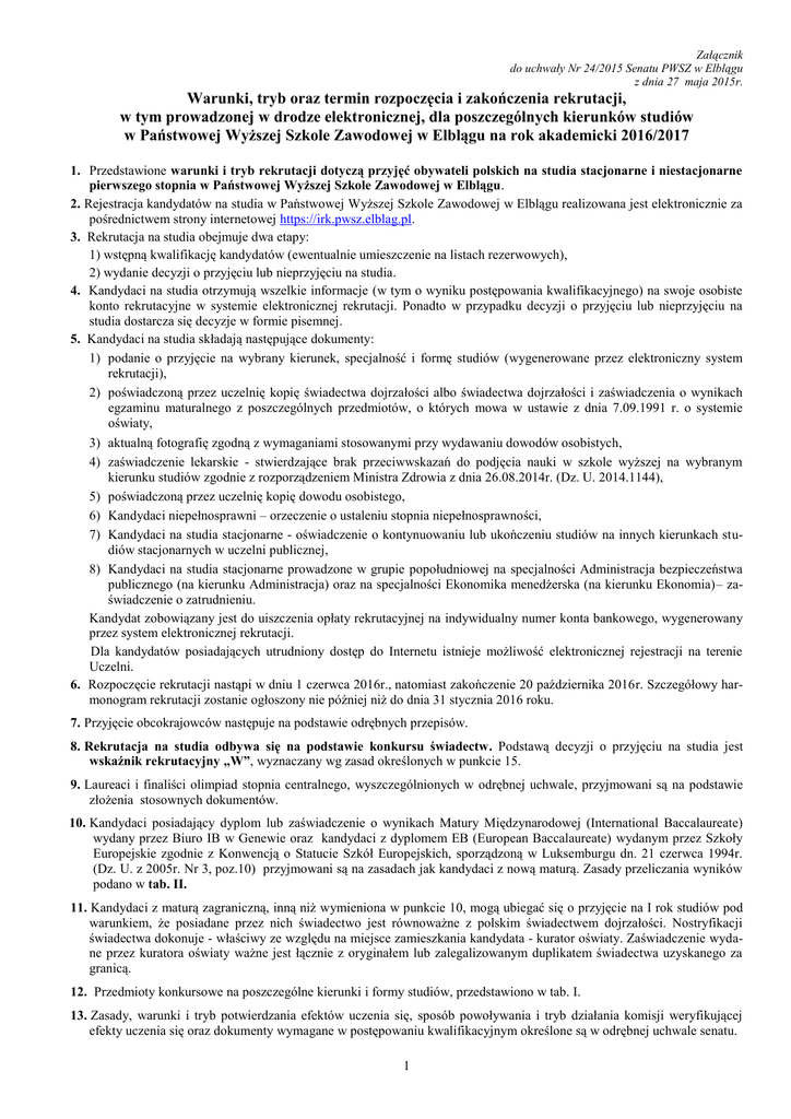 Załącznik do uchwały Nr 24/2015 Senatu PWSZ w Elblągu z dnia 27 maja 2015r. Warunki, tryb oraz termin rozpoczęcia i zakończenia rekrutacji, w tym prowadzonej w drodze elektronicznej, dla poszczególnych kierunków studiów w Państwowej Wyższej Szkole Zawodowej w Elblągu na rok akademicki 2016/2017 1. Przedstawione warunki i tryb rekrutacji dotyczą przyjęć obywateli polskich na studia stacjonarne i niestacjonarne pierwszego stopnia w Państwowej Wyższej Szkole Zawodowej w Elblągu. 2. Rejestracja kandydatów na studia w Państwowej Wyższej Szkole Zawodowej w Elblągu realizowana jest elektronicznie za pośrednictwem strony internetowej https://irk.pwsz.elblag.pl. 3. Rekrutacja na studia obejmuje dwa etapy: 1) wstępną kwalifikację kandydatów (ewentualnie umieszczenie na listach rezerwowych), 2) wydanie decyzji o przyjęciu lub nieprzyjęciu na studia. 4. Kandydaci na studia otrzymują wszelkie informacje (w tym o wyniku postępowania kwalifikacyjnego) na swoje osobiste konto rekrutacyjne w systemie elektronicznej rekrutacji. Ponadto w przypadku decyzji o przyjęciu lub nieprzyjęciu na studia dostarcza się decyzje w formie pisemnej. 5. Kandydaci na studia składają następujące dokumenty: 1) podanie o przyjęcie na wybrany kierunek, specjalność i formę studiów (wygenerowane przez elektroniczny system rekrutacji), 2) poświadczoną przez uczelnię kopię świadectwa dojrzałości albo świadectwa dojrzałości i zaświadczenia o wynikach egzaminu maturalnego z poszczególnych przedmiotów, o których mowa w ustawie z dnia 7.09.1991 r. o systemie oświaty, 3) aktualną fotografię zgodną z wymaganiami stosowanymi przy wydawaniu dowodów osobistych, 4) zaświadczenie lekarskie - stwierdzające brak przeciwwskazań do podjęcia nauki w szkole wyższej na wybranym kierunku studiów zgodnie z rozporządzeniem Ministra Zdrowia z dnia 26.08.2014r. (Dz. U. 2014.1144), 5) poświadczoną przez uczelnię kopię dowodu osobistego, 6) Kandydaci niepełnosprawni – orzeczenie o ustaleniu stopnia niepełnosprawności, 7) Kandydaci na studia stacjonarne - oświadczenie o kontynuowaniu lub ukończeniu studiów na innych kierunkach studiów stacjonarnych w uczelni publicznej, 8) Kandydaci na studia stacjonarne prowadzone w grupie popołudniowej na specjalności Administracja bezpieczeństwa publicznego (na kierunku Administracja) oraz na specjalności Ekonomika menedżerska (na kierunku Ekonomia)– zaświadczenie o zatrudnieniu. Kandydat zobowiązany jest do uiszczenia opłaty rekrutacyjnej na indywidualny numer konta bankowego, wygenerowany przez system elektronicznej rekrutacji. Dla kandydatów posiadających utrudniony dostęp do Internetu istnieje możliwość elektronicznej rejestracji na terenie Uczelni. 6. Rozpoczęcie rekrutacji nastąpi w dniu 1 czerwca 2016r., natomiast zakończenie 20 października 2016r. Szczegółowy harmonogram rekrutacji zostanie ogłoszony nie później niż do dnia 31 stycznia 2016 roku. 7. Przyjęcie obcokrajowców następuje na podstawie odrębnych przepisów. 8. Rekrutacja na studia odbywa się na podstawie konkursu świadectw. Podstawą decyzji o przyjęciu na studia jest wskaźnik rekrutacyjny „W”, wyznaczany wg zasad określonych w punkcie 15. 9. Laureaci i finaliści olimpiad stopnia centralnego, wyszczególnionych w odrębnej uchwale, przyjmowani są na podstawie złożenia stosownych dokumentów. 10. Kandydaci posiadający dyplom lub zaświadczenie o wynikach Matury Międzynarodowej (International Baccalaureate) wydany przez Biuro IB w Genewie oraz kandydaci z dyplomem EB (European Baccalaureate) wydanym przez Szkoły Europejskie zgodnie z Konwencją o Statucie Szkół Europejskich, sporządzoną w Luksemburgu dn. 21 czerwca 1994r. (Dz. U. z 2005r. Nr 3, poz.10) przyjmowani są na zasadach jak kandydaci z nową maturą. Zasady przeliczania wyników podano w tab. II. 11. Kandydaci z maturą zagraniczną, inną niż wymieniona w punkcie 10, mogą ubiegać się o przyjęcie na I rok studiów pod warunkiem, że posiadane przez nich świadectwo jest równoważne z polskim świadectwem dojrzałości. Nostryfikacji świadectwa dokonuje - właściwy ze względu na miejsce zamieszkania kandydata - kurator oświaty. Zaświadczenie wydane przez kuratora oświaty ważne jest łącznie z oryginałem lub zalegalizowanym duplikatem świadectwa uzyskanego za granicą. 12. Przedmioty konkursowe na poszczególne kierunki i formy studiów, przedstawiono w tab. I. 13. Zasady, warunki i tryb potwierdzania efektów uczenia się, sposób powoływania i tryb działania komisji weryfikującej efekty uczenia się oraz dokumenty wymagane w postępowaniu kwalifikacyjnym określone są w odrębnej uchwale senatu. 1 14. Rektor podejmuje decyzję o planowanych rozmiarach rekrutacji na podstawie wniosków dyrektorów instytutów. W przypadku, jeżeli liczba osób przyjętych na dany kierunek i specjalność nie przekroczy 35 osób – może zostać podjęta decyzja o nieuruchomieniu studiów. Tabela I. Przedmioty konkursowe na poszczególne kierunki i formy studiów pierwszego stopnia Forma studiów Przedmioty konkursowe Instytut/kierunek/specjalność stacjonarne niestacjonarne 1 2 3 x x (P1) Geografia albo Historia albo WOS x x (P2) Język polski 4 INSTYTUT EKONOMICZNY Kierunek: ADMINISTRACJA (Tytuł zawodowy: licencjat) Specjalności: Administracja samorządowa i finanse publiczne Administracja bezpieczeństwa publicznego W tym 1 grupa z zajęciami popołudniowymi dla osób pracujących Kierunek: EKONOMIA (Tytuł zawodowy: licencjat) Specjalności: Ekonomika menedżerska x W tym 1 grupa z zajęciami popołudniowymi dla osób pracujących x Ekonomika procesów logistycznych x x Ekonomika turystyki x x Przedsiębiorczość gospodarcza x x Przedsiębiorczość w detektywistyce i ochronie osób i mienia x x x x Administracja systemów i sieci komputerowych x x Projektowanie baz danych i oprogramowanie użytkowe x x Grafika komputerowa i multimedia x (P1) Geografia al