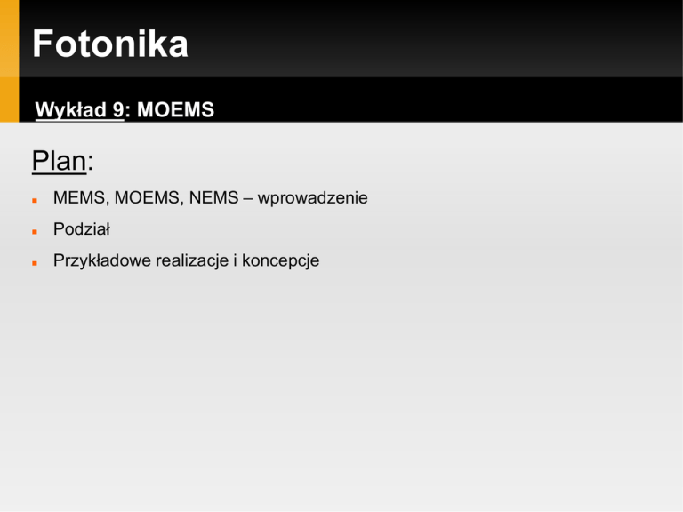 Fotonika Wykład 9: MOEMS Plan: MEMS, MOEMS, NEMS – wprowadzenie Podział Przykładowe realizacje i koncepcje Fotonika MEMS, NEMS, MOEMS Terminologia: MEMS – Micro-Electro-Mechanical-System MOEMS – Micro-Opto-Electro-Mechanical-System MOMS – Micro-Opto-Mechanical-System MST – MicroSystem Technology (w Europie) NEMS – Nano-Electro-Mechanical-Systems Micromachining – technologie związane z produkcję mikroukładów Fotonika MEMS, NEMS, MOEMS Fotonika MEMS, NEMS, MOEMS Mikro-ława optyczna Ława optyczna Fotonika MEMS, NEMS, MOEMS Fotonika Schemat realizacji elementów MEMS/MOEMS KONCEPCJA REALIZACJI CEL PROJEKT MODELOWANIE WYKONANIE OPTYMALIZACJA Niski koszt POWIELENIE SPRZEDAŻ Duża liczba konkurencyjnych układów WYBÓR NAJLEPSZEGO Fotonika MEMS, NEMS, MOEMS - podział Optyka zwierciadła dzielnik wiązki soczewki Fresnela soczewki refrakcyjne Siłowniki comb-drive comb-drive silnik ugięcie Systemy stół optyczny macierze mikrozwierciadeł LCD reaktory chemiczne Fotonika MEMS, NEMS, MOEMS - podział Wyróżniamy dwa rodzaje układów typu MEMS: • powierzchniowe (surface) • objętościowe (bulk) Ze względu na rodzaj wykorzystywanej siły układy MEMS dzielimy na: • układy elektrostatyczne • układy piezoelektryczne • układy magnetyczne • układy pneumatyczne Ze względu na rodzaj wykonywanych zadań układy MEMS dzielimy na: • siłowniki • detektory, mierniki • reaktory chemiczne • mieszacze • wyświetlacze • elementy pasywne • modulatory Fotonika MEMS, NEMS, MOEMS Rodzaje siłowników – mechanizm działania: • elektrostatyczne • piezoelektryczne • membranowe • termiczne • stopy z pamięcią kształtu • pneumatyczno-hydrauliczne • elastomerowe • magnetyczne • chemiczne • biologiczne Rodzaje siłowników - funkcja: • belki • comb-drive • motory • zawory • rezonatory mechaniczne • przełączniki • zwierciadła • szczypce Fotonika MEMS, NEMS, MOEMS - podział Detektory - funkcja: • pomiar przyspieszenia • żyroskop • pomiar ciśnienia • pomiar odległości • pomiar sił makroskopowych • pomiar sił atomowych • pomiary pól: elektrycznego, magnetycznego • pomiar temperatury • interferometry Fotonika MEMS, NEMS, MOEMS Rodzaj oddziaływania Mierzona wielkość Pojemność elektryczna ΔC, Δf (częstotliwość) temperatura ΔR (przesunięcie) Piezoopór ΔR (przesunięcie) Piezoelektryczne ΔV Magnetyczne Efekt Halla Tunelowanie ΔI Optyka ΔT, ΔI, dufrakcja rS 32**tlrafalm F ybelm Fotonika MEMS, NEMS, MOEMS – skalowanie Fotonika MEMS, NEMS, MOEMS MEMS – Zalety • brak ręcznego ustawiania • integracja wielu funkcji w jeden układ • masowa produkcja • małe wymiary • mały pobór energii • szybkość działania – małe bezwładności • niska cena Fotonika MEMS, NEMS, MOEMS - belka Przestrajany mechanicznie VCSEL belka zwierciadła Bragga obszar czynny podstawa Parametry belek dla różnych półprzewodników: Rozmiar [mm] (dl x szer x grub) materiał 100 x 3 x 0,1 10 x 0,2 x 0,1 SiC 19 kHz 1,9 MHz 93 MHz 1,9 GHz Si 12 kHz 1,2 MHz 60 MHz 1,2 GHz GaAs 6,5 kHz 0,65 MHz 32 MHz 0,65 GHz 1 x 0,05 x 0,05 0,1 x 0,01 x 0,01 Fotonika MEMS, NEMS, MOEMS - belka Strukturę typu belka można zrobić na trzy sposoby: Metoda 1: Metoda 2: Metoda 3: Fotonika MEMS, NEMS, MOEMS Fotonika MEMS, NEMS, MOEMS – pomiar temperatury promieniowanie termiczne Kamera termowizyjna oświetlacz detektor Materiał 1 Materiał 2 promieniowanie termiczne Fotonika MEMS, NEMS, MOEMS – comb-drive zasada działania Siła elektrostatyczna k m A + g V - Zalety: • • • • E Siła nie zależy od odległości liniowa zależność między napięciem a ugięciem niskie napięcie pracy (duża powierzchnia elektrod) - 5÷100 V przyciąganie elektrostatyczne (niski pobór mocy) - mW szybkość pracy – 100 MHz Fotonika MEMS, NEMS, MOEMS – comb-drive Przyciąganie Wyrównywanie Wciąganie Fotonika MEMS, NEMS, MOEMS – comb-drive Fotonika MEMS, NEMS, MOEMS Fotonika MEMS, NEMS, MOEMS – comb-drive Układ z dużym względnym przesunięciem XY Układ z małym względnym przesunięciem XY Fotonika MEMS, NEMS, MOEMS – comb-drive (inne możliwości) Fotonika MEMS, NEMS, MOEMS – kołowy comb-drive Fotonika MEMS, NEMS, MOEMS – kołowy comb-drive Fotonika MEMS, NEMS, MOEMS – szczypce (tweezer) Problemy z manipulacją małymi obiektami: • jak je odczepić • jak przymocować Fotonika MEMS, NEMS, MOEMS Układ z wymiennymi końcówkami Fotonika MEMS, NEMS, MOEMS – szczypce Układ z wymiennymi końcówkami Fotonika MEMS, NEMS, MOEMS Fotonika MEMS, NEMS, MOEMS – przesuw na duże odległości Układ z mikrosilniczkiem i śrubą Sprężyny do przesuwu na duże odległości Fotonika MEMS, NEMS, MOEMS – przesuw na duże odległości Układ comb-drive napęda koło zębate napędza linijkę zębatą Fotonika MEMS, NEMS, MOEMS – silnik elektrostatyczny Fotonika MEMS, NEMS, MOEMS – silnik elektrostatyczny Fotonika MEMS, NEMS, MOEMS – silnik elektrostatyczny Etapy produkcji silnika elektrostatycznego w technologii litograficznej Fotonika MEMS, NEMS, MOEMS – silnik elektrostatyczny Fotonika MEMS, NEMS, MOEMS – silnik elektrostatyczny Fotonika MEMS, NEMS, MOEMS – silnik elektrostatyczny Fotonika MEMS, NEMS, MOEMS – koła zębate Fotonika MEMS, NEMS, MOEMS – koła zębate Fotonika MEMS, NEMS, MOEMS – koła zębate Fotonika MEMS, NEMS, MOEMS Fotonika MEMS, NEMS, MOEMS – skrzynia biegów Fotonika MEMS, NEMS, MOEMS – mikro wiatraczki Fotonika MEMS, NEMS, MOEMS – układy skrobiące (scratch drive) Istotna jest siła tarcia Fotonika MEMS, NEMS, MOEMS Mikro-tester wytrzymałości na zrywanie Próbka poddawana obciążeniu Elementy kroczące Fotonika MEMS, NEMS, MOEMS - skanery Różnego rodzaju skanery znalazły szerokie zastosowanie. Do najważniejszych należą: • skanery oparte na SLM • skanery zwierciadlane 1D, 2D • wyświetlacze projektorowe • czytniki kodów paskowych • przełączniki