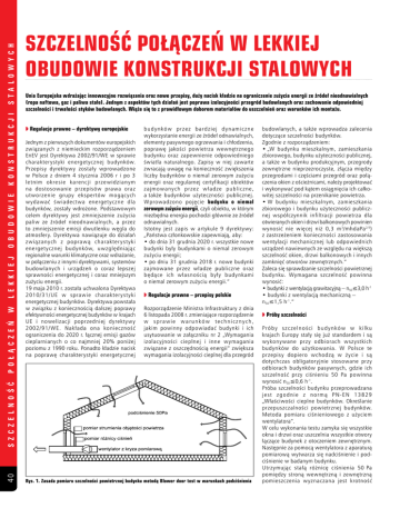 s t a l o w y c h k o n s t r u k c j i o b u d o w i e l e k k i e j w Unia Europejska wdrażając innowacyjne rozwiązania oraz nowe przepisy, duży nacisk kładzie na ograniczenie zużycia energii ze źródeł nieodnawialnych (ropa naftowa, gaz i paliwa stałe). Jednym z aspektów tych działań jest poprawa izolacyjności przegród budowlanych oraz zachowanie odpowiedniej szczelności i trwałości styków budowlanych. Wiąże się to z prawidłowym doborem materiałów do uszczelnień oraz warunków ich montażu. ◗ Regulacje prawne – dyrektywy europejskie Jednym z pierwszych dokumentów europejskich związanych z niemieckim rozporządzeniem EnEV jest Dyrektywa 2002/91/WE w sprawie charakterystyki energetycznej budynków. Przepisy dyrektywy zostały wprowadzone w Polsce z dniem 4 stycznia 2006 r i po 3 letnim okresie karencji przewidzianym na dostosowanie przepisów prawa oraz utworzenie grupy ekspertów mogących wydawać świadectwa energetyczne dla budynków, zostały wdrożone. Podstawowym celem dyrektywy jest zmniejszenie zużycia paliw ze źródeł nieodnawialnych, a przez to zmniejszenie emisji dwutlenku węgla do atmosfery. Dyrektywa nawiązuje do działań związanych z poprawą charakter ystyki energetycznej budynków, uwzględniając regionalne warunki klimatyczne oraz wdrażanie, w połączeniu z innymi dyrektywami, systemów budowlanych i urządzeń o coraz lepszej sprawności energetycznej i coraz mniejszym zużyciu energii. 19 maja 2010 r. została uchwalona Dyrektywa 2010/31/UE w sprawie charakter ystyki energetycznej budynków. Dyrektywa powstała w związku z koniecznością dalszej poprawy efektywności energetycznej budynków w krajach UE i nowelizacji poprzedniej dyrektywy 2002/91/WE. Nakłada ona konieczność ograniczenia do 2020 r. łącznej emisji gazów cieplarnianych o co najmniej 20% poniżej poziomu z 1990 roku. Ponadto kładzie nacisk na poprawę charakterystyki energetycznej budynków pr zez bardziej dynamiczne wykorzystanie energii ze źródeł odnawialnych, elementy pasywnego ogrzewania i chłodzenia, poprawę jakości powietrza wewnętrznego budynku oraz zapewnienie odpowiedniego światła naturalnego. Zapisy w niej zawarte zwracają uwagę na konieczność zwiększenia liczby budynków o niemal zerowym zużyciu energii oraz regularnej certyfikacji obiektów zajmowanych przez władze publiczne, a także budynków użyteczności publicznej. Wprowadzono pojęcie budynku o niemal zerowym zużyciu energii, czyli obiektu, w którym niezbędna energia pochodzi głównie ze źródeł odnawialnych. Istotny jest zapis w artykule 9 dyrektywy: „Państwa członkowskie zapewniają, aby: • do dnia 31 grudnia 2020 r. wszystkie nowe budynki były budynkami o niemal zerowym zużyciu energii; • po dniu 31 grudnia 2018 r. nowe budynki zajmowane przez władze publiczne oraz będące ich własnością były budynkami o niemal zerowym zużyciu energii.” ◗ Regulacje prawne – przepisy polskie Rozporządzenie Ministra Infrastruktury z dnia 6 listopada 2008 r. zmieniające rozporządzenie w sprawie warunków technicznych, jakim powinny odpowiadać budynki i ich usytuowanie w załączniku nr 2 „Wymagania izolacyjności cieplnej i inne wymagania związane z oszczędnością energii” zwiększa wymagania izolacyjności cieplnej dla przegród 40 S z c z e l n o ś ć p o ł ą c z e ń Szczelność połączeń w lekkiej obudowie konstrukcji stalowych Rys. 1. Zasada pomiaru szczelności powietrznej budynku metodą Blower door test w warunkach podciśnienia budowlanych, a także wprowadza zalecenia dotyczące szczelności budynków. Zgodnie z rozporządzeniem: • „W budynku mieszkalnym, zamieszkania zbiorowego, budynku użyteczności publicznej, a także w budynku produkcyjnym, przegrody zewnętrzne nieprzezroczyste, złącza między przegrodami i częściami przegród oraz połączenia okien z ościeżnicami, należy projektować i wykonywać pod kątem osiągnięcia ich całkowitej szczelności na przenikanie powietrza. • W budynku mieszkalnym, zamieszkania zbiorowego i budynku użyteczności publicznej współczynnik infiltracji powietrza dla otwieranych okien i drzwi balkonowych powinien wynosić nie więcej niż 0,3 m 3/mhdaPa 2/3) z zastrzeżeniem konieczności zastosowania wentylacji mechanicznej lub odpowiednich urządzeń nawiewnych ze względu na większą szczelność okien, drzwi balkonowych i innych zamknięć otworów zewnętrznych.” Zaleca się sprawdzanie szczelności powietrznej budynku. Wymagana szczelność powinna wynosić: • budynki z wentylacją grawitacyjną – n50£3,0 h-1 • budynki z wentylacją mechaniczną – n50£1,5 h-1.” ◗ Próby szczelności Próby szczelności budynków w kilku krajach Europy stały się już standardem i są wykonywane przy odbiorach wszystkich budynków do użytkowania. W Polsce te przepisy dopiero wchodzą w życie i są dotychczas obligatoryjnie stosowane przy odbiorach budynków pasywnych, gdzie ich szczelność przy ciśnieniu 50 Pa powinna wynosić n50£0,6 h-1. Próba szczelności budynku przeprowadzana jest zgodnie z normą PN-EN 13829 „Właściwości cieplne budynków. Określanie przepuszczalności powietrznej budynków. Metoda pomiaru ciśnieniowego z użyciem wentylatora”. W celu wykonania testu zamyka się wszystkie okna i drzwi oraz uszczelnia wszystkie otwory łączące budynek z otoczeniem zewnętrznym. Następnie za pomocą wentylatora z aparaturą pomiarową wytwarza się nadciśnienie i podciśnienie w badanym budynku. Utrzymując stałą różnicę ciśnienia 50 Pa pomiędzy stroną wewnętrzną i zewnętrzną pomieszczenia wyznaczana jest krotność s t a l o w y c h o b u d o w i e k o n s t r u k c j i Informator Budowlany-murator. Konstrukcje, Izolacje, Chemia, Wykończenie 2012 spowodować powstanie z jednej strony budynku nadciśnienia, a z drugiej podciśnienia. Zjawisko takie będzie powodowało wpychanie do wewnątrz zimnego powietrza zewnętrznego lub wysysanie ci