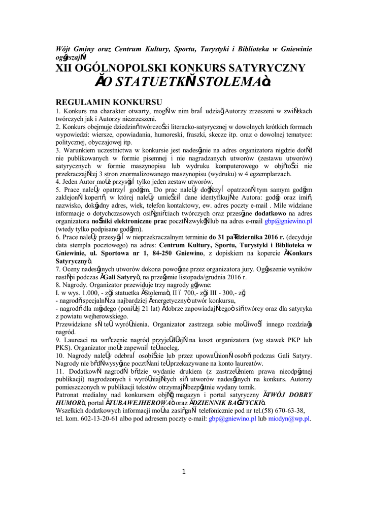 Wójt Gminy oraz Centrum Kultury, Sportu, Turystyki i Biblioteka w Gniewinie ogłaszają: XII OGÓLNOPOLSKI KONKURS SATYRYCZNY „O STATUETKĘ STOLEMA”. REGULAMIN KONKURSU 1. Konkurs ma charakter otwarty, mogą w nim brać udział Autorzy zrzeszeni w związkach twórczych jak i Autorzy niezrzeszeni. 2. Konkurs obejmuje dziedzinę twórczości literacko-satyrycznej w dowolnych krótkich formach wypowiedzi: wiersze, opowiadania, humoreski, fraszki, skecze itp. oraz o dowolnej tematyce: politycznej, obyczajowej itp. 3. Warunkiem uczestnictwa w konkursie jest nadesłanie na adres organizatora nigdzie dotąd nie publikowanych w formie pisemnej i nie nagradzanych utworów (zestawu utworów) satyrycznych w formie maszynopisu lub wydruku komputerowego w objętości nie przekraczającej 3 stron znormalizowanego maszynopisu (wydruku) w 4 egzemplarzach. 4. Jeden Autor może przysłać tylko jeden zestaw utworów. 5. Prace należy opatrzyć godłem. Do prac należy dołączyć opatrzoną tym samym godłem zaklejoną kopertę, w której należy umieścić dane identyfikujące Autora: godło oraz imię, nazwisko, dokładny adres, wiek, telefon kontaktowy, ew. adres poczty e-mail . Mile widziane informacje o dotychczasowych osiągnięciach twórczych oraz przesłane dodatkowo na adres organizatora nośniki elektroniczne prac pocztą zwykłą lub na adres e-mail [email protected] (wtedy tylko podpisane godłem). 6. Prace należy przesyłać w nieprzekraczalnym terminie do 31 października 2016 r. (decyduje data stempla pocztowego) na adres: Centrum Kultury, Sportu, Turystyki i Biblioteka w Gniewinie, ul. Sportowa nr 1, 84-250 Gniewino, z dopiskiem na kopercie „Konkurs Satyryczny”. 7. Oceny nadesłanych utworów dokona powołane przez organizatora jury. Ogłoszenie wyników nastąpi podczas „Gali Satyry”, na przełomie listopada/grudnia 2016 r. 8. Nagrody. Organizator przewiduje trzy nagrody główne: I. w wys. 1.000, - zł i statuetka „Stolema”, II – 700,- zł i III - 300,- zł, - nagrodę specjalną za najbardziej „energetyczny” utwór konkursu, - nagrodę dla młodego (poniżej 21 lat) „dobrze zapowiadającego” się twórcy oraz dla satyryka z powiatu wejherowskiego. Przewidziane są też wyróżnienia. Organizator zastrzega sobie możliwość innego rozdziału nagród. 9. Laureaci na wręczenie nagród przyjeżdżają na koszt organizatora (wg stawek PKP lub PKS). Organizator może zapewnić też nocleg. 10. Nagrody należy odebrać osobiście lub przez upoważnioną osobę podczas Gali Satyry. Nagrody nie będą wysyłane pocztą ani też przekazywane na konto laureatów. 11. Dodatkową nagrodą będzie wydanie drukiem (z zastrzeżeniem prawa nieodpłatnej publikacji) nagrodzonych i wyróżniających się utworów nadesłanych na konkurs. Autorzy pomieszczonych w publikacji tekstów otrzymają bezpłatnie wydany tomik. Patronat medialny nad konkursem objął magazyn i portal satyryczny „TWÓJ DOBRY HUMOR”, portal „TUBAWEJHEROWA” oraz „DZIENNIK BAŁTYCKI”. Wszelkich dodatkowych informacji można zasięgnąć telefonicznie pod nr tel.(58) 670-63-38, tel. kom. 602-13-20-61 albo pod adresem poczty e-mail: [email protected] lub [email protected]. 1