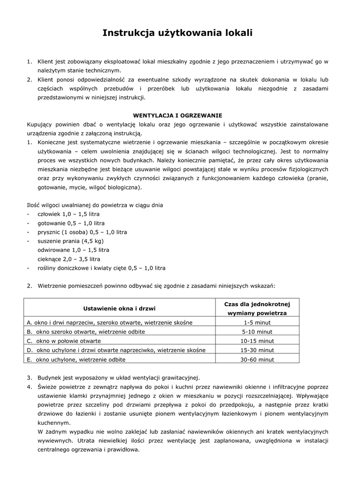 Instrukcja użytkowania lokali 1. Klient jest zobowiązany eksploatować lokal mieszkalny zgodnie z jego przeznaczeniem i utrzymywać go w należytym stanie technicznym. 2. Klient ponosi odpowiedzialność za ewentualne szkody wyrządzone na skutek dokonania w lokalu lub częściach wspólnych przebudów i przeróbek lub użytkowania lokalu niezgodnie z zasadami przedstawionymi w niniejszej instrukcji. WENTYLACJA I OGRZEWANIE Kupujący powinien dbać o wentylację lokalu oraz jego ogrzewanie i użytkować wszystkie zainstalowane urządzenia zgodnie z załączoną instrukcją. 1. Konieczne jest systematyczne wietrzenie i ogrzewanie mieszkania – szczególnie w początkowym okresie użytkowania – celem uwolnienia znajdującej się w ścianach wilgoci technologicznej. Jest to normalny proces we wszystkich nowych budynkach. Należy koniecznie pamiętać, że przez cały okres użytkowania mieszkania niezbędne jest bieżące usuwanie wilgoci powstającej stale w wyniku procesów fizjologicznych oraz przy wykonywaniu zwykłych czynności związanych z funkcjonowaniem każdego człowieka (pranie, gotowanie, mycie, wilgoć biologiczna). Ilość wilgoci uwalnianej do powietrza w ciągu dnia - człowiek 1,0 – 1,5 litra - gotowanie 0,5 – 1,0 litra - prysznic (1 osoba) 0,5 – 1,0 litra - suszenie prania (4,5 kg) odwirowane 1,0 – 1,5 litra cieknące 2,0 – 3,5 litra - rośliny doniczkowe i kwiaty cięte 0,5 – 1,0 litra 2. Wietrzenie pomieszczeń powinno odbywać się zgodnie z zasadami niniejszych wskazań: Ustawienie okna i drzwi A. okno i drwi naprzeciw, szeroko otwarte, wietrzenie skośne B. okno szeroko otwarte, wietrzenie odbite Czas dla jednokrotnej wymiany powietrza 1-5 minut 5-10 minut C. okno w połowie otwarte 10-15 minut D. okno uchylone i drzwi otwarte naprzeciwko, wietrzenie skośne 15-30 minut E. okno uchylone, wietrzenie odbite 30-60 minut 3. Budynek jest wyposażony w układ wentylacji grawitacyjnej. 4. Świeże powietrze z zewnątrz napływa do pokoi i kuchni przez nawiewniki okienne i infiltracyjne poprzez ustawienie klamki przynajmniej jednego z okien w mieszkaniu w pozycji rozszczelniającej. Wpływające powietrze przez szczeliny pod drzwiami przepływa z pokoi do przedpokoju, a następnie przez kratki drzwiowe do łazienki i zostanie usunięte pionem wentylacyjnym łazienkowym i pionem wentylacyjnym kuchennym. W żadnym wypadku nie wolno zaklejać lub zasłaniać nawiewników okiennych ani kratek wentylacyjnych wywiewnych. Utrata niewielkiej ilości przez wentylację jest zaplanowana, uwzględniona w instalacji centralnego ogrzewania i prawidłowa. 5. Nie wolno dokonywać zmian w instalacji centralnego ogrzewania poprzez demontaż lub dokładanie dodatkowych grzejników. 6. Należy utrzymywać w mieszkaniu następujące parametry powietrza: a) temperatura w pokojach i w kuchni ok. 20oC, w łazienkach ok. 25 oC. b) wilgotność względna ok. 45% dla pomieszczeń mieszkalnych, ok. 55% dla łazienek. 7. Nie utrzymanie przez dłuższy czas ww. parametrów grozi szkodliwym dla człowieka mikroklimatem, inwazją biologiczną (pleśń). Utrzymanie wymaganych parametrów powietrza odbywa się poprzez właściwe ogrzewanie, wietrzenie i zapewnienie ciągłego działania wentylacji. UWAGA: Niewłaściwe wietrzenie lokalu, zakłócanie pracy wentylacji, niedogrzanie lokalu może spowodować degradację ścian, powstawanie zawilgoceń, a nawet zagrzybienie! STOLARKA OKIENNA 1. Stolarka okienna wykonana jest z wysoko udarowych tworzyw sztucznych nowej generacji. Są to okna rozwierno-uchylne z funkcją „rozszczelnienie” posiadające okucia obwiedniowe. 2. Regulacja funkcji otwarcia okna odbywa się przy pomocy klamki (dźwigni). 3. Niezależnie od typu okna istnieje tylko jedna dźwignia (klamka) uruchamiająca wszystkie funkcje okna. Wg wskazówek zegara poszczególne funkcje realizuje się następująco: - zamknięte – klamka wskazuje cyfrę 6 - otwarte – klamka wskazuje cyfrę 9 (lub 3) - uchylone – klamka wskazuje cyfrę 12 - rozszcelnienie – klamka wskazuje środek pola pomiędzy 10 i 11 (lub 1 i 2) 4. Przy wyborze funkcji okna należy pamiętać aby klamka znajdowała się dokładnie w położeniu wybranej funkcji okna. 5. Przy zamykaniu skrzydło okna należy docisnąć do ościeżnicy. 6. Nie należy wykonywać żadnych manipulacji klamką, jeżeli okno jest otwarte lub uchylone, gdyż grozi to uruchomieniem jednocześnie funkcji rozbieralności. Jeżeli jednak taka sytuacja miałaby miejsce, należy klamkę umieścić w pozycji „uchylone”, docisnąć górny róg skrzydła przeciwległego do klamki i przesunąć klamkę w pozycję „otwarte”. 7. Aby mechanizmy okucia funkcjonowały prawidłowo należy raz do roku części ruchome smarować olejem smarnym lub oliwą do maszyn do szycia. 8. Należy sprawdzać drożność otworów odwadniających ościeże okna, a w razie konieczności oczyścić je drutem. 9. Jeżeli uszczelki wysunęły się z narożników, wystarczy lekko je nacisnąć i przykleić klejem szybkoschnącym. Jeżeli uszczelka wysunęła się ze szczeliny, wystarczy wcisnąć je ponownie w szczelinę. 10. Do czyszczenia ram okiennych nie wolno stosować środków szorujących lub rozpuszczalników. Zalecany jest płyn do mycia naczyń dolewany do letniej wody. INFORMACJE POZOSTAŁE 1. Zabrania się ingerencji w zewnętrzny wizerunek budynku, niedopuszczalne jest: - przemalowywanie ścian, balustrad balkonów oraz innych zewnętrznych elementów elewacji, - zabudowa balkonu, - montaż krat w oknach, - zmiana koloru, a także podziałów stolarki okiennej, - montaż rolet antywłamaniowych, rolet i żaluzji wewnętrznych montowanych na oknach - montaż anten satelitarnych. 2. Zabrania się: - wrzucania do muszli klozetowej odpadów mogących zapchać instalację kanalizacyjną. Użytkownicy, z winy których została zapchana instalacja kanalizacyjna zostaną obciążeni kosztami jej udrożnienia, - wjeżdżania, parkowania samochodów i poj