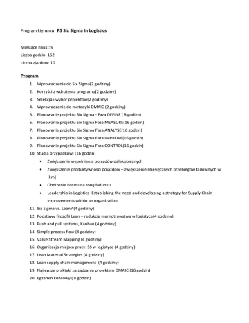 Program kierunku: PS Six Sigma In Logistics Miesiące nauki: 9 Liczba godzin: 152 Liczba zjazdów: 10 Program 1. Wprowadzenie do Six Sigma(2 godziny) 2. Korzyści z wdrożenia programu(2 godziny) 3. Selekcja i wybór projektów(2 godziny) 4. Wprowadzenie do metodyki DMAIC (2 godziny) 5. Planowanie projektu Six Sigma - Faza DEFINE ( 8 godizn) 6. Planowanie projektu Six Sigma Faza MEASURE(16 godzin) 7. Planowanie projektu Six Sigma Faza ANALYSE(16 godzin) 8. Planowanie projektu Six Sigma Faza IMPROVE(16 godzin) 9. Planowanie projektu Six Sigma Faza CONTROL(16 godzin) 10. Studia przypadków: (16 godzin) Zwiększenie wypełnienia pojazdów dalekobieżnych Zwiększenie produktywności pojazdów – zwiększenie miesięcznych przebiegów ładownych w [km] Obniżenie kosztu na tonę ładunku Leadership in Logistics- Establishing the need and developing a strategy for Supply Chain improvements within an organization 11. Six Sigma vs. Lean? (4 godziny) 12. Podstawy filozofii Lean – redukcja marnotrawstwa w logistyce(4 godziny) 13. Push and pull systems, Kanban (4 godziny) 14. Simple process flow (4 godziny) 15. Value Stream Mapping (4 godziny) 16. Organizacja miejsca pracy. 5S w logistyce (4 godziny) 17. Lean Material Strategies (4 godziny) 18. Lean supply chain management (4 godziny) 19. Najlepsze praktyki zarządzania projektem DMAIC (16 godzin) 20. Egzamin końcowy ( 8 godzin)