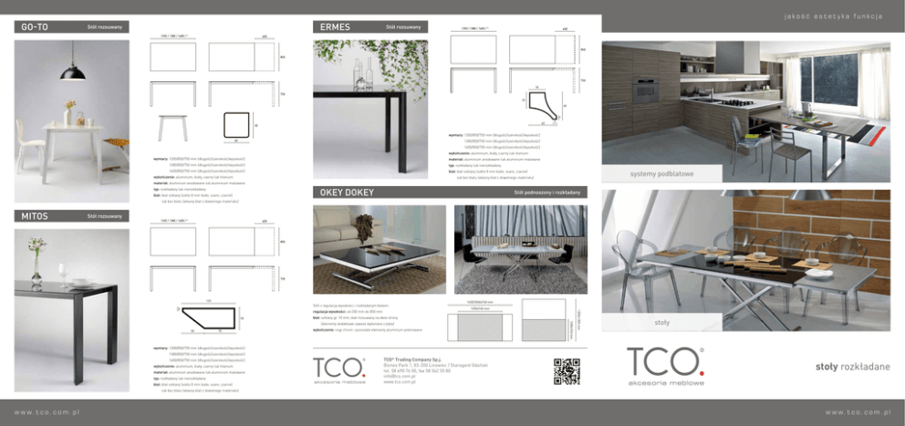 jakość estetyka funkcja GO-TO ERMES Stół rozsuwany Stół rozsuwany 36 36 60 9 60 9 wymiary: 1200/850/750 mm (długość/szerokość/wysokość) 1380/850/750 mm (długość/szerokość/wysokość) 1600/850/750 mm (długość/szerokość/wysokość) wykończenie: aluminium, biały, czarny lub titanium wymiary: 1 200/850/750 mm (długość/szerokość/wysokość) materiał: aluminium anodowane lub aluminium malowane 1380/850/750 mm (długość/szerokość/wysokość) typ: rozkładany lub nierozkładany 1600/850/750 mm (długość/szerokość/wysokość) blat: blat szklany (szkło 8 mm białe, szare, czarne) wykończenie: aluminium, biały, czarny lub titanium systemy podblatowe lub bez blatu (własny blat z dowolnego materiału) materiał: aluminium anodowane lub aluminium malowane OKEY DOKEY typ: rozkładany lub nierozkładany blat: blat szklany (szkło 8 mm białe, szare, czarne) Stół podnoszony i rozkładany lub bez blatu (własny blat z dowolnego materiału) MITOS Stół rozsuwany 120 Stół z regulacją wysokości i rozkładanym blatem. regulacja wysokości: od 250 mm do 850 mm 50 1200x740 mm blat: szklany gr. 10 mm, blat rozsuwany na dwie strony 50 70 1200x740 mm (elementy dodatkowe zawsze wykonane z płyty) wykończenie: nogi chrom i pozostale elementy aluminium polerowane 1200x1200 mm 8 1620/2040x740 mm stoły wymiary: 1200/850/750 mm (długość/szerokość/wysokość) 1380/850/750 mm (długość/szerokość/wysokość) 1600/850/750 mm (długość/szerokość/wysokość) wykończenie: aluminium, biały, czarny lub titanium materiał: aluminium anodowane lub aluminium malowane typ: rozkładany lub nierozkładany blat: blat szklany (szkło 8 mm białe, szare, czarne) TCO® Trading Company Sp.j. Biznes Park 1, 83-200 Linowiec / Starogard Gdański tel. 58 690 76 00, fax 58 562 55 80 [email protected] www.tco.com.pl stoły rozkładane lub bez blatu (własny blat z dowolnego materiału) w w w. t c o . c o m . p l w w w. t c o . c o m . p l Siesta • udźwig 80kg • prowadnice kulkowe snack System podblatowy Nr artykułu P - głębokość min. 411/78.1155.22 540 mm C 707 H min. 120 L - szerokośc szafki 450 S1 15-20 System podblatowy E • udźwig 80kg Nr artykułu P - głębokość min. C H min. L - szerokośc szafki L1 S1 E • udźwig 80kg Nr artykułu P - głębokość min. C H min. L - szerokośc szafki E 750 • prowadnice kulkowe 411/78.1281.22 800 mm 640 55 2600 2508 40 640 • prowadnice aluminiowe 411/78.1180.22 532 mm 743 130 354 909 411/78.1282.22 800 mm 640 55 2000 1908 40 640 • wykończenie stal nakrywka na deske - - - - - • wykończenie aluminium anodowane 411/78.1150.22 540 mm 707 120 600 15-20 750 • wykończenie aluminium anodowane • blat nie jest dołączony do zestawu 411/78.1160.22 540 mm 707 120 900 15-20 750 • możliwy w wersji elektrycznej na pilota • zawiasy dostępne wyłącznie pod zamówienie 411/78.1170.22 540 mm 707 120 1200 15-20 750 • blat nie jest dołączony do zestawu COCTAIL PRUA System podblatowy • blat dołączony do zestawu T-ABLE System podblatowy DESK System podblatowy System podblatowy • udźwig 60kg Nr artykułu P - głębokość min. C H min. L - szerokośc szafki S1 E • udźwig 100kg Nr artykułu P - głębokość min. C H min. L - szerokośc szafki S1 E T • udźwig 20kg Nr artykułu • prowadnice aluminiowe 411/78.1155.22 E 540 mm 699 120 450 15-20 753 • prowadnice aluminiowe 411/78.1900.22 540 mm 789 120 600 15-20 900 745-815 • wykończenie stal 411/78.0005.02 • wykończenie stal 411/78.1150.22 E 540 mm 699 120 600 15-20 753 • wykończenie stal 411/78.1910.22 540 mm 789 120 900 15-20 900 745-815 • blat nie jest dołączony do zestawu • blat nie jest dołączony do zestawu 411/78.1160.22 E 540 mm 699 120 900 15-20 753 • blat nie jest dołączony do zestawu 411/78.1920.22 540 mm 789 120 1200 15-20 900 745-815 • zawiasy dostępne wyłącznie pod zamówienie 411/78.1170.22 E 540 mm 699 120 1200 15-20 753 • zawiasy dostępne wyłącznie pod zamówienie 411/78.1900.22X 520 mm 1168 130 600 15-20 1310 731-801 w w w. t c o . c o m . p l 411/78.1910.22X 520 mm 1168 130 900 15-20 1310 731-801 411/78.1920.22X 520 mm 1168 130 1200 15-20 1310 731-801 w w w. t c o . c o m . p l