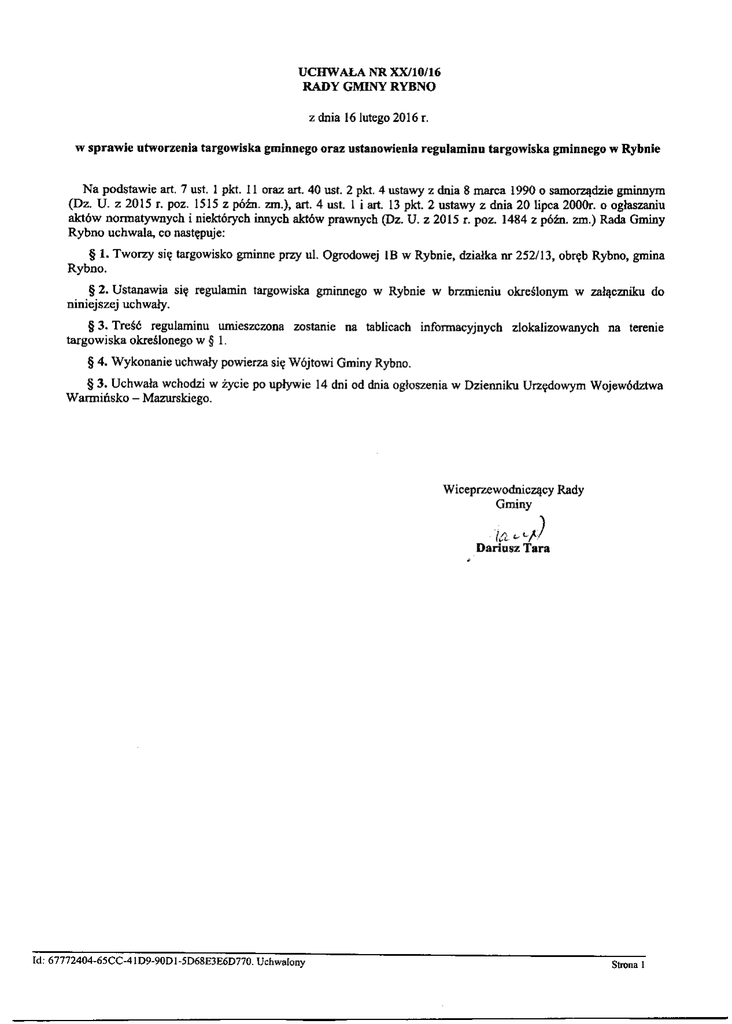 w spra$ie utworzenia tsrgowiska gminnego orrz ustrnowietrla reguhminu tsrgowiska gminnego w Rybnle