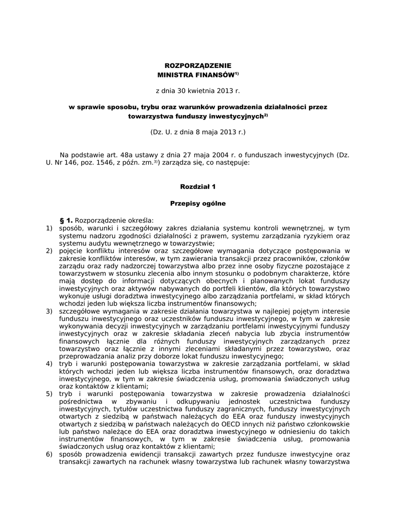 ROZPORZĄDZENIE MINISTRA FINANSÓW1) z dnia 30 kwietnia 2013 r. w sprawie sposobu, trybu oraz warunków prowadzenia działalności przez towarzystwa funduszy inwestycyjnych2) (Dz. U. z dnia 8 maja 2013 r.) Na podstawie art. 48a ustawy z dnia 27 maja 2004 r. o funduszach inwestycyjnych (Dz. U. Nr 146, poz. 1546, z późn. zm.3)) zarządza się, co następuje: Rozdział 1 Przepisy ogólne 1) 2) 3) 4) 5) 6) § 1. Rozporządzenie określa: sposób, warunki i szczegółowy zakres działania systemu kontroli wewnętrznej, w tym systemu nadzoru zgodności działalności z prawem, systemu zarządzania ryzykiem oraz systemu audytu wewnętrznego w towarzystwie; pojęcie konfliktu interesów oraz szczegółowe wymagania dotyczące postępowania w zakresie konfliktów interesów, w tym zawierania transakcji przez pracowników, członków zarządu oraz rady nadzorczej towarzystwa albo przez inne osoby fizyczne pozostające z towarzystwem w stosunku zlecenia albo innym stosunku o podobnym charakterze, które mają dostęp do informacji dotyczących obecnych i planowanych lokat funduszy inwestycyjnych oraz aktywów nabywanych do portfeli klientów, dla których towarzystwo wykonuje usługi doradztwa inwestycyjnego albo zarządzania portfelami, w skład których wchodzi jeden lub większa liczba instrumentów finansowych; szczegółowe wymagania w zakresie działania towarzystwa w najlepiej pojętym interesie funduszu inwestycyjnego oraz uczestników funduszu inwestycyjnego, w tym w zakresie wykonywania decyzji inwestycyjnych w zarządzaniu portfelami inwestycyjnymi funduszy inwestycyjnych oraz w zakresie składania zleceń nabycia lub zbycia instrumentów finansowych łącznie dla różnych funduszy inwestycyjnych zarządzanych przez towarzystwo oraz łącznie z innymi zleceniami składanymi przez towarzystwo, oraz przeprowadzania analiz przy doborze lokat funduszu inwestycyjnego; tryb i warunki postępowania towarzystwa w zakresie zarządzania portfelami, w skład których wchodzi jeden lub większa liczba instrumentów finansowych, oraz doradztwa inwestycyjnego, w tym w zakresie świadczenia usług, promowania świadczonych usług oraz kontaktów z klientami; tryb i warunki postępowania towarzystwa w zakresie prowadzenia działalności pośrednictwa w zbywaniu i odkupywaniu jednostek uczestnictwa funduszy inwestycyjnych, tytułów uczestnictwa funduszy zagranicznych, funduszy inwestycyjnych otwartych z siedzibą w państwach należących do EEA oraz funduszy inwestycyjnych otwartych z siedzibą w państwach należących do OECD innych niż państwo członkowskie lub państwo należące do EEA oraz doradztwa inwestycyjnego w odniesieniu do takich instrumentów finansowych, w tym w zakresie świadczenia usług, promowania świadczonych usług oraz kontaktów z klientami; sposób prowadzenia ewidencji transakcji zawartych przez fundusze inwestycyjne oraz transakcji zawartych na rachunek własny towarzystwa lub rachunek własny towarzystwa 7) 8) prowadzony dla zbiorczego portfela papierów wartościowych, a także ewidencji zleceń składanych przez uczestników funduszy inwestycyjnych; sposób dokumentowania źródeł będących podstawą decyzji inwestycyjnych oraz przechowywania i archiwizowania dokumentów i innych nośników informacji związanych z działalnością funduszy inwestycyjnych i towarzystwa; warunki techniczne i organizacyjne prowadzenia przez towarzystwo działalności, o której mowa w art. 48 ust. 2a ustawy. § 2. Ilekroć w rozporządzeniu jest mowa o: ustawie - rozumie się przez to ustawę z dnia 27 maja 2004 r. o funduszach inwestycyjnych; 2) ustawie o obrocie instrumentami finansowymi - rozumie się przez to ustawę z dnia 29 lipca 2005 r. o obrocie instrumentami finansowymi (Dz. U. z 2010 r. Nr 211, poz. 1384, z późn. zm.4)); 3) funduszu - rozumie się przez to fundusz inwestycyjny niebędący funduszem inwestycyjnym z wydzielonymi subfunduszami lub subfundusz wydzielony w ramach funduszu inwestycyjnego z wydzielonymi subfunduszami; 4) informacji poufnej - rozumie się przez to informację poufną, o której mowa w art. 154 ustawy o obrocie instrumentami finansowymi; 5) wartości zagrożonej - rozumie się przez to przewidywaną wielkość strat funduszu z tytułu zmian parametrów cenowych pozycji wchodzących w skład aktywów funduszu, oszacowaną na podstawie modelu statystycznego będącego modelem wartości zagrożonej, o parametrach szacowanych na podstawie obserwacji tych zmian, której przekroczenie w ustalonym okresie prognozy może wystąpić z prawdopodobieństwem równym założonemu poziomowi istotności; 6) transakcji przy zobowiązaniu się funduszu do odkupu - rozumie się przez to umowę, w której fundusz zobowiązuje się do przeniesienia praw majątkowych do papierów wartościowych i ich odkupu po uzgodnionej cenie w ustalonym przyszłym dniu, a druga strona zobowiązuje się do ich nabycia i zwrotu po uzgodnionej cenie w ustalonym przyszłym dniu; 7) transakcji przy zobowiązaniu się drugiej strony do odkupu - rozumie się przez to umowę, w której druga strona zobowiązuje się do przeniesienia praw majątkowych do papierów wartościowych i ich odkupu po uzgodnionej cenie w ustalonym przyszłym dniu, a fundusz zobowiązuje się do ich nabycia i zwrotu po uzgodnionej cenie w ustalonym przyszłym dniu; 8) ryzyku kontrahenta - rozumie się przez to wartość ustalonego przez fundusz niezrealizowanego zysku na transakcjach, których przedmiotem są niewystandaryzowane instrumenty pochodne, bez uwzględniania opłat i świadczeń ponoszonych przez fundusz przy zawarciu transakcji, w szczególności premii zapłaconej przy zakupie opcji; 9) ryzyku płynności - rozumie się przez to ryzyko polegające na braku możliwości sprzedaży, likwidacji lub zamknięcia pozycji w aktywach funduszu, przy ograniczonych kosztach i w odpowiednio krótkim czasie, na skutek czego jest zagrożona zdolność funduszu do stałego spełniania warunków określonych w art. 