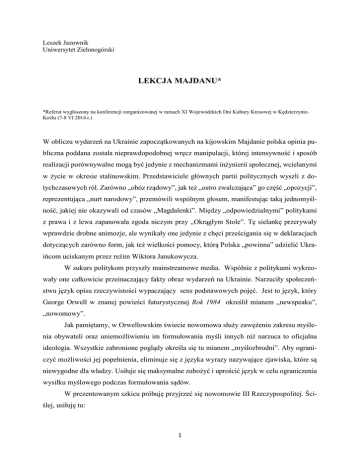 Leszek Jazownik Uniwersytet Zielonogórski LEKCJA MAJDANU* *Referat wygłoszony na konferencji zorganizowanej w ramach XI Wojewódzkich Dni Kultury Kresowej w KędzierzynieKoźlu (7-8 VI 2014 r.) W obliczu wydarzeń na Ukrainie zapoczątkowanych na kijowskim Majdanie polska opinia publiczna poddana została nieprawdopodobnej wręcz manipulacji, której intensywność i sposób realizacji porównywalne mogą być jedynie z mechanizmami inżynierii społecznej, wcielanymi w życie w okresie stalinowskim. Przedstawiciele głównych partii politycznych wyszli z dotychczasowych ról. Zarówno „obóz rządowy”, jak też „ostro zwalczająca” go część „opozycji”, reprezentująca „nurt narodowy”, przemówili wspólnym głosem, manifestując taką jednomyślność, jakiej nie okazywali od czasów „Magdalenki”. Między „odpowiedzialnymi” politykami z prawa i z lewa zapanowała zgoda niczym przy „Okrągłym Stole”. Tę sielankę przerywały wprawdzie drobne animozje, ale wynikały one jedynie z chęci prześcigania się w deklaracjach dotyczących zarówno form, jak też wielkości pomocy, którą Polska „powinna” udzielić Ukraińcom uciskanym przez reżim Wiktora Janukowycza. W sukurs politykom przyszły mainstreamowe media. Wspólnie z politykami wykreowały one całkowicie przeinaczający fakty obraz wydarzeń na Ukrainie. Narzuciły społeczeństwu język opisu rzeczywistości wypaczający sens podstawowych pojęć. Jest to język, który George Orwell w znanej powieści futurystycznej Rok 1984 określił mianem „newspeaku”, „nowomowy”. Jak pamiętamy, w Orwellowskim świecie nowomowa służy zawężeniu zakresu myślenia obywateli oraz uniemożliwieniu im formułowania myśli innych niż narzuca to oficjalna ideologia. Wszystkie zabronione poglądy określa się tu mianem „myślozbrodni”. Aby ograniczyć możliwości jej popełnienia, eliminuje się z języka wyrazy nazywające zjawiska, które są niewygodne dla władzy. Usiłuje się maksymalne zubożyć i uprościć język w celu ograniczenia wysiłku myślowego podczas formułowania sądów. W prezentowanym szkicu próbuję przyjrzeć się nowomowie III Rzeczypospolitej. Ściślej, usiłuję tu: 1 1. Odtworzyć podstawowe kategorie newspeaku, który wdrukowywany jest polskiemu społeczeństwu przez czołowych polityków i media „głównego nurtu”. 2. Wskazać przejawy hipokryzji leżącej u podstaw „nowomowy” wypracowanej w celu opisywania sytuacji na Ukrainie. 3. Wskazać wnioski płynące z analizy zjawisk politycznych i społecznych, które przez nowomowę są przesłaniane. I. Policja Myśli Nowomowa „okrągłostołowego” establishmentu III Rzeczypospolitej zachowuje wszystkie zasadnicze cechy – i dałoby się wykazać, że dzieje się tak nieprzypadkowo – języka propagandy wypracowanego przez władze PRL-u. Znawca tego języka – Michał Głowiński – uznaje, iż podstawowym wyróżnikiem PRL-owskiej nowomowy jest tendencja do jednoznacznego wartościowania pojęć i zjawisk, prowadząca do ich polaryzacji. Kluczowy staje się więc podział „swój – obcy”, „dobry – zły”, „słuszny – niesłuszny”. Zgodnie ze wskazaną tendencją „okrągłostołowe” elity polityczne i związane z nimi media jednomyślnie opowiedziały się po stronie pikietujących na Majdanie, wtłaczając polskiemu społeczeństwu czarno-biały obraz sytuacji na Ukrainie. Monopolizując dyskurs, szczelnie zablokowano opinie przeciwstawne. Z impetem zwalczano wszystkich, którzy mieli odwagę takie opinie głosić, odżegnując ich od czci i wiary. O tym, jak działa cenzura polityczna III RP, przekonał się ks. Tadeusz IsakowiczZaleski, który dopuścił się „myślozbrodni” polegającej na ujawnieniu banderowskich sympatii czołowych polityków Majdanu. W roli Orwellowskiej Policji Myśli wystąpiła „Gazeta Polska”. Jej Naczelnik – redaktor Sakiewicz – zdjął ze szpalt swej gazety rubrykę prowadzoną przez kapłana Kresowian i oskarżył jej autora o rosyjską agenturalność, licząc oczywiście na lincz publiczny. Ksiądz Isakowicz-Zaleski skazany więc został na „ewaporację”, „wyparowanie”, co w powieści Orwella oznacza karę fizycznego lub społecznego unicestwienia, połączoną z zamazywaniem śladów istnienia osoby napiętnowanej. II. Newspeak Oprócz tendencji do narzucania wartościowań wprowadzających dychotomiczną polaryzację świata ważnym narzędziem propagandowego newspeaku jest tworzenie neologizmów i neosemantyzacja, czyli nadawanie nowych znaczeń starym pojęciom. Przyjrzyjmy się niektórym osiągnięciom aparatu propagandowego „okrągłostołowych” elit w posługiwaniu się tymi środkami językowymi: 2 1. Wysiłki elit politycznych i mediów sprawiły, że zupełnie nowego sensu nabrało pojęcie „pokojowych demonstracji”. Media wprowadzały Polaków w stan schizofrenii. Polacy co innego słyszeli, co innego widzieli. Słyszeli o „uczestnikach protestów”, „demonstrantach”, „strajkujących”, widzieli natomiast wielomiesięczne koczowanie pod siedzibami władz państwowych i okupowanie budynków administracyjnych połączone ze wznoszeniem barykad, obrzucaniem funkcjonariuszy milicji koktajlami Mołotowa, ostrzeliwaniem się, regularnym prowadzeniem bitew z Berkutem, maltretowaniem i upokarzaniem milicjantów, terroryzowaniem przeciwników politycznych. Sprawców tego rodzaju zachowań zwykło się nazywać nie „demonstrantami” czy „manifestantami”, ale „zamachowcami” lub „uczestnikami puczu”. Manipulacje językowe polityków i mediów stają się szczególnie widoczne, gdy ich wypowiedzi zestawi się choćby z komentarzami na temat ubiegłorocznego Marszu Niepodległości, którego uczestnicy spalili budkę ochrony i kontener ze śmieciami pod ambasadą rosyjską oraz Tęczę, traktowaną przez nich jako prowokacyjnie wystawiony na Placu Zbawiciela symbol homoseksualistów. Zdolnościami 