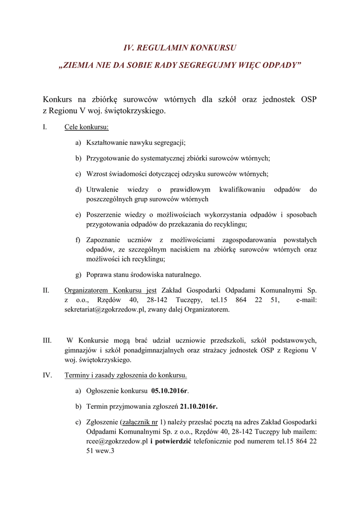 IV. REGULAMIN KONKURSU „ZIEMIA NIE DA SOBIE RADY SEGREGUJMY WIĘC ODPADY” Konkurs na zbiórkę surowców wtórnych dla szkół oraz jednostek OSP z Regionu V woj. świętokrzyskiego. I. Cele konkursu: a) Kształtowanie nawyku segregacji; b) Przygotowanie do systematycznej zbiórki surowców wtórnych; c) Wzrost świadomości dotyczącej odzysku surowców wtórnych; d) Utrwalenie wiedzy o prawidłowym poszczególnych grup surowców wtórnych kwalifikowaniu odpadów do e) Poszerzenie wiedzy o możliwościach wykorzystania odpadów i sposobach przygotowania odpadów do przekazania do recyklingu; f) Zapoznanie uczniów z możliwościami zagospodarowania powstałych odpadów, ze szczególnym naciskiem na zbiórkę surowców wtórnych oraz możliwości ich recyklingu; g) Poprawa stanu środowiska naturalnego. II. Organizatorem Konkursu jest Zakład Gospodarki Odpadami Komunalnymi Sp. z o.o., Rzędów 40, 28-142 Tuczępy, tel.15 864 22 51, e-mail: [email protected], zwany dalej Organizatorem. III. W Konkursie mogą brać udział uczniowie przedszkoli, szkół podstawowych, gimnazjów i szkół ponadgimnazjalnych oraz strażacy jednostek OSP z Regionu V woj. świętokrzyskiego. IV. Terminy i zasady zgłoszenia do konkursu. a) Ogłoszenie konkursu 05.10.2016r. b) Termin przyjmowania zgłoszeń 21.10.2016r. c) Zgłoszenie (załącznik nr 1) należy przesłać pocztą na adres Zakład Gospodarki Odpadami Komunalnymi Sp. z o.o., Rzędów 40, 28-142 Tuczępy lub mailem: [email protected] i potwierdzić telefonicznie pod numerem tel.15 864 22 51 wew.3 V. Zasady konkursu a) Czas trwania konkursu 22.10.2016r.-21.04.2017r. c) wyłonienie zwycięzców 30.04.2017r. d) ogłoszenie wyników na stronie www.rcee.zgokrzedow.pl, e) zwycięzcy zostaną powiadomieni telefonicznie. VI. Zbiórka surowców możliwa jest w następujących grupach: makulatura, plastik, szkło. Prawidłowo zebrane surowce powinny znajdować się w workach o odpowiednich kolorach, tj. makulatura- niebieski, plastik- żółty, szkło- zielony. W workach niebieskich umieszczamy makulaturę tj.: gazety, książki, czasopisma, zeszyty, tekturę. UWAGA! Pamiętajmy, makulatura nie może być zabrudzona czy zatłuszczona, np. nie można zbierać zabrudzonych chusteczek czy papieru po maśle. W workach żółtych umieszczamy puste butelki plastikowe typu PET po napojach, po kosmetykach i środkach czystości (np. szamponach), nakrętki z butelek. UWAGA! Pamiętajmy o dokładnym opróżnianiu i zgniataniu butelek. W workach zielonych umieszczamy szklane butelki, słoiki (wyłącznie szkło opakowaniowe). UWAGA! Pamiętajmy o usuwaniu z butelek i słoików nakrętek. Nie wrzucamy szklanek, porcelany, szyb, szkła żaroodpornego itp. VII. Za przebieg zbiórki surowców na terenie placówki oświatowej odpowiada Dyrektor tejże placówki, a na terenie jednostki OSP odpowiada jej Prezes. Dyrektor/Prezes wyznaczy koordynatora konkursu. VIII. Koordynator konkursu obowiązany jest zapoznać uczestników z regulaminem, a szczególną ich uwagę zwrócić na punkt I i VI niniejszego regulaminu. IX. Surowce wtórne będą odbierane przez Zakład Gospodarki Odpadami Komunalnymi, a załadunku dokonuje odbierający odpady w terminie uzgodnionym wcześniej z koordynatorem. X. Nad prawidłowym przebiegiem konkursu czuwać będzie komisja konkursowa, tj.: a) Bogumiła Czerwiec- Dyrektor Pionu Sprzedaży i Rozwoju. b) Małgorzata Zabdyr- Referent ds. edukacji ekologicznej i promocji. c) Renata Kowalik-Sobieniak- Referent ds. edukacji ekologicznej i promocji. XI. Punktacja będzie prowadzona w następujący sposób a) 1kg makulatury - 1 pkt. b) 1kg szkła - 2 pkt. c) 1kg plastiku - 3 pkt. XII. Zebrane surowce przygotowane do odebrania, zostaną zważone przez podmiot odbierający. XIII. Koordynator szkolny po zakończeniu konkursu wypełnia i przekazuje do organizatora formularz odbioru odpadów (załącznik nr 2), gdzie może wskazać trzy osoby, które zebrały największą ilość odpadów. XIV. Za niestosowanie się do zasad segregacji zawartych w pkt.VI regulaminu będą odejmowane punkty. XV. Nagrody przyznane zostaną w dwóch kategoriach: szkoły i jednostki OSP. XVI. Zwycięzcą Konkursu zostanie placówka i jednostka OSP, która uzyska największą ilość punktów w przeliczeniu na uczestników konkursu danej placówki lub jednostki. XVII. W Konkursie przewidziano następujące nagrody: a) W kategorii szkoły: I miejsce Tablica interaktywna II miejsce Stół bilardowy III miejsce Atlas do ćwiczeń b) W kategorii jednostki OSP: I miejsce Przenośny maszt oświetleniowy II miejsce Agregat prądotwórczy III miejsce Latarka MICA IL-80 XVIII. Organizator przewiduje również po trzy wyróżnienia indywidualnych dla najbardziej aktywnie zbierających osób w kategorii szkoła: aparat fotograficzny. XIX. Laureaci konkursów zostaną powiadomieni o dacie i miejscu rozdania nagród po zakończeniu konkursu. XX. Organizator zastrzega sobie prawo do wprowadzania zmian w regulaminie konkursu.