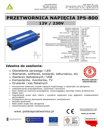 KRS 0000259041 NIP: 585-14-26-167 REGON 220265550 Kapitał zakładowy: 1.806.000 zł AZO Digital Sp. z o.o. Chwaszczyńska 133A, 81-571 Gdynia POLAND tel. +48 58 712 81 79 fax. +48 58 739 62 30 www.azodigital.com [email protected] _______________________________________________ PRZETWORNICA NAPIĘCIA IPS-800 12V / 230V Napięcie wejściowe: Napięcie wyjściowe: Moc maksymalna: Moc chwilowa ~ 30 sekund: Moc ciągła: Przebieg napięcia na wyjściu: Miękki rozruch silników indukcyjnych: Zabezpieczenie przeciążeniowe: Zabezpieczenie zwarciowe: Zabezpieczenie termiczne: Zabezpieczenie nadnapięciowe wejścia zasilania: Ostrzeżenie przed rozładowaniem akumulatora: Temperatura pracy: Sprawność: Chłodzenie: Złącze zasilania: Gniazdo wyjściowe 230V: Obudowa: Stopień ochrony (IP): Wymiary Dł. x Sz. x Wys.: Waga: Kod produktu: 11÷15 VDC 230 VAC 800 VA 600 VA 400 VA Prostokątny NIE TAK TAK 80 °C 15 VDC TAK -25 ~ +55 °C > 92 % Aktywne Złącze śrubowe M6 E (z bolcem) - 1 szt. Aluminium IP21 240 x 88 x 55 [mm] 1 kg 9002001 Idealna do zasilania: • • • • • Oświetlenia żarowego i LED Wiertarek, szlifierek, kosiarek, odkurzaczy, etc Zasilaczy laptopowych i USB Komputerów, monitorów, TV Drukarek i kas fiskalnych • • • • • Procesorowo dobierany kształt napięcia wyjściowego w zależności od obciążenia Zabezpieczenia przeciążeniowe, zwarciowe i termiczne Auto restart po wykryciu przeciążenia, niewymagający ręcznego resetu przetwornicy Miękki start Sygnalizacja przed zbyt niskim i wysokim napięciem oraz głębokim rozładowaniem akumulatora Inteligentne płynne sterowanie wbudowanym wentylatorem Wysoka sprawność Niski pobór prądu bez obciążenia Gwarantowana jakość i bezawaryjność • • • • Wysoka jakość i niezawodność. WWW.AZODIGITAL.COM www. polskieprzetwornice.pl [email protected] MADE IN POLAND