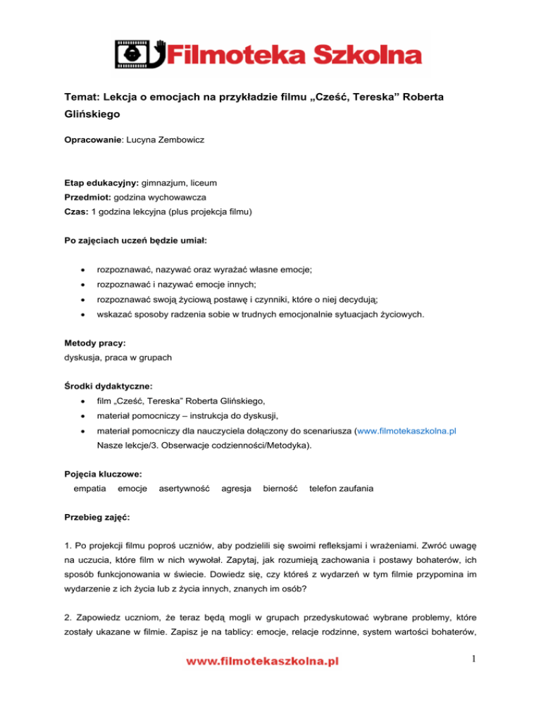 Temat: Lekcja o emocjach na przykładzie filmu „Cześć, Tereska” Roberta Glińskiego Opracowanie: Lucyna Zembowicz Etap edukacyjny: gimnazjum, liceum Przedmiot: godzina wychowawcza Czas: 1 godzina lekcyjna (plus projekcja filmu) Po zajęciach uczeń będzie umiał: • rozpoznawać, nazywać oraz wyrażać własne emocje; • rozpoznawać i nazywać emocje innych; • rozpoznawać swoją życiową postawę i czynniki, które o niej decydują; • wskazać sposoby radzenia sobie w trudnych emocjonalnie sytuacjach życiowych. Metody pracy: dyskusja, praca w grupach Środki dydaktyczne: • film „Cześć, Tereska” Roberta Glińskiego, • materiał pomocniczy – instrukcja do dyskusji, • materiał pomocniczy dla nauczyciela dołączony do scenariusza (www.filmotekaszkolna.pl Nasze lekcje/3. Obserwacje codzienności/Metodyka). Pojęcia kluczowe: empatia emocje asertywność agresja bierność telefon zaufania Przebieg zajęć: 1. Po projekcji filmu poproś uczniów, aby podzielili się swoimi refleksjami i wrażeniami. Zwróć uwagę na uczucia, które film w nich wywołał. Zapytaj, jak rozumieją zachowania i postawy bohaterów, ich sposób funkcjonowania w świecie. Dowiedz się, czy któreś z wydarzeń w tym filmie przypomina im wydarzenie z ich życia lub z życia innych, znanych im osób? 2. Zapowiedz uczniom, że teraz będą mogli w grupach przedyskutować wybrane problemy, które zostały ukazane w filmie. Zapisz je na tablicy: emocje, relacje rodzinne, system wartości bohaterów, 1 gdzie szukać pomocy w trudnej sytuacji. Podziel uczniów na cztery grupy. Zadaniem każdej z nich będzie przeprowadzenie rozmowy na zadany temat (propozycje tematów znajdują się w instrukcji dla uczniów). W każdym zespole możesz wyznaczyć moderatora dyskusji, który będzie czuwał nad czasem oraz porządkiem wypowiedzi, a także osobę, która będzie spisywała wszystkie argumenty i wnioski. Uwaga! Możesz też każdemu z zaproponowanych tematów poświęcić oddzielną godzinę lekcyjną, wówczas dyskusja będzie odbywać się w całej klasie (bez podziału na grupy). Do ciebie należy decyzja w jakiej formie, czasie i z jaką grupą przeprowadzisz rozmowę. 3. Po zakończeniu dyskusji grupy prezentują swoje wnioski. Podsumuj i uzupełnij wypowiedzi uczniów, korzystając z materiału pomocniczego dla nauczyciela. 4. W ramach podsumowania lekcji poproś uczniów o dokończenie zdania: Ten film nauczył mnie…. 5. Zaproponuj uczniom pracę domową: Napisz list o tym, jak czujesz się we własnej rodzinie. Czy w przeciwieństwie do Tereski dostajesz od niej wsparcie, miłość, ciepło? Co was łączy, a jakie są między wami różnice? Czy jest coś, czego ci brakuje w relacjach z rodzicami, rodzeństwem, dziadkami? Jeśli uznasz to za ważne, to pokaż ten list rodzicom, nauczycielowi lub innemu dorosłemu, do którego masz zaufanie. Porozmawiajcie o nim. Możesz też skorzystać z Telefonu Zaufania dla Dzieci i Młodzieży 116 111 oraz strony internetowej www.116111.pl. Załączniki: Materiał pomocniczy Instrukcja do dyskusji Temat I. Emocje Przeprowadźcie w grupie dyskusję na temat emocji ukazanych w filmie „Cześć, Tereska”. Odpowiedzcie na następujące pytania: • Jakie są wasze wrażenia po tym filmie? Co czujecie? Jakie emocje w was obudził? • Jak patrzy na świat główna bohaterka, jakie są jej uczucia? Jaka jest ich wspólna cecha? Jak Tereska radzi sobie ze strachem, niepewnością, smutkiem, złością? • Co główna bohaterka mogłaby zrobić, aby opanować uczucie złości, które doprowadza ją do tak dramatycznego czynu w finale filmu? • Które z uczuć bohaterów filmu podzielasz? 2 • Czy któraś z postaci w filmie wzbudza w tobie rozdrażnienie? Dlaczego? Temat II. Relacje rodzinne Porozmawiajcie o wpływie środowiska rodzinnego i rówieśniczego na kształtowanie charakteru Tereski. Omówcie braki emocjonalne rodziny i otoczenia Tereski. Odpowiedzcie na następujące pytania: • Jaka jest relacja Tereski z ojcem i matką? • Czego brakuje w życiu emocjonalnym bohaterki? • Co wpływa na postawę rodziców wobec Tereski? • W jaki sposób ojciec Tereski buduje swój autorytet? Temat III. System wartości Przeprowadźcie w grupie dyskusję na temat systemu wartości bohaterów filmu „Cześć, Tereska”. Odpowiedzcie na następujące pytania: • Jakie wartości są najważniejsze dla Tereski i jej kolegów? • Czy bohaterowie tego filmu żyją według jakiegoś systemu wartości? • Czy i w jaki sposób Tereska okazuje szacunek samej sobie i innym? • Czy któraś z postaci filmu wzbudza twój szacunek? Kto to był i dlaczego szanujesz tę postać? Temat IV. Gdzie szukać pomocy w trudnej sytuacji? Przeprowadźcie w grupie dyskusję na temat możliwych sposobów pomocy Teresce. Odpowiedzcie na następujące pytania: • Dlaczego Tereska rezygnuje ze swoich marzeń (projektowanie ubrań)? Czy bohaterka prosi o pomoc? Dlaczego nie? • Czy Tereska spotyka na swojej drodze mądrych dorosłych? Co wynika dla niej z tych spotkań? • Czy gdyby dostała wsparcie od kogoś z dorosłych lub przyjaciół odnalazłaby w sobie motywację do realizacji swoich marzeń? • Do kogo Tereska może się udać z prośbą o pomoc? 3 Porozmawiajcie o innych sposobach szukania pomocy i o tym, jak ważna jest umiejętność proszenia o nią. Materiał pomocniczy dla nauczyciela Rozmowa po filmie może stać się okazją do trenowania umiejętności wyrażania swoich emocji (wywołanych przez film) oraz nazywania tych, które są udziałem bohaterów. Ponieważ wielu z nas ma z tym trudności nie zmuszaj uczniów do odpowiedzi na pytania, zadbaj jedynie o stworzenie atmosfery, która sprzyjać będzie szczerym wypowiedziom. Z pewnością pomożesz uruchomić słownictwo umożliwiające opisywanie uczuć, opowiadając o własnych emocjach i niepokojach, które film wywołał. Ważną kwestią jest też uświadomienie sobie, co kryje się za danym u