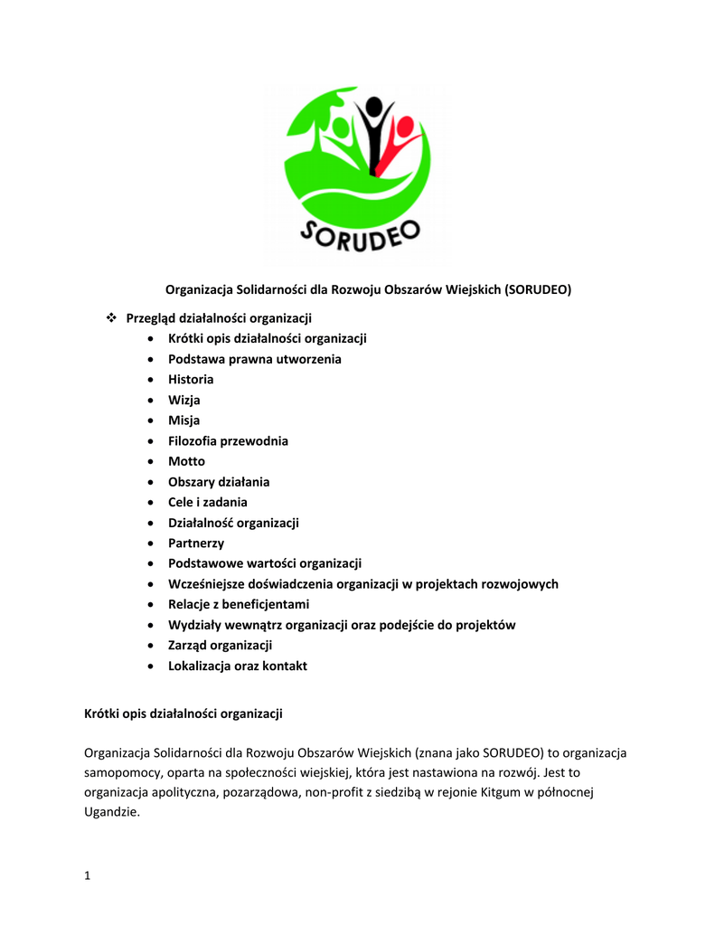 Organizacja Solidarności dla Rozwoju Obszarów Wiejskich (SORUDEO) Przegląd działalności organizacji Krótki opis działalności organizacji Podstawa prawna utworzenia Historia Wizja Misja Filozofia przewodnia Motto Obszary działania Cele i zadania Działalność organizacji Partnerzy Podstawowe wartości organizacji Wcześniejsze doświadczenia organizacji w projektach rozwojowych Relacje z beneficjentami Wydziały wewnątrz organizacji oraz podejście do projektów Zarząd organizacji Lokalizacja oraz kontakt Krótki opis działalności organizacji Organizacja Solidarności dla Rozwoju Obszarów Wiejskich (znana jako SORUDEO) to organizacja samopomocy, oparta na społeczności wiejskiej, która jest nastawiona na rozwój. Jest to organizacja apolityczna, pozarządowa, non-profit z siedzibą w rejonie Kitgum w północnej Ugandzie. 1 Podstawa prawna utworzenia Zgodnie z Konstytucją Republiki Ugandy, organizacja SORUDEO jest prawnie rozpoznawalna w Ugandzie, ponieważ została zarejestrowana jako organizacja społeczna (CBO) w Urzędzie Rejonowym Kitgum i oficjalnie funkcjonuje w rejonie Kitgum pod numerem 11174; a także jest zarejestrowana w Kitgum NGO Forum - KINGFO. SORUDEO została również zarejestrowana i włączona do krajowego rejestru lokalnych organizacji pozarządowych przez rząd Ugandy i Krajową Radę Organizacji Pozarządowych pod numerem 11609; S.5914/12001. Historia SORUDEO powstała w 2011 roku jako mała, rolnicza grupa samopomocy pod nazwą „Stowarzyszenie Solidarności Rolników (SOFA)”, która obrała za cel wyeliminowanie problemu związanego z brakiem żywności. W 2015 roku SOFA została przekształcona na Organizację Solidarności dla Rozwoju Obszarów Wiejskich (SORUDEO), a jej cele i zakres działania zostały poszerzone o: próby wyeliminowania głodu, ubóstwa i przemocy na obszarach wiejskich poprzez zrównoważenie rolnictwa, edukacji, opieki zdrowotnej, ochrony środowiska naturalnego i rozwoju obszarów wiejskich w zakresie społeczno-gospodarczym. Organizacja Solidarności dla Rozwoju Obszarów Wiejskich (SORUDEO) za cel obrała poprawę jakości życia zagrożonych społeczności na obszarach wiejskich poprzez ograniczanie ubóstwa, wzrost gospodarczy i przemiany społeczne. Organizacja jest inicjatorem programów i projektów realizowanych wraz z lokalną społecznością i dla społeczności, które poprawiają jakość życia osób potrzebujących w rejonie Kitgum, w północnej Ugandzie jak: kobiety, ludzie niepełnosprawni, chorzy, sieroty i dzieci wymagające szczególnej opieki (OVC). SORUDEO udziela wsparcia w zakresie rolnictwa, edukacji, oszczędności i inwestycji w gospodarstwach domowych, podstawowej opieki zdrowotnej dla różnych wspólnot i wsparcia psychospołecznego dla kobiet, dzieci i rodzin w najbardziej niekorzystnych sytuacjach. Rejon działania Północna Uganda ucierpiała w ciągu 23 lat rebelii na tle politycznym. W rezultacie panuje tam wysoki poziom analfabetyzmu, głębokie ubóstwo i brak bezpieczeństwa żywnościowego, złe warunki sanitarne, brak wody pitnej, pijaństwo i przemoc, choroby takie jak HIV/AIDS, wirusowe zapalenie wątroby typu B i wysoka śmiertelność, zwłaszcza w przypadku kobiet i osieroconych dzieci. Około 85% rodzin jest w stanie ubóstwa i z trudem usiłuje zaspokoić podstawowe potrzeby życiowe, takie jak jedzenie, lekarstwa, odzież i schronienie. SORUDEO za 2 cel obrało poprawę jakości życia tych społeczności oraz dzieci dotkniętych wojną i potrzebujących specjalnej opieki. Wizja Mocna i pracowita społeczność wiejska, wolna od głodu, ubóstwa i przemocy. Misja Ułatwienie mieszkańcom obszarów wiejskich w północnej Ugandzie stworzenia produktywnego, zjednoczonego, zdrowego, wykształconego, mocnego społecznie i ekonomicznie, rozwijającego się pokojowego społeczeństwa. Filozofia przewodnia Filozofia i doświadczenie SORUDEO opiera się na fakcie, że „wszyscy ludzie są sobie równi i niepowtarzalni; i że wszyscy mają prawo do dobrego życia, zdrowia, edukacji, środowiska produkcyjnego, postępu gospodarczego i innych podstawowych potrzeb człowieka”. Motto Mottem SORUDEO jest: „Wspólnie osiągniemy”. Obszary działania Organizacja koncentruje się na pięciu głównych obszarach tematycznych działania w celu rozwoju obszarów wiejskich, a mianowicie: rolnictwo, edukacja, opieka medyczna, ochrona środowiska i rozwój obszarów wiejskich w aspekcie społeczno-ekonomicznym, a także wszystkich innych obszarach, wartych zaangażowania. Cele i zadania Wzmożone zaangażowanie ludności wiejskiej w północnej Ugandzie w zakresie zrównoważonego rolnictwa, edukacji, opieki zdrowotnej, ochrony środowiska oraz przemian społeczno-gospodarczych. Cele 1. Poprawa produkcji rolnej, produkcji żywności, przechowywania, przetwarzania i wprowadzania do obrotu produktów rolnych. 2. Wsparcie opieki zdrowotnej w obszarach wiejskich. 3. Wspieranie odpowiedniej edukacji dla dorosłych i dzieci z obszarów wiejskich oraz opieki dla sierot i dzieci wymagających specjalnej opieki. 3 4. Poprawa stanu lasów i ochrony środowiska. 5. Stworzenie i pobudzenie rozwoju społeczno-ekonomicznego w obszarach wiejskich. Działalność ta może obejmuje m.in.: 1. Rolnictwo, wprowadzanie do obrotu produktów rolnych, obsługa po zbiorach i składowanie w celu zachowania jakości upraw, dla bezpieczeństwa na rynku spożywczym. 2. Wydatki operacyjne, zarządzanie i prowadzenie oszczędności i usługi kredytowe dla ubogich członków społeczności wiejskich. 3. Organizacja ośrodków szkoleniowych dla poprawy umiejętności w zakresie rolnictwa, przedsiębiorstw handlowych, generowania dochodów, ochrony środowiska, edukacji, zapobiegania przemocy itp. 4. Programy gospodarki wodnej oraz szkolenia w zakresie warunków sanitarnych, higieny i zdrowia. 5. Tworzenie i zarządzanie własnymi szkołami, wspieranie ubogich szkół wiejskich, przychodni/ośrodków zdrowia i sieroci