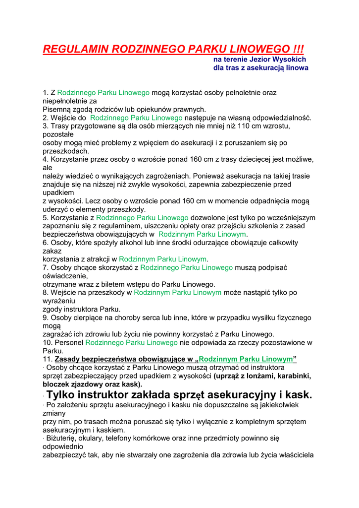 REGULAMIN RODZINNEGO PARKU LINOWEGO !!! na terenie Jezior Wysokich dla tras z asekuracją linowa 1. Z Rodzinnego Parku Linowego mogą korzystać osoby pełnoletnie oraz niepełnoletnie za Pisemną zgodą rodziców lub opiekunów prawnych. 2. Wejście do Rodzinnego Parku Linowego następuje na własną odpowiedzialność. 3. Trasy przygotowane są dla osób mierzących nie mniej niż 110 cm wzrostu, pozostałe osoby mogą mieć problemy z wpięciem do asekuracji i z poruszaniem się po przeszkodach. 4. Korzystanie przez osoby o wzroście ponad 160 cm z trasy dziecięcej jest możliwe, ale należy wiedzieć o wynikających zagrożeniach. Ponieważ asekuracja na takiej trasie znajduje się na niższej niż zwykle wysokości, zapewnia zabezpieczenie przed upadkiem z wysokości. Lecz osoby o wzroście ponad 160 cm w momencie odpadnięcia mogą uderzyć o elementy przeszkody. 5. Korzystanie z Rodzinnego Parku Linowego dozwolone jest tylko po wcześniejszym zapoznaniu się z regulaminem, uiszczeniu opłaty oraz przejściu szkolenia z zasad bezpieczeństwa obowiązujących w Rodzinnym Parku Linowym. 6. Osoby, które spożyły alkohol lub inne środki odurzające obowiązuje całkowity zakaz korzystania z atrakcji w Rodzinnym Parku Linowym. 7. Osoby chcące skorzystać z Rodzinnego Parku Linowego muszą podpisać oświadczenie, otrzymane wraz z biletem wstępu do Parku Linowego. 8. Wejście na przeszkody w Rodzinnym Parku Linowym może nastąpić tylko po wyrażeniu zgody instruktora Parku. 9. Osoby cierpiące na choroby serca lub inne, które w przypadku wysiłku fizycznego mogą zagrażać ich zdrowiu lub życiu nie powinny korzystać z Parku Linowego. 10. Personel Rodzinnego Parku Linowego nie odpowiada za rzeczy pozostawione w Parku. 11. Zasady bezpieczeństwa obowiązujące w „Rodzinnym Parku Linowym” · Osoby chcące korzystać z Parku Linowego muszą otrzymać od instruktora sprzęt zabezpieczający przed upadkiem z wysokości (uprząż z lonżami, karabinki, bloczek zjazdowy oraz kask). · Tylko instruktor zakłada sprzęt asekuracyjny i kask. · Po założeniu sprzętu asekuracyjnego i kasku nie dopuszczalne są jakiekolwiek zmiany przy nim, po trasach można poruszać się tylko i wyłącznie z kompletnym sprzętem asekuracyjnym i kaskiem. · Biżuterię, okulary, telefony komórkowe oraz inne przedmioty powinno się odpowiednio zabezpieczyć tak, aby nie stwarzały one zagrożenia dla zdrowia lub życia właściciela oraz pozostałych klientów. · Osoby noszące długie włosy powinny schować je pod kaskiem aby nie wkręciły się w bloczki i inne elementy parku. · Karabinki lonży asekuracyjnej należy wpinać zamkami w dwie przeciwne strony. · Po każdym wpięciu karabinka należy sprawdzić, czy zamek został poprawnie zamknięty. · Przemieszczając się na kolejne przeszkody należy przepiąć pojedynczo najpierw pierwszy potem drugi karabinek do liny asekuracyjnej. Nie dopuszczalną sytuacją jest wypięcie naraz obydwu karabinków! · Punkty wpięć oznaczone są kolorem czerwonym. · Jeśli na linie stalowej obok podstawowego czerwonego oznaczenia występuje też inny kolor oznacza to, że należy tam wpiąć bloczek oznaczony właśnie takim kolorem. Należy wtedy najpierw wpiąć bloczek w linę, kontrolując czy lonża nie jest skręcona. Dopiero potem kolejno przepiąć karabinki z lonży asekuracyjnej tak aby na linie zjazdowej w pierwszej kolejności znajdował się bloczek zjazdowy. Kolejność jest oznaczona kolorami. · Podczas zjazdu na bloczku należy trzymać się tylko lonży bloczka. · Chwytanie w czasie zjazdu stalowej liny grozi poważnym skaleczeniem! · Jedyną dopuszczalną pozycją zjazdu jest pozycja „siedząca”. · Podczas dojeżdżania do podestu należy unieść nogi i lekko je zgiąć w kolanach tak aby zamortyzować ewentualne uderzenie o materac. W momencie zatrzymania należy chwycić ręką dodatkowej liny lub pętli aby nie odjechać od podestu. Nie wolno łapać się liny za bloczkiem aby powracający bloczek nie najechał nam na rękę. · Uwaga!!! W ostatniej fazie zjazdu nie wyciągać przed siebie rąk w kierunku materaca. · Jeśli nie udało nam się zatrzymać na podeście i zjechaliśmy z powrotem. Należy zaczekać aż się zatrzymamy a następnie chwytając liny nośnej dociągnąć do podestu ustawiając się głową w kierunku jazdy. · Po przejechaniu na linie powinno się zachować następującą kolejność przepinania sprzętu asekuracyjnego; najpierw wypinamy jeden karabinek i wpinamy go do pętli oplecionej wokół drzewa, następnie wypinamy bloczek i wpinamy go do ucha u boku uprzęży, jako ostatni wypinamy karabinek będący jeszcze na stalowej linie zjazdowej i wpinamy go do kontynuacji tej liny. · Przy pokonywaniu ścianki wspinaczkowej, pochylni, drabiny i pala buszmena karabinki lonży przepinamy tak często aby nie znalazły się poniżej punktu mocowania do uprzęży (wysokość pasa) · Podczas przechodzenia przez Park Linowy wskazany jest spokój, nie można skakać po przeszkodach i huśtać się na atrakcjach do tego nie przeznaczonych. · Na pojedynczej przeszkodzie może znajdować się tylko jedna osoba. · Na podeście mogą znajdować się maksymalnie dwie osoby. · Bezwzględnie zakazane jest wychylanie się poza barierki i sieci asekuracyjne, co grozić może upadkiem. · Bezwzględnie zakazane jest stawanie na barierki i sieci asekuracyjne, co grozić może upadkiem. · Zakazane jest bieganie, skakanie i robienie przewrotu w przód(fikołek). · Trasa z siatkami przygotowana jest dla osób do 120kg. · Osoby nieupoważnione nie mogą znajdować się w pobliżu ścianki wspinaczkowej, pod trasą parku i w pobliżu zjazdów. · W przypadku utraty sił, rezygnacji lub innych przyczyn uniemożliwiających zakończenie trasy należy wezwać obsługę Parku Linowego, zostaniemy sprawnie sprowadzeni na ziemię. · Podczas wizyty w Rodzinnym Parku Linowym powinniśmy bezwzględnie wykonywać polecenia 