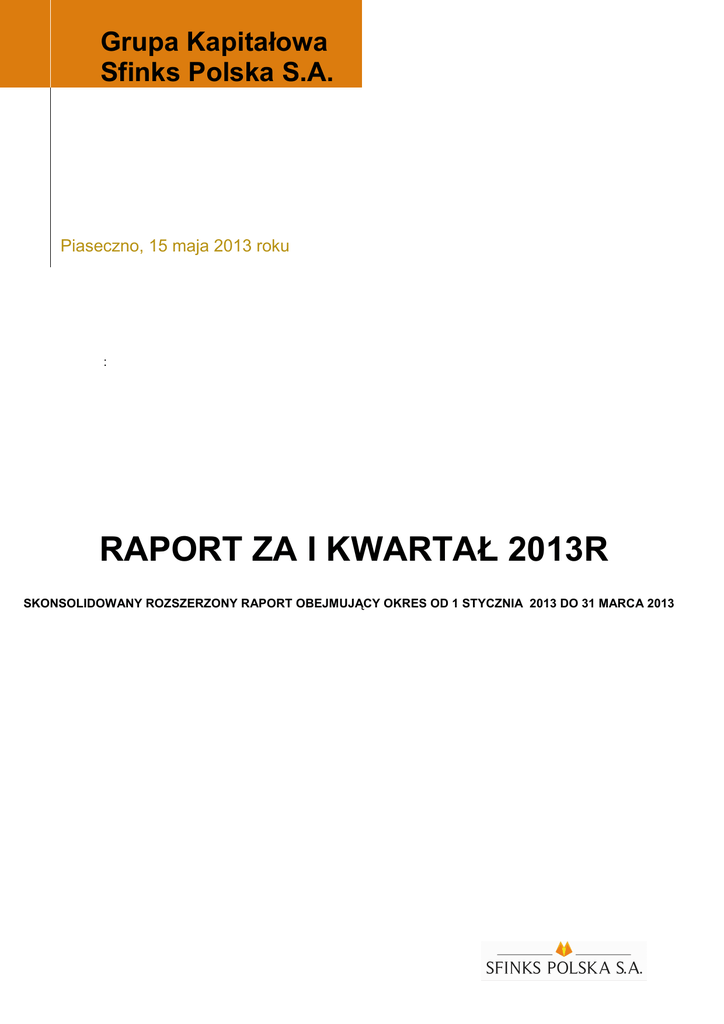 Grupa Kapitałowa Sfinks Polska S.A. Piaseczno, 15 maja 2013 roku : RAPORT ZA I KWARTAŁ 2013R SKONSOLIDOWANY ROZSZERZONY RAPORT OBEJMUJĄCY OKRES OD 1 STYCZNIA 2013 DO 31 MARCA 2013 Wybrane dane finansowe skonsolidowanego śródrocznego sprawozdania finansowego Grupy Kapitałowej Sfinks Polska S.A. WYBRANE DANE FINANSOWE I. Przychody netto ze sprzedaży produktów, towarów i materiałów II. Zysk (strata) z działalności operacyjnej w tys. PLN w tys. EUR 2013 2012 2013 2012 narastająco okres od 01-01-2013 narastająco okres od 01-01-2012 narastająco okres od 01-01-2013 narastająco okres od 01-01-2012 do 31-03-2013 do 31-03-2012 do 31-03-2013 do 31-03-2012 40 143 41 008 9 618 9 822 (154) (1 505) (37) (360) III. Zysk (strata) brutto (1 568) (3 242) (376) (777) IV. Zysk (strata) netto (1 580) (3 279) (379) (785) (37) 3 666 (9) 878 (5 042) (18) (1 208) (4) 5 488 (2 818) 1 315 (675) V. Przepływy pieniężne netto z działalności operacyjnej VI. Przepływy pieniężne netto z działalności inwestycyjnej VII. Przepływy pieniężne netto z działalności finansowej VIII. Przepływy pieniężne netto, razem 409 830 98 199 IX. Zysk na jedną akcję (w zł/EUR) (0,10) (0,20) (0,02) (0,05) X. Rozwodniony zysk (strata) netto na jedną akcję zwykłą (w zł/EUR) (0,10) (0,20) (0,02) (0,05) w tys. PLN stan na 31.03.2013 XI. Aktywa razem XII. Zobowiązania i rezerwy na zobowiązania XIII. Zobowiązania długoterminowe XIV. Zobowiązania krótkoterminowe XV. Kapitał własny XVI. Kapitał podstawowy XVII. Liczba akcji (w szt.) w tys. EUR stan na 31.12.2012 stan na 31.03.2013 stan na 31.12.2012 68 490 65 212 16 395 123 398 119 213 29 539 15 951 29 160 94 904 91 366 22 718 22 349 28 494 27 847 6 821 6 812 (54 908) (54 001) (13 144) (13 209) 22 106 22 106 5 292 5 407 22 105 626 22 105 626 22 105 626 22 105 626 XVII. Wartość księgowa na jedną akcję (w zł/EUR) (2,59) (2,62) (0,62) (0,64) XIX. Rozwodniona wartość księgowa na jedną akcję (w zł/EUR) (2,59) (2,62) (0,62) (0,64) XX. Zadeklarowana lub wypłacona dywidenda na jedną akcję (w zł/EUR) 0 0 0 0 Informacja dotycząca średnich zastosowanych kursów wymiany złotego w okresie objętym sprawozdaniem finansowym i porównywalnych danych finansowych w stosunku do Euro ustalanych przez NBP a) przychody netto ze sprzedaży produktów, towarów i materiałów, zysk z działalności operacyjnej, zysk brutto i zysk netto oraz przepływy pieniężne netto z działalności operacyjnej, inwestycyjnej, finansowej i przepływy netto za pierwszy kwartał 2013 roku, obliczono przyjmując średni kurs EURO według kursu stanowiącego średnią arytmetyczną średnich kursów NBP na ostatni dzień poszczególnych miesięcy 2013 roku, tj: 4,1738 PLN. b) przychody netto ze sprzedaży produktów, towarów i materiałów, zysk z działalności operacyjnej, zysk brutto i zysk netto oraz przepływy pieniężne netto z działalności operacyjnej, inwestycyjnej, finansowej i przepływy netto za pierwszy kwartał 2012 roku, obliczono przyjmując średni kurs EURO według kursu stanowiącego średnią arytmetyczną średnich kursów NBP na ostatni dzień poszczególnych miesięcy 2012 roku, tj: 4,1750 PLN. c) aktywa razem, zobowiązania i rezerwy na zobowiązania, zobowiązania długoterminowe, zobowiązania krótkoterminowe, kapitał własny oraz kapitał zakładowy na 31.03.2013 roku obliczono przyjmując średni kurs EURO na dzień 29.03.2013 roku, tj.: 4,1774 PLN. d) aktywa razem, zobowiązania i rezerwy na zobowiązania, zobowiązania długoterminowe, zobowiązania krótkoterminowe, kapitał własny oraz kapitał zakładowy na 31.12.2012 roku obliczono przyjmując średni kurs EURO na dzień 31.12.2012 roku, tj.: 4,0882 PLN. Grupa Kapitałowa Sfinks Polska S.A. Piaseczno, 15 maja 2013 roku SPRAWOZDANIE Z DZIAŁALNOŚCI GRUPY KAPITAŁOWEJ SFINKS POLSKA S.A. ZA I KWARTAŁ 2013R Grupa Kapitałowa Sfinks Polska S.A. Raport za I kwartał 2013roku (SA-QSr) 1. Opis organizacji Gupy Kapitałowej Sfinks Polska S.A. Na dzień 31 marca 2013 roku w skład Grupy Kapitałowej Sfinks Polska S.A. wchodziły następujące spółki zależne powiązane kapitałowo: 1) 2) 3) 4) 5) 6) 7) SFINKS Deutschland GmbH Düsseldorf, Niemcy – 100% udziałów Sfinks Czech &Slovakia s.r.o. Praga, Republika Czeska- 100% udziałów Shanghai Express Sp. z o.o., Łódź, Polska – 100% udziałów W-Z.pl Sp. z o.o., Poznań, Polska – 100% udziałów SPV.REST1 Sp. z o.o., Piaseczno, Polska – 100% udziałów SPV.REST2 Sp. z o.o., Piaseczno, Polska – 100% udziałów SPV.REST3 Sp. z o.o., Piaseczno, Polska – 100% udziałów Dodatkowo dzień 31 marca 2013r w skład Grupy Kapitałowej Sfinks Polska S.A wchodziły następujące podmioty gospodarcze prowadzące restauracje na zasadzie franczyzy podlegające konsolidacji: Nazwa Spółki 1 2 3 4 5 6 7 8 9 10 11 12 13 14 15 16 17 18 19 20 21 22 23 Siedziba Spółki Restauracja Sphinx Jerzy Furman, Elwira Galubińska Spółka Jawna Restauracja Sfinks, Skóra Spółka Jawna Restauracja Sfinks Nadolny Spółka Jawna Restauracja Sfinks A. J. Kozłowscy Spółka Jawna Sphinx Jacek Podolski Joanna Podolska Spółka Jawna ul. 10-go Lutego 11, 81-301 Gdynia ul. Staromiejska 15, 10-017 Olsztyn ul. Obłaczkowo 9A, 62-300 Września Restauracja Wook Jonas-Mańczak Spółka Jawna ul. Plac Grunwaldzki 22, 50-384 Wrocław ul. Rajska 10, 80-850 Gdańsk ul. Św. Marcin 66/72, 60-807 Poznań Restauracja Sphinx B. Jonas-Mańczak, A. Mańczak pl. Grunwaldzki 22, 50-384 Wrocław Spółka Jawna Restauracja Chłopskie Jadło Drzycinscy Spółka Jawna pl. Konstytucji 1, 00-647 Warszawa ul. Wojska Polskiego 25/27, 70-470 Restauracje Witkowscy Spółka Jawna Szczecin Restauracje Sphinx Marcin Rzeszotek ul. Niegocińska 14/10; 02-698 Warszawa ul. A. Mickiewicza 17/3; 34-200 Sucha Marcin Bańdura Restauracja Sphinx Beskidzka KINREIM Paweł Miernik ul. Nałkowskiej 1/25; 25-546 Kielce Paweł Sawicki Sphinx Restauracja ul. Rynkowa 24; 08-110 Siedlce Holdex Sp. z o.o. ul