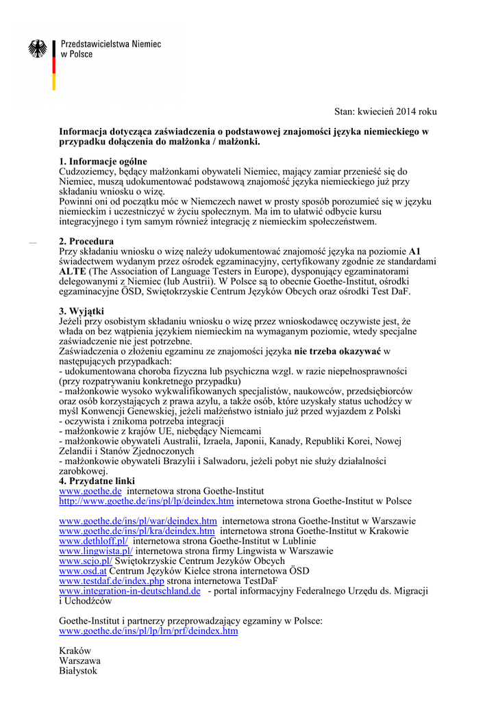 Stan: kwiecień 2014 roku Informacja dotycząca zaświadczenia o podstawowej znajomości języka niemieckiego w przypadku dołączenia do małżonka / małżonki. 1. Informacje ogólne Cudzoziemcy, będący małżonkami obywateli Niemiec, mający zamiar przenieść się do Niemiec, muszą udokumentować podstawową znajomość języka niemieckiego już przy składaniu wniosku o wizę. Powinni oni od początku móc w Niemczech nawet w prosty sposób porozumieć się w języku niemieckim i uczestniczyć w życiu społecznym. Ma im to ułatwić odbycie kursu integracyjnego i tym samym również integrację z niemieckim społeczeństwem. 2. Procedura Przy składaniu wniosku o wizę należy udokumentować znajomość języka na poziomie A1 świadectwem wydanym przez ośrodek egzaminacyjny, certyfikowany zgodnie ze standardami ALTE (The Association of Language Testers in Europe), dysponujący egzaminatorami delegowanymi z Niemiec (lub Austrii). W Polsce są to obecnie Goethe-Institut, ośrodki egzaminacyjne ÖSD, Swiętokrzyskie Centrum Języków Obcych oraz ośrodki Test DaF. 3. Wyjątki Jeżeli przy osobistym składaniu wniosku o wizę przez wnioskodawcę oczywiste jest, że włada on bez wątpienia językiem niemieckim na wymaganym poziomie, wtedy specjalne zaświadczenie nie jest potrzebne. Zaświadczenia o złożeniu egzaminu ze znajomości języka nie trzeba okazywać w następujących przypadkach: - udokumentowana choroba fizyczna lub psychiczna wzgl. w razie niepełnosprawności (przy rozpatrywaniu konkretnego przypadku) - małżonkowie wysoko wykwalifikowanych specjalistów, naukowców, przedsiębiorców oraz osób korzystających z prawa azylu, a także osób, które uzyskały status uchodźcy w myśl Konwencji Genewskiej, jeżeli małżeństwo istniało już przed wyjazdem z Polski - oczywista i znikoma potrzeba integracji - małżonkowie z krajów UE, niebędący Niemcami - małżonkowie obywateli Australii, Izraela, Japonii, Kanady, Republiki Korei, Nowej Zelandii i Stanów Zjednoczonych - małżonkowie obywateli Brazylii i Salwadoru, jeżeli pobyt nie służy działalności zarobkowej. 4. Przydatne linki www.goethe.de internetowa strona Goethe-Institut http://www.goethe.de/ins/pl/lp/deindex.htm internetowa strona Goethe-Institut w Polsce www.goethe.de/ins/pl/war/deindex.htm internetowa strona Goethe-Institut w Warszawie www.goethe.de/ins/pl/kra/deindex.htm internetowa strona Goethe-Institut w Krakowie www.dethloff.pl/ internetowa strona Goethe-Institut w Lublinie www.lingwista.pl/ internetowa strona firmy Lingwista w Warszawie www.scjo.pl/ Swiętokrzyskie Centrum Jezyków Obcych www.osd.at Centrum Języków Kielce strona internetowa ÖSD www.testdaf.de/index.php strona internetowa TestDaF www.integration-in-deutschland.de - portal informacyjny Federalnego Urzędu ds. Migracji i Uchodźców Goethe-Institut i partnerzy przeprowadzający egzaminy w Polsce: www.goethe.de/ins/pl/lp/lrn/prf/deindex.htm Kraków Warszawa Białystok 2 Gdańsk Katowice Kielce Łódź Lublin Olsztyn Opole Poznań Rzeszów Szczecin Toruń Wrocław Zielona Góra Ośrodki egzaminacyjne ÖSD w Polsce: http://v1.osd.at/zentren/zentrenListe.asp?l=Polen Kraków Łódź Poznań Sopot Szczecin Warszawa Wrocław Ośrodki egzaminacyjne TestDaF w Polsce: www.testdaf.de/teilnehmer/tn-pruefung_testzentren_welt.php#P Kraków, TU - FSZ Leszno, NKJO Rzeszów, Uniwersytet Rzeszowski Szczecin, Uniwersytet Toruń, Uniwersytet Mikołaja Kopernika Warszawa, SGH Wrocław, Uniwersytet Ekonomiczny we Wrocławiu Zielona Góra, Uniwersytet Zielona Góra, Prywatna Szkoła