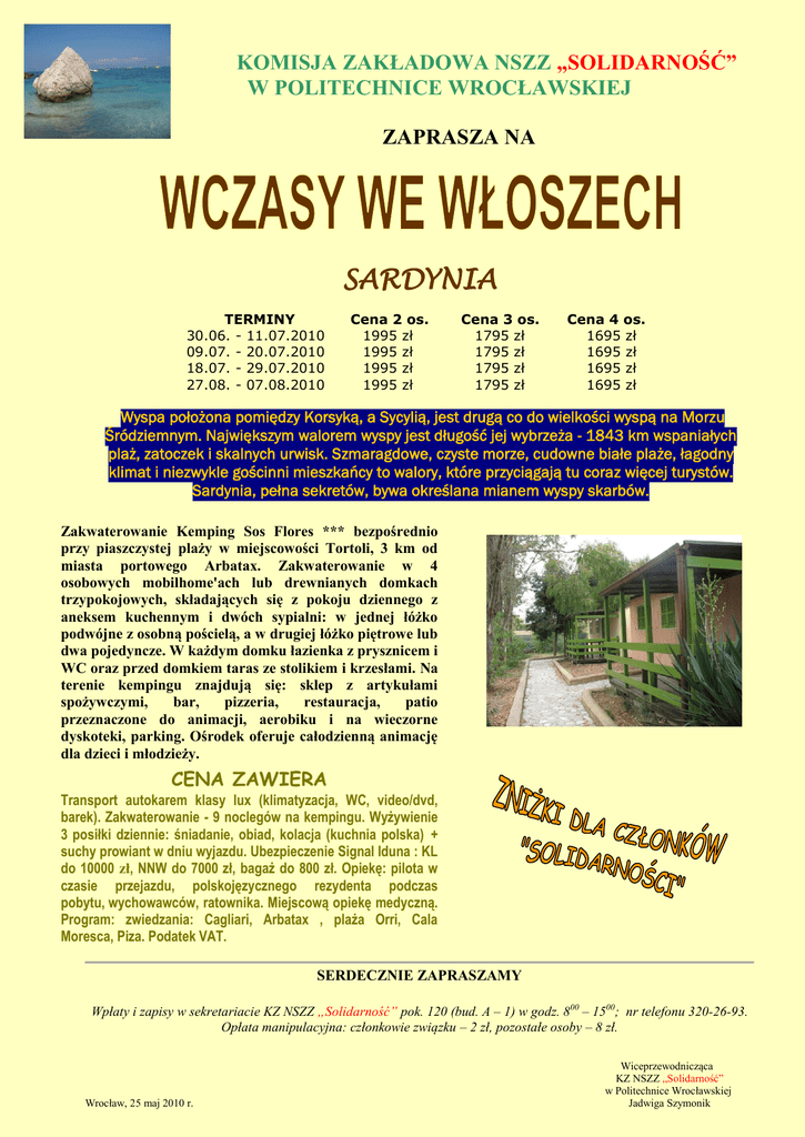KOMISJA ZAKŁADOWA NSZZ „SOLIDARNOŚĆ” W POLITECHNICE WROCŁAWSKIEJ ZAPRASZA NA SARDYNIA TERMINY 30.06. - 11.07.2010 09.07. - 20.07.2010 18.07. - 29.07.2010 27.08. - 07.08.2010 Cena 2 os. 1995 zł 1995 zł 1995 zł 1995 zł Cena 3 os. 1795 zł 1795 zł 1795 zł 1795 zł Cena 4 os. 1695 zł 1695 zł 1695 zł 1695 zł Wyspa położona pomiędzy Korsyką, a Sycylią, jest drugą co do wielkości wyspą na Morzu Śródziemnym. Największym walorem wyspy jest długość jej wybrzeża - 1843 km wspaniałych plaż, zatoczek i skalnych urwisk. Szmaragdowe, czyste morze, cudowne białe plaże, łagodny klimat i niezwykle gościnni mieszkańcy to walory, które przyciągają tu coraz więcej turystów. Sardynia, pełna sekretów, bywa określana mianem wyspy skarbów. Zakwaterowanie Kemping Sos Flores *** bezpośrednio przy piaszczystej plaży w miejscowości Tortoli, 3 km od miasta portowego Arbatax. Zakwaterowanie w 4 osobowych mobilhome'ach lub drewnianych domkach trzypokojowych, składających się z pokoju dziennego z aneksem kuchennym i dwóch sypialni: w jednej łóżko podwójne z osobną pościelą, a w drugiej łóżko piętrowe lub dwa pojedyncze. W każdym domku łazienka z prysznicem i WC oraz przed domkiem taras ze stolikiem i krzesłami. Na terenie kempingu znajdują się: sklep z artykułami spożywczymi, bar, pizzeria, restauracja, patio przeznaczone do animacji, aerobiku i na wieczorne dyskoteki, parking. Ośrodek oferuje całodzienną animację dla dzieci i młodzieży. CENA ZAWIERA Transport autokarem klasy lux (klimatyzacja, WC, video/dvd, barek). Zakwaterowanie - 9 noclegów na kempingu. Wyżywienie 3 posiłki dziennie: śniadanie, obiad, kolacja (kuchnia polska) + suchy prowiant w dniu wyjazdu. Ubezpieczenie Signal Iduna : KL do 10000 zł, NNW do 7000 zł, bagaż do 800 zł. Opiekę: pilota w czasie przejazdu, polskojęzycznego rezydenta podczas pobytu, wychowawców, ratownika. Miejscową opiekę medyczną. Program: zwiedzania: Cagliari, Arbatax , plaża Orri, Cala Moresca, Piza. Podatek VAT. SERDECZNIE ZAPRASZAMY Wpłaty i zapisy w sekretariacie KZ NSZZ „Solidarność” pok. 120 (bud. A – 1) w godz. 800 – 1500; nr telefonu 320-26-93. Opłata manipulacyjna: członkowie związku – 2 zł, pozostałe osoby – 8 zł. Wrocław, 25 maj 2010 r. Wiceprzewodnicząca KZ NSZZ „Solidarność” w Politechnice Wrocławskiej Jadwiga Szymonik