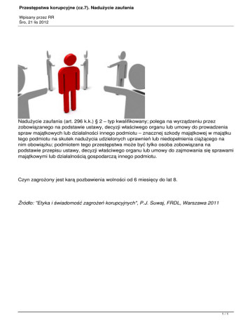 Przestępstwa korupcyjne (cz.7). Nadużycie zaufania Wpisany przez RR Śro, 21 lis 2012 Nadużycie zaufania (art. 296 k.k.) § 2 – typ kwalifikowany; polega na wyrządzeniu przez zobowiązanego na podstawie ustawy, decyzji właściwego organu lub umowy do prowadzenia spraw majątkowych lub działalności innego podmiotu – znacznej szkody majątkowej w majątku tego podmiotu na skutek nadużycia udzielonych uprawnień lub niedopełnienia ciążącego na nim obowiązku; podmiotem tego przestępstwa może być tylko osoba zobowiązana na podstawie przepisu ustawy, decyzji właściwego organu lub umowy do zajmowania się sprawami majątkowymi lub działalnością gospodarczą innego podmiotu. Czyn zagrożony jest karą pozbawienia wolności od 6 miesięcy do lat 8. Źródło: "Etyka i świadomość zagrożeń korupcyjnych", P.J. Suwaj, FRDL, Warszawa 2011 1/1