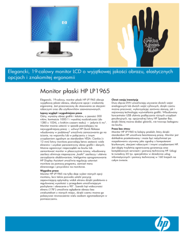 Elegancki, 19-calowy monitor LCD o wyjątkowej jakości obrazu, elastycznych opcjach i znakomitej ergonomii Monitor płaski HP LP1965 Elegancki, 19-calowy, monitor płaski HP LP1965 oferuje wyjątkową jakość obrazu, elastyczne opcje i znakomitą ergonomię. Jest przeznaczony do stosowania ze stacjami roboczymi oraz dla użytkowników zaawansowanych. Lepszy wygląd i wygodniejsza praca Ostry, wyraźny obraz grafiki i tekstów, o jasności 300 nitów, kontraście 1000:1 i wysokiej rozdzielczości (do 1280 x 1024), z krótkim czasem reakcji — jedynie 6 ms1. Monitor można ustawić w sposób pozwalający na najwygodniejszą pracę — uchwyt HP Quick Release wbudowany w podstawę2 umożliwia zamocowanie go na ścianie, na wsporniku lub w połączeniu z innym urządzeniem zgodnym ze standardem VESA: Cienkie (< 12 mm) listwy monitora pozwalają łatwo zestawić wiele ekranów i uzyskać panoramiczny obraz grafiki i danych; Można ograniczyć nieporządek na biurku lub zamontować monitor w płaszczyźnie ściany; wbudowany zasilacz eliminuje nieporęczne „kostki” zasilaczy i ułatwia zarządzanie okablowaniem; Inteligentne oprogramowanie HP Display Assistant umożliwia regulację ustawień monitora za pomocą programu, zamiast menu ekranowego i przycisków na monitorze. Wygodna praca Monitor HP LP1965 nie tylko daje wybór różnych opcji montażu, lecz także pozwala ustalić pozycję zapewniającą optymalny widok ekranu dzięki podstawie o regulowanej wysokości z przegubem umożliwiającym pochylanie i obracanie o 90°. Szeroki kąt widoczności ekranu (178°) umożliwia oglądanie obrazu bez zniekształceń z różnych miejsc, dzięki czemu można go pokazywać równocześnie wielu osobom zgromadzonym w pomieszczeniu. Chroń swoją inwestycję Dwa złącza DVI-I umożliwiają używanie dwóch wejść analogowych lub dwóch wejść cyfrowych, dzięki czemu można pracować, wykorzystując zarówno starszą, jak i najnowszą technologię wyświetlania grafiki. Wbudowany koncentrator USB ułatwia podłączanie różnych urządzeń peryferyjnych, np. opcjonalnej listwy HP Speaker Bar, dzięki której można dodać głośniki, nie tworząc bałaganu na biurku. Praca bez stresu Monitor HP LP1965 to kolejny produkt, który dzięki standardom HP umożliwia bezstresową pracę. Monitor jest dokładnie przetestowany i może być natychmiast po rozpakowaniu używany jako zgodny z komputerami biurkowymi, stacjami roboczymi i innymi urządzeniami HP. Jest objęty trzyletnią ograniczoną gwarancją oraz kompleksowym serwisem i pomocą techniczną HP. Usługi te świadczy 65 tys. specjalistów w dziedzinie usług informatycznych i pomocy technicznej w 160 krajach na całym świecie. Monitor płaski HP LP1965 Typ Aktywna matryca TFT (thin film transistor); powłoka antyrefleksyjna i antystatyczna Widoczny obszar obrazu przekątna 19 cali Kąt podglądu 178° w poziomie, 178° w pionie Jasność 300 nitów Kontrast obrazu 1000:1 Poziom reakcji 6 ms (typowy, od szarości do szarości), 20 ms (czas zapalania i gaszenia plamki) Rozstaw plamki/pikseli 0,294 mm Obsługiwana głębia kolorów 16,7 miliona kolorów Częstotliwość Częstotliwość pozioma: 24-83 kHz, Częstotliwość pionowa: 48-76 Hz Rozdzielczość 1280 x 1024 @ 60 Hz (własna), wszystkie tryby VESA do 1280 x 1024 przy 75 Hz Sygnał wejściowy Dwa złącza, dual DVI-I (VGA analogowe i cyfrowe) Kabel monitora VGA do DVI-I, DVI-D do DVI-D, przewody w komplecie Sterowanie (menu ekranowe) Wielkość i położenie, kontrast, jasność, zegar, faza zegara, temperatura barwowa, numer seryjny, tryb pracy, timer trybu uśpienia, wybór wejścia, przywracanie ustawień fabrycznych, indywidualne ustawianie kolorów, rozdzielczość pełnoekranowa Funkcje podstawowe uchylanie pionowe od -4° do 30°, obracanie ±45°, ustawienie poziome/pionowe z obrotem o 90°, zakres regulacji wysokości 10 cm, odłączana podstawa na zatrzask Koncentrator USB 2.0 z własnym zasilaniem Jeden port wychodzący, cztery porty przychodzące (kabel w zestawie) Oprogramowanie HP Display Assistant to oprogramowanie usługowe, które umożliwia regulację monitora, kalibrację kolorów i zarządzanie zabezpieczeniami i zasobami za pomocą protokołu Display Data Channel Command Interface (DDC/CI) wykorzystywanego w komputerze PC podłączonym do monitora Funkcja HP Display LiteSaver pozwala użytkownikowi zaprogramować tryb uśpienia na określony czas, zapewniając ochronę monitora przed utrwalaniem obrazu, radykalnie obniżając zużycie i koszty energii oraz wydłużając czas eksploatacji monitora Oprogramowanie Pivot Pro firmy Portrait Displays Inc. współpracuje z kartą graficzną zainstalowaną w komputerze użytkownika, umożliwiając zmianę orientacji obrazu na pionową jednym kliknięciem myszki lub za pomocą polecenia wydanego z klawiatury. Oprogramowanie Pivot Pro obsługuje zarówno poziomą, jak i pionową orientację obrazu po obróceniu urządzenia o 90°. Dostępne są następujące wersje językowe: angielska, japońska, francuska, niemiecka, hiszpańska, włoska oraz w tradycyjnym i uproszczonym chińskim Pobór mocy Maks. 55 W, typowo 35 W Zasilacz Automatycznie rozpoznawanie napięcia w zakresie od 90 do 265 V, wbudowany zasilacz wewnętrzny od 50 do 60 Hz Pobór mocy, czuwanie 2 W Wymiary (szer. x głęb. x wys.) Bez podstawy: 40,39 x 6,1 x 32,91 cm, z podstawą: 40,39 x 22,29 x 37,72-47,72 cm Waga Bez podstawy: 4,19 kg, z podstawą: 7,06 kg Certyfikaty, normy Atest ACA (Australia), spełnia wymagania kandyjskie/CSA, znak CE, atest CCIB/CCEE (Chiny), spełnia wymagania CISPR, atesty wschodnioeuropejskie, zgodność z normą Energy Star, atest FCC, niemiecka norma ergonomiczna (znaki TUV i GS), zgodność z normą ISO 13406-2 (wytyczne dotyczące wadliwych pikseli), atest NOM (Meksyk), Zgodność z MPR-II, zgodność z normą PC2001, certyfikat PC99, atest MIC (Korea Płd.), atest BSMI (Tajwan), zgodność z TCO 03 w zależności od regionu 