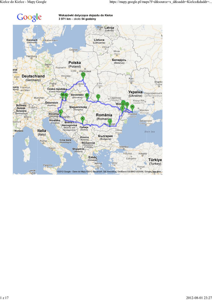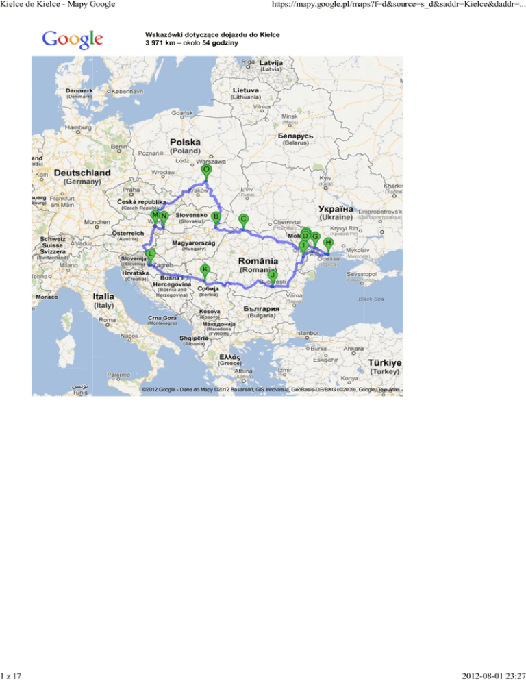 Kielce do Kielce - Mapy Google 1 z 17 https://mapy.google.pl/maps?f=d&source=s_d&saddr=Kielce&daddr=... Wskazówki dotyczące dojazdu do Kielce 3 971 km – około 54 godziny Wczytywanie... ©2012 Google - Dane do Mapy ©2012 Basarsoft, GIS Innovatsia, GeoBasis-DE/BKG (©2009), Google, Tele Atlas - 2012-08-01 23:27