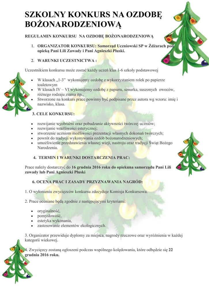 SZKOLNY KONKURS NA OZDOBĘ BOŻONARODZENIOWĄ REGULAMIN KONKURSU NA OZDOBĘ BOŻONARODZENIOWĄ 1. ORGANIZATOR KONKURSU: Samorząd Uczniowski SP w Żdżarach pod opieką Pani Lili Zawady i Pani Agnieszki Płuski. 2. WARUNKI UCZESTNICTWA : Uczestnikiem konkursu może zostać każdy uczeń klas 1-6 szkoły podstawowej W klasach „1-3” wykonujemy ozdobę z wykorzystaniem rolek po papierze toaletowym W klasach IV – VI wykonujemy ozdobę z papieru, sznurka, suszonych owoców, różnego rodzaju ziarna itp., Stworzone na konkurs prace powinny być podpisane przez autora wg wzoru: imię i nazwisko, klasa. 3. CELE KONKURSU: rozwijanie wyobraźni oraz pobudzanie aktywności twórczej uczniów; rozwijanie wrażliwości estetycznej; stworzenie uczniom możliwości prezentacji własnych dokonań twórczych; powrót do tradycji wykonywania ozdób bożonarodzeniowych; umożliwienie przedstawienia własnej wizji, nastroju oraz tradycji Świąt Bożego Narodzenia. 4. TERMIN I WARUNKI DOSTARCZENIA PRAC: Prace należy dostarczyć do 16 grudnia 2016 roku do opiekuna samorządu Pani Lili zawady lub Pani Agnieszki Płuski 6. OCENA PRAC I ZASADY PRZYZNAWANIA NAGRÓD: 1. O wyłonieniu zwycięzców konkursu zdecyduje Komisja Konkursowa. 2. Prace oceniane będą zgodnie z następującymi kryteriami: oryginalność, pomysłowość, estetyka wykonania, zastosowanie elementów ekologicznych. 3. Organizator przewiduje dyplomy za miejsca, nagrody rzeczowe oraz wyróżnienia w każdej kategorii wiekowej. 4. Zwycięzcy zostaną ogłoszeni podczas wspólnego kolędowania, które odbędzie się 22 grudnia 2016 roku.