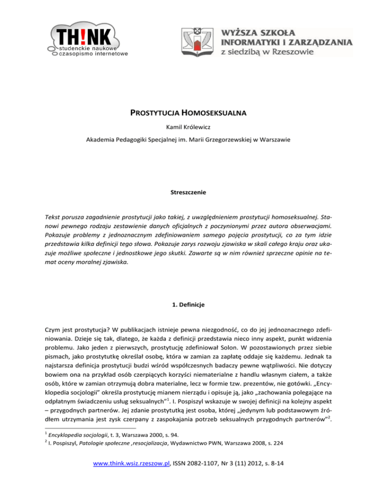 PROSTYTUCJA HOMOSEKSUALNA Kamil Królewicz Akademia Pedagogiki Specjalnej im. Marii Grzegorzewskiej w Warszawie Streszczenie Tekst porusza zagadnienie prostytucji jako takiej, z uwzględnieniem prostytucji homoseksualnej. Stanowi pewnego rodzaju zestawienie danych oficjalnych z poczynionymi przez autora obserwacjami. Pokazuje problemy z jednoznacznym zdefiniowaniem samego pojęcia prostytucji, co za tym idzie przedstawia kilka definicji tego słowa. Pokazuje zarys rozwoju zjawiska w skali całego kraju oraz ukazuje możliwe społeczne i jednostkowe jego skutki. Zawarte są w nim również sprzeczne opinie na temat oceny moralnej zjawiska. 1. Definicje Czym jest prostytucja? W publikacjach istnieje pewna niezgodnośd, co do jej jednoznacznego zdefiniowania. Dzieje się tak, dlatego, że każda z definicji przedstawia nieco inny aspekt, punkt widzenia problemu. Jako jeden z pierwszych, prostytucję zdefiniował Solon. W pozostawionych przez siebie pismach, jako prostytutkę określał osobę, która w zamian za zapłatę oddaje się każdemu. Jednak ta najstarsza definicja prostytucji budzi wśród współczesnych badaczy pewne wątpliwości. Nie dotyczy bowiem ona na przykład osób czerpiących korzyści niematerialne z handlu własnym ciałem, a także osób, które w zamian otrzymują dobra materialne, lecz w formie tzw. prezentów, nie gotówki. „Encyklopedia socjologii” określa prostytucję mianem nierządu i opisuje ją, jako „zachowania polegające na odpłatnym świadczeniu usług seksualnych”1. I. Pospiszyl wskazuje w swojej definicji na kolejny aspekt – przygodnych partnerów. Jej zdanie prostytutką jest osoba, której „jedynym lub podstawowym źródłem utrzymania jest zysk czerpany z zaspokajania potrzeb seksualnych przygodnych partnerów”2. 1 2 Encyklopedia socjologii, t. 3, Warszawa 2000, s. 94. I. Pospiszyl, Patologie społeczne ,resocjalizacja, Wydawnictwo PWN, Warszawa 2008, s. 224 www.think.wsiz.rzeszow.pl, ISSN 2082-1107, Nr 3 (11) 2012, s. 8-14 Prostytucja homoseksualna Jednak i ta definicja nie jest pełna, gdyż nie obejmuje osób świadczących tego typu usługi okazjonalnie. Natomiast P. Czarnecki pisze: „przez prostytucję rozumiem postępowanie polegające na sprzedawaniu lub wypożyczaniu własnego ciała innym osobom w celu osiągnięcia przez te osoby satysfakcji seksualnej. W zakres tak pojętej prostytucji wchodzi zatem także tzw. sponsoring”3. Również polskie prawo nie jest w stanie jednoznacznie zdefiniowad tego zjawiska. Nie skupia się na osobie prostytuującej się, ale na innych aspektach. Bowiem zgodnie z prawem karane są takie zachowania, które w jakiś sposób umożliwiają osobie trzeciej czerpanie zysków z prostytucji, czyli sutenerstwo a także kuplerstwo (ułatwianie komuś uprawiania nierządu, kontaktowanie z klientami, udostępnianie lokalu do przyjmowania klientów itp.) oraz stręczycielstwo (nakłanianie kogoś do prostytuowania się)4. Moim zdaniem, prostytucja jest niewątpliwie formą zarobkowania, mniej lub bardziej dobrowolną, którą można przyrównad do swoistej wymiany handlowej. Ciało w zamian za dobra materialne i niematerialne. Zatem nie sprowadza się ona tylko do poboru opłat pieniężnych za świadczone usługi seksualne. Formą zapłaty są także „prezenty”, towary, przysługi lub – co może zaskoczyd – dostęp do kultury, głównie w formie zaproszeo do kina czy teatru. Zatem w moim rozumieniu, prostytucja to jednorazowe lub cykliczne oferowanie jednej lub wielu osobom – nie koniecznie przygodnie poznanym – swojego ciała lub usług seksualnych, w zamian za wsparcie finansowe, rzeczowe lub w zamian za działania zmieniające status materialno – społeczny jednostki. Przy czym działanie to odbywa się bez udziału zaangażowania emocjonalnego. 2. Dynamika prostytucji Prostytucja niewątpliwie to jedna z najstarszych form patologii czy problemów społecznych. W powszechnej opinii łączona jest raczej z wielkimi miastami i z marginalizowaną częścią społeczeostwa, a do tego powiązana jest z różnego rodzaju demoralizacją społeczną czy zachowaniami o charakterze przestępczym. Od kilku lat mamy do czynienia ze swoistym wzrostem, rozwojem liczebnym tego procederu, jak i coraz niższym wiekiem dziewcząt i chłopców w nim uczestniczących. Autorzy książki „Prostytucja jako problem społeczny, moralny i zdrowotny”, na podstawie badao własnych przedstawiają liczbę osób uczestniczących w formach prostytucji wręcz w tysiącach5. A to tylko na obszarze jednego województwa – mazowieckiego. Nie sposób zatem myśled czy wierzyd w to, iż prostytucja jest zjawiskiem dziejącym się gdzieś daleko, w żaden sposób nie dotyczącym nas, naszego środowiska czy regionu. Przeciwnie. Liczby te pozwalają nam wnioskowad, że prostytucja to problem całego społeczeostwa. To choroba trawiąca społeczny organizm, skutecznie uniemożliwiająca mu normalne funkcjonowanie i zdrowy, rozsądny, zrównoważony rozwój. Jeśli mówimy o prostytucji, należy zwrócid uwagę na fakt systematycznego obniżania się wieku osób ją świadczących. Najniższym odnotowanym na Mazowszu pułapem prostytucji zawodowej był wiek 15 lat i 7 miesięcy, przy czym ta osoba sama stwierdziła, iż prostytucją zajmuje się niemal od roku6. 3 P. Czarnecki, Dylematy etyczne współczesnośc, Wydawnictwo Difin, Warszawa 2008, s. 141 Kodeks Karny, art. 203-204,Stan prawny na 10 listopada 2009,Wolters Kluwer Polska Sp. z o. o., 2010, wydanie 13, s. 129-130 5 M. Jędrzejko (red), Prostytucja jako problem społeczny, moralny i zdrowotny, Pułtusk-Warszawa, 2006, s. 55 6 M. Jędrzejko (red), Prostytucja jako problem społeczny, moralny i zdrowotny, Pułtusk-Warszawa, 2006, s. 55 4 9 Prostytucja homoseksualna Nierzadko zdarza się, że nieletnie dziewczyny stoją przy mocno uczęszczanych trasach, a klientów wyłapują zatrzymując przypadkowo samochody. Równie często młode dziewczyny, w wieku poniż