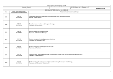 Dane organu prowadzącego rejestr Starosta Gliwicki 1 44-100 Gliwice, ul. Z. Starego nr 17 2 III kwartał 2013r. DECYZJE O POZWOLENIA NA BUDOWĘ Lp. Numer i data wydania decyzji o pozwoleniu na budowę/rozbiórkę 538) 538/13 02-07-2013r. Odtworzenie nawierzchni ciągu pieszo-komunikacyjnego wokół zabytkowego kościoła, Bojszów, ul. Kościelna nr 2 539) 539/13 02-07-2013r. Projekt zamienny – budowa budynku gospodarczego, Pyskowice, ul. Kormoranów 540) 540/13 02-07-2013r. Budowa wewnętrznej instalacji gazowej, Pyskowice, ul. Kazimierza Wielkiego 541) 541/13 02-07-2013r. Budowa wewnętrznej instalacji gazowej w mieszkaniu, Pyskowice, ul. Traugutta nr 26/2 542) 542/13 02-07-2013r. Budowa wewnętrznej instalacji gazowej w budynku, Pyskowice, ul. Piaskowa 543) 543/13 02-07-2013r. Rozbiórka części budynku gospodarczego oraz wykonanie nowego tarasu nad pomieszczeniem gospodarczym, Dąbrówka, ul. Kościelna nr 21 544) 544/13 02-07-2013r. Przebudowa budynku polegająca na zmianie kąta dachu budynku usługowo-mieszkalnego, Pyskowice, ul. Powstańców Śląskich nr 12 Rodzaj i adres zamierzenia budowlanego 1 Dane organu prowadzącego rejestr Starosta Gliwicki 1 44-100 Gliwice, ul. Z. Starego nr 17 2 III kwartał 2013r. DECYZJE O POZWOLENIA NA BUDOWĘ Lp. Numer i data wydania decyzji o pozwoleniu na budowę/rozbiórkę 545) 545/13 03-07-2013r. Wymiana okien w kościele, Stanica, ul. Gliwicka nr 16 546) 546/13 03-07-2013r. Budowa budynku jednorodzinnego mieszkalnego i budynku gospodarczo- garazowego, Stanica, ul. Św. Marcina 547) 547/13 03-07-2013r. Rozbudowa budynku mieszkalnego jednorodzinnego, Czarków, ul. Wiejska 548) 548/13 03-07-2013r. Przebudowa, rozbudowa oraz częściowa rozbiórka budynku mieszkalnego, Dąbrówka, ul. Główna 549) 549/13 04-07-2013r. Prace remontowo – konserwatorskie polegające na wzmocnieniu i izolacji fundamentów oraz wymianie wybranych drewnianych elementów konstrukcji ścian i dachu kościoła, Sieroty, ul. Kościelna 550) 550/13 05-07-2013r. Budowa budynku wiaty, Sieroty, ul. Słoneczna 551) 551/13 05-07-2013r. Budowa domu jednorodzinnego z poddaszem użytkowym i wbudowanym garażem, Knurów, ul. Bojowa Rodzaj i adres zamierzenia budowlanego 2 Dane organu prowadzącego rejestr Starosta Gliwicki 1 44-100 Gliwice, ul. Z. Starego nr 17 2 III kwartał 2013r. DECYZJE O POZWOLENIA NA BUDOWĘ Lp. Numer i data wydania decyzji o pozwoleniu na budowę/rozbiórkę 552) 552/13 08-07-2013r. Budowa budynku biurowego i gospodarczego wraz z osadnikiem ścieków, Przyszowice, ul. Gliwicka 553) 553/13 08-07-2013r. Profilaktyczne zabezpieczenie budynku mieszkalnego na wpływ projektowanej eksploatacji górniczej – kotwienie budynku, Gierałtowice, ul. K. Miarki nr 67. 554) 554/13 08-07-2013r. Rozbudowa sieci gazowej z budową przyłącza gazu do budynku jednorodzinnego, Przyszowice, ul. Południowa 555) 555/13 08-07-2013r. Budowa wewnętrznej instalacji gazowej od kurka głównego do budynku mieszkalnego, Chudów, ul. Szkolna 556) 556/13 08-07-2013r. Budowa domu jednorodzinnego, Toszek, ul. Marii Konopnickiej 557) 557/13 08-07-2013r. Wymiana stacji transformatorowej P80 wraz z przebudową linii napowietrznych SN i nN oraz wyburzenie budynku wiezowej stacji transformatorowej, Kotulin, ul. Wiejska 558) 558/13 08-07-2013r. Nadbudowa i przebudowa budynku mieszkalnego jednorodzinnego wraz z ociepleniem ścian zewnętrznych budynku, Kotulin, ul. Kolejowa nr 36 Rodzaj i adres zamierzenia budowlanego 3 Dane organu prowadzącego rejestr Starosta Gliwicki 1 44-100 Gliwice, ul. Z. Starego nr 17 2 III kwartał 2013r. DECYZJE O POZWOLENIA NA BUDOWĘ Lp. Numer i data wydania decyzji o pozwoleniu na budowę/rozbiórkę 559) 559/13 08-07-2013r. 560) 560/13 08-07-2013r. Budowa wewnętrznej instalacji gazu w budynku mieszkalnym jednorodzinnego, Nieborowice, ul. Sosnowa 561) 561/13 08-07-2013r. Budowa wewnętrznej instalacji gazowej, Toszek, ul. Wielowiejska nr 13 562) 562/13 09-07-2013r. Rozbudowa budynku świetlicy wiejskiej, Kotulin, ul. Świbska nr 5 563) 563/13 09-07-2013r. Dostosowanie pomieszczeń szpitala do wymagań pracowni tomografii komputerowej, Knurów, ul. Niepodległości nr 8 564) 564/13 10-07-2013r. Budowa budynku mieszkalnego jednorodzinnego z wbudowanym garażem, osadnikiem ścieków oraz wewnętrzną instalacją gazową, Chudów, ul. Szkolna 565) 565/13 10-07-2013r. Aktualizacja projektu dostosowania szpitala do aktualnych wymogów przeciwpożarowych, Pilchowice, ul. Dworcowa nr 31 Rodzaj i adres zamierzenia budowlanego Rozbiórka budynku mieszkalnego i garażowo – gospodarczego, Gierałtowice, ul. Ks. Roboty nr 148 4 Dane organu prowadzącego rejestr Starosta Gliwicki 1 44-100 Gliwice, ul. Z. Starego nr 17 2 III kwartał 2013r. DECYZJE O POZWOLENIA NA BUDOWĘ Lp. Numer i data wydania decyzji o pozwoleniu na budowę/rozbiórkę 566) 566/13 10-07-2013r. Budowa budynku mieszkalnego, jednorodzinnego, wolnostojącego, niepodpiwniczonego „Doskonały D, kąt 30 – Lustro”, Rachowice, ul. Pogodna 567) 567/13 10-07-2013r. Wymiana dachu, powiększenie balkonu i termodernizacja budynku mieszkalnego jednorodzinnego, Łany Wielkie, ul. Łabędzka nr 14 568) 568/13 10-07-2013r. Projekt zamienny - budowa kanalizacji sanitarnej, Gierałtowice, rejon ulic Gierałtowickiej i Południowej 569) 569/13 11-07-2013r. Projekt zamienny - budowa kanalizacji sanitarnej, Przyszowice, ul. Gliwicka i Leśna 570) 670/13 11-07-2013r. Budowa sieci wodociągowej i kanalizacji sanitarnej dla centrum dystrybucyjnego Rossmann, Pyskowice, ul. Poznańska 571) 571/13 11-07-2013r. Budowa budynku mieszkalnego jednorodzinnego z wbudowanym garażem i osadnikiem ścieków, Pisarzowice, ul. Wiejska 572) 572/13 11-07-2013r. Budowa centrum dystrybucyjnego Rossmann, Pyskowice, ul. Poznańska Rodzaj i adres zamierzenia budowlanego 5 Dane organu prowadzącego rejestr Starosta Gliwicki 1 44-100 Gliwice, ul. Z. Starego nr 17 2 III kwartał 2013r. DECYZJE O POZWOLENIA NA BUDOWĘ Lp. Numer i data wydania decy