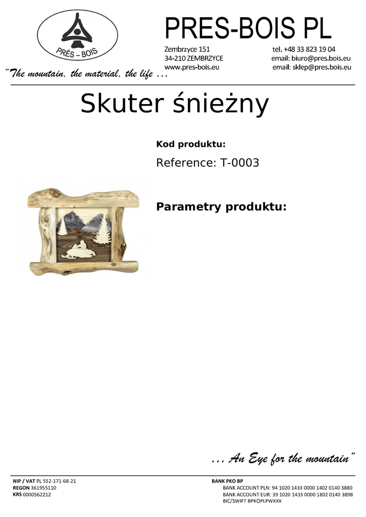 PRES-BOIS PL “The mountain, the material, the life … Skuter śnieżny Kod produktu: Reference: T-0003 Parametry produktu: … An Eye for the mountain” NIP / VAT * REGON * KRS * Powered by TCPDF (www.tcpdf.org) BANK PKO BP