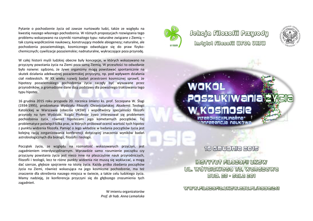 Pytanie o pochodzenie życia od zawsze nurtowało ludzi, także ze względu na kwestię naszego własnego pochodzenia. W różnych propozycjach rozwiązania tego problemu wskazywano na czynniki rozmaitego typu: naturalne związane z Ziemią – tak czynią współcześnie naukowcy, konstruujący modele abiogenezy; naturalne, ale pochodzenia pozaziemskiego, kosmicznego odwołujące się do praw fizykochemicznych; cywilizacje pozaziemskie; nadnaturalne, wykraczające poza przyrodę. W całej historii myśli ludzkiej obecne były koncepcje, w których wskazywano na przyczyny powstania życia na Ziemi poza samą Ziemią. W przeszłości to odwołanie było naiwne: sądzono, że żywe organizmy mogą powstawać spontanicznie na skutek działania adekwatnej pozaziemskiej przyczyny, np. pod wpływem działania ciał niebieskich. W XX wieku rozwój badań przestrzeni kosmicznej sprawił, że hipotezy pozaziemskiego pochodzenia życia zaczęły być wysuwane przez przyrodników, a gromadzone dane dają podstawy dla poważnego traktowania tego typu hipotez. 16 grudnia 2015 roku przypada 20. rocznica śmierci ks. prof. Szczepana W. Ślagi (1934-1995), prodziekana Wydziału Filozofii Chrześcijańskiej Akademii Teologii Katolickiej w Warszawie (obecnie UKSW) i współtwórcy specjalności filozofii przyrody na tym Wydziale. Ksiądz Profesor żywo interesował się problemem pochodzenia życia, również hipotezami jego kometarnych początków. Tej problematyce poświęcił kilka prac, w których próbował ocenić wartość tych hipotez z punktu widzenia filozofa. Pamięć o Jego wkładzie w badania początków życia jest kolejną racją zorganizowania konferencji dotyczącej znaczenia wyników badań astrobiologicznych dla biologii, filozofii i teologii. Początek życia, ze względu na rozmaitość wskazywanych przyczyn, jest zagadnieniem interdyscyplinarnym. Wprawdzie samo rozumienie początku czy przyczyny powstania życia jest nieco inne na płaszczyźnie nauk przyrodniczych, filozofii i teologii, lecz te różne punkty widzenia nie muszą się wykluczać, a mogą dać szersze, głębsze spojrzenie na istotę życia. Każda próba zbadania początków życia na Ziemi, również wskazująca na jego kosmiczne pochodzenie, ma też znaczenie dla określenia naszego miejsca w świecie, a także celu ludzkiego życia. Mamy nadzieję, że konferencja przyczyni się do głębszego zrozumienia tych zagadnień. W imieniu organizatorów Prof. dr hab. Anna Lemańska PROGRAM KONFERENCJI 09.30 – rozpoczęcie konferencji – wprowadzenie w tematykę konferencji (prof. dr hab. Anna Latawiec) Sesja 1 09:45 prof. dr hab. Ewa Szuszkiewicz (Polskie Centrum Astrobiologii CASA Wydział Matematyczno-Fizyczny, Uniwersytet Szczeciński) Nasze miejsce we Wszechświecie: kim jesteśmy i dokąd zmierzamy 10:15 prof. dr hab. Jan F. Terelak (Instytut Psychologii UKSW w Warszawie Komitet Badań Kosmicznych i Satelitarnych PAN) Miejsce człowieka w Kosmosie: dane empiryczne i perspektywa astronautyczna 10:45 dr Jacek Poznański (Akademia „Ignatianum”, Kraków) Ziemska nauka a możliwości komunikacji z cywilizacją pozaziemską: C. Sagan, N. Rescher, A. Kukla 11:15 – przerwa Sesja 2 11:30 dr hab. Adam Świeżyński (Instytut Filozofii UKSW w Warszawie) Od idei samorództwa do teorii abiogenezy kosmicznej. Analiza poglądów na temat powstania życia w kontekście idei kosmicznego pochodzenia życia 12:00 dr hab. Wiesław Dyk (Wydział Teologiczny, Uniwersytet Szczeciński) Świat tioestrów. Rola tioestrów w procesie genezy życia 12:30 dr Andrzej Zykubek (Katedra Filozofii Nauk Przyrodniczych, KUL JPII) Astrohydrobiologia 13:00 dr Jerzy Rąpała (Wyższe Seminarium Duchowne Zakonu Braci Mniejszych we Wronkach – Sekcja Wydziału Teologicznego UAM w Poznaniu) „Hipoteza podobieństwa” a poszukiwanie życia w kosmosie. Próba analizy krytycznej 13:30 – przerwa Sesja 3 13:45 dr hab. Grzegorz Bugajak (Instytut Filozofii UKSW w Warszawie) Kosmiczne początki życia w świetle hipotezy niedookreśloności celu stworzenia 14:15 dr hab. Jacek Rodzeń (Uniwersytet Jana Kochanowskiego, Kielce) „Mieszkańcy gwiazd” według Karla Rahnera 14:45 mgr Jurata Bogna Serafińska Starożytne podróże gwiezdne 15:15 dr Jacek Sobota (Instytut Filozofii UWM, Olsztyn) Literackie wizje życia rozumnego w kosmosie i ich konsekwencje metafizyczne, epistemologiczne i aksjologiczne 15:45 – podsumowanie konferencji (prof. dr hab. Anna Lemańska) 16:00 – zakończenie konferencji
